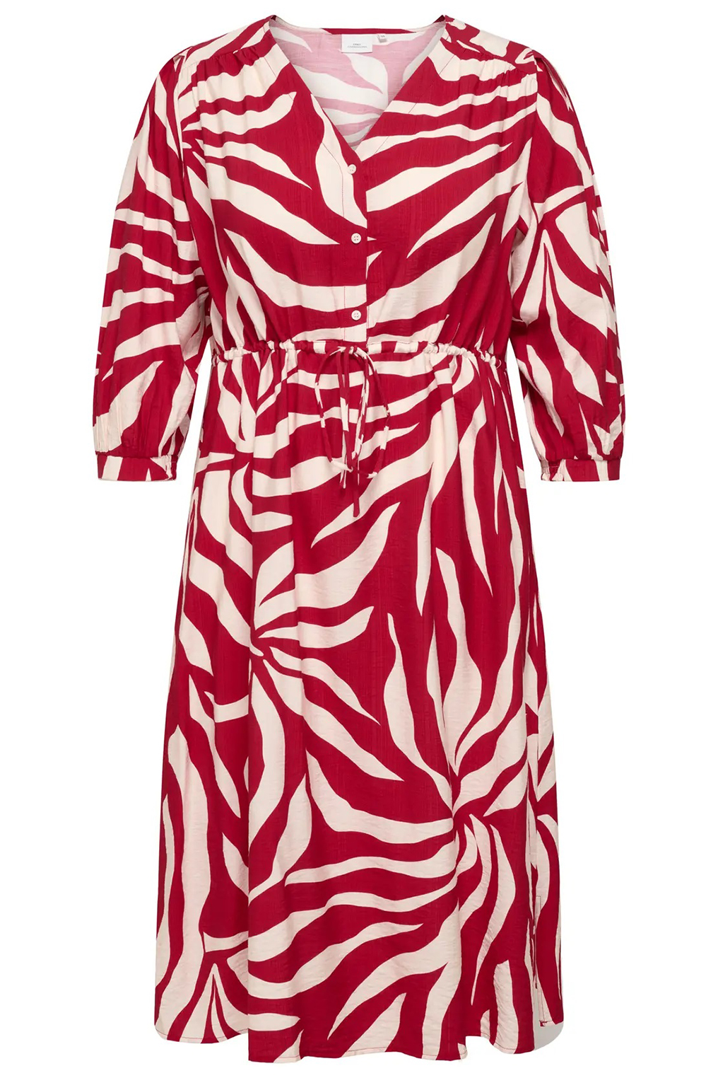 De Only Carmakoma jurk met zebraprint rood/crème van ONLY CARMAKOMA is een echte blikvanger binnen de collectie grote maten kleding. Deze plus size jurk heeft een v-hals, 3/4 mouwen met elastische boorden en een strikceintuur in de taille. De geplooide details en de soepele pasvorm zorgen voor een vrouwelijk silhouet. De lengte valt tot over de knie, wat deze jurk geschikt maakt voor werk, een dagje uit of een etentje.
