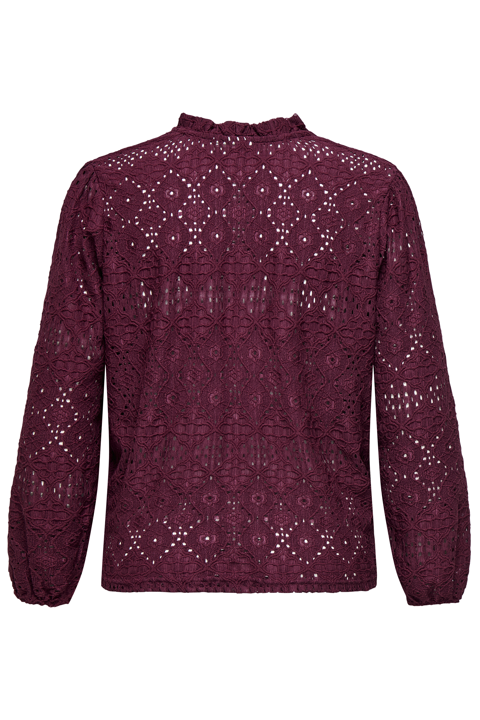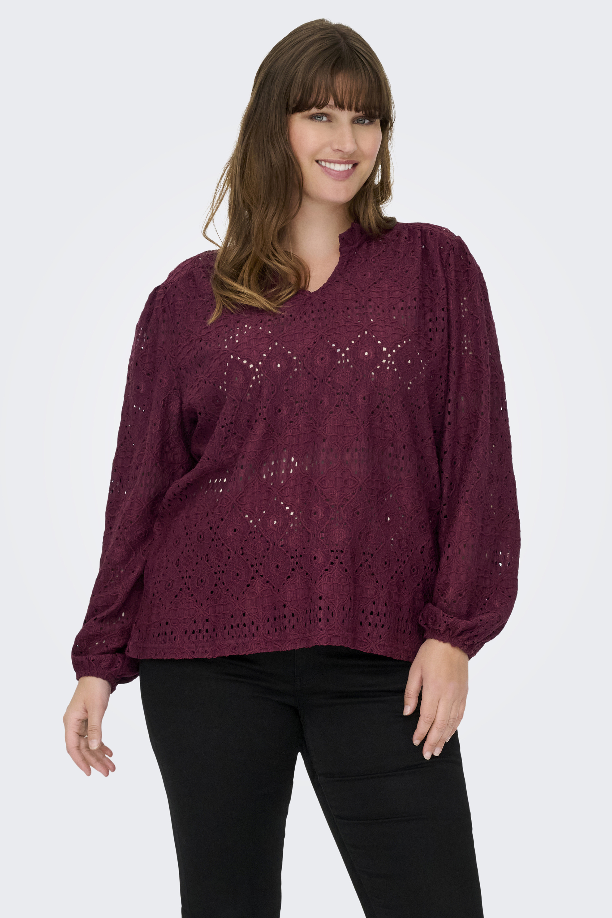 Prachtige blouse van Only Carmakoma in zwart en wijnkleur. De zachte stof is een opengewerkte stof met een mooi patroontje. Zeer geschikt voor de feestdagen met een mooie pantalon of jeans. Een mooie V-hals en een roezelrandje langs de hals. Een paar kleine plooitjes op de kop van de mooi zorgt voor een klein pof effect. Elastiek als zoom van de mouw.