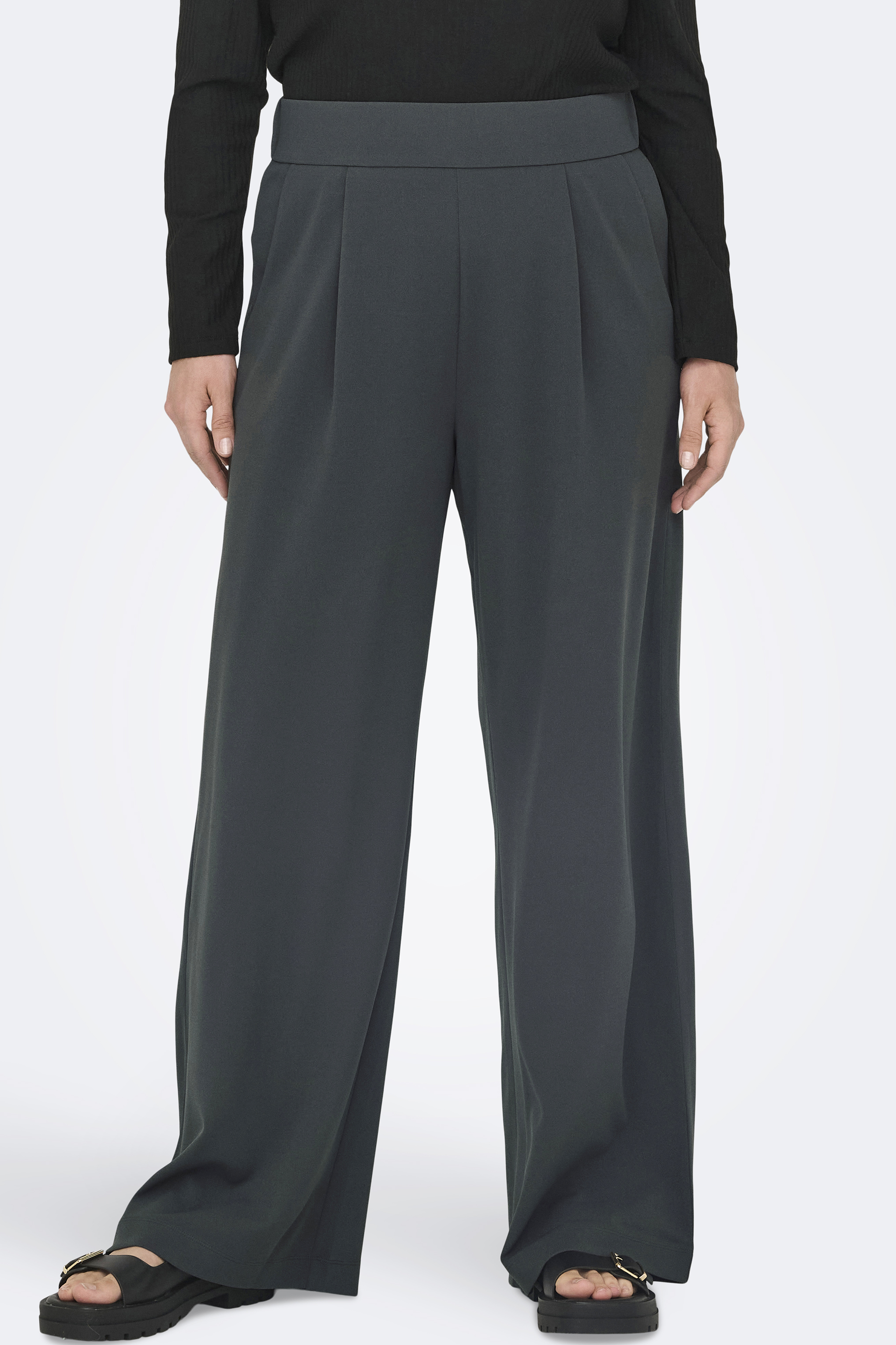 Deze zwarte ECO broek van ONLY is vervaardigd uit een stof met stretch voor optimale bewegingsvrijheid en comfort. Het model heeft een hoge taille met plooien, wat zorgt voor een comfortabele en elegante pasvorm. De broek is voorzien van twee zakken aan de voorkant voor functioneel gebruik. De pijpen zijn wijdvallend en bieden een losse, vloeiende uitstraling. De stof is soepel en draagt prettig, geschikt voor zowel zakelijke als casual settings.