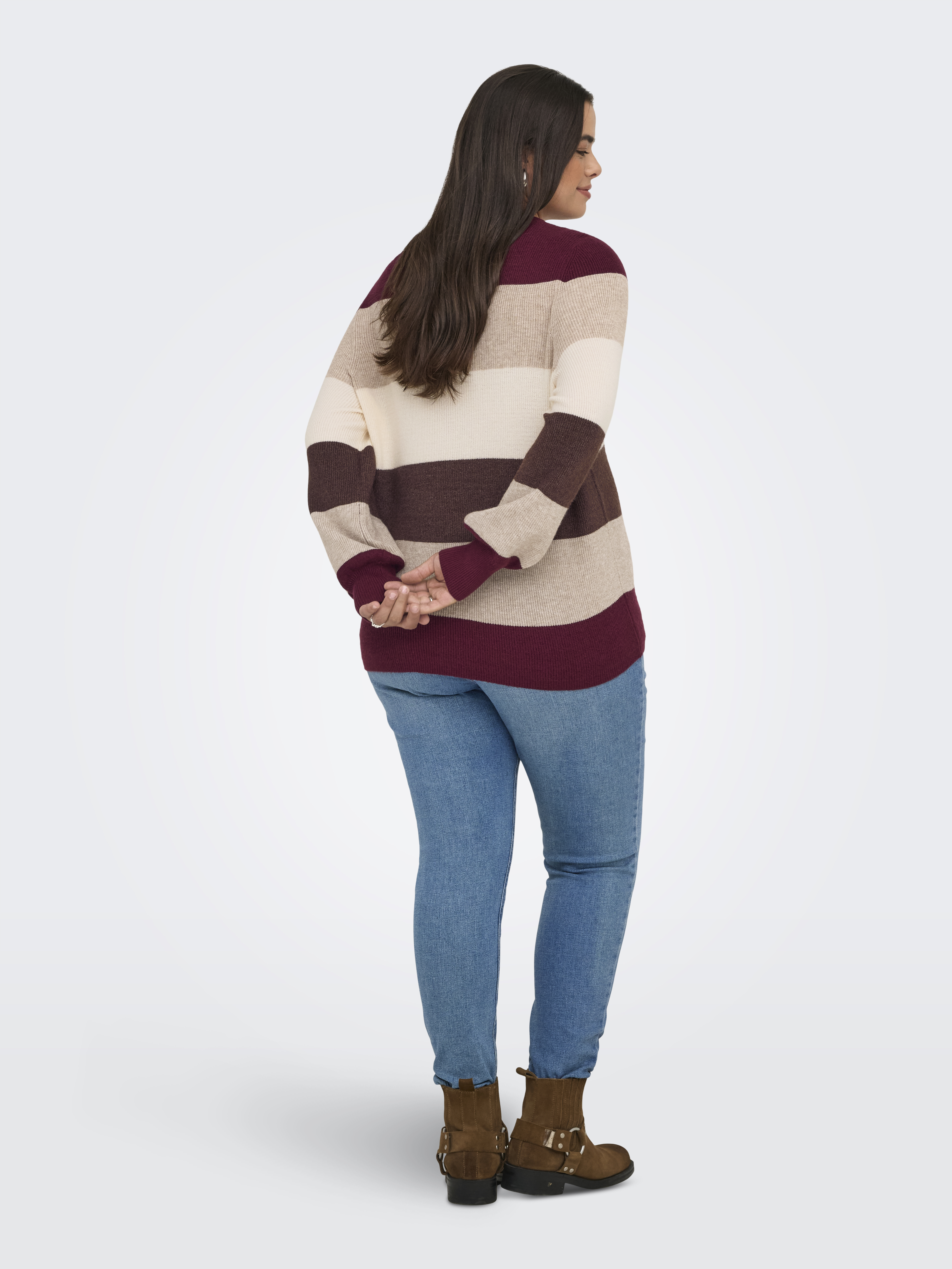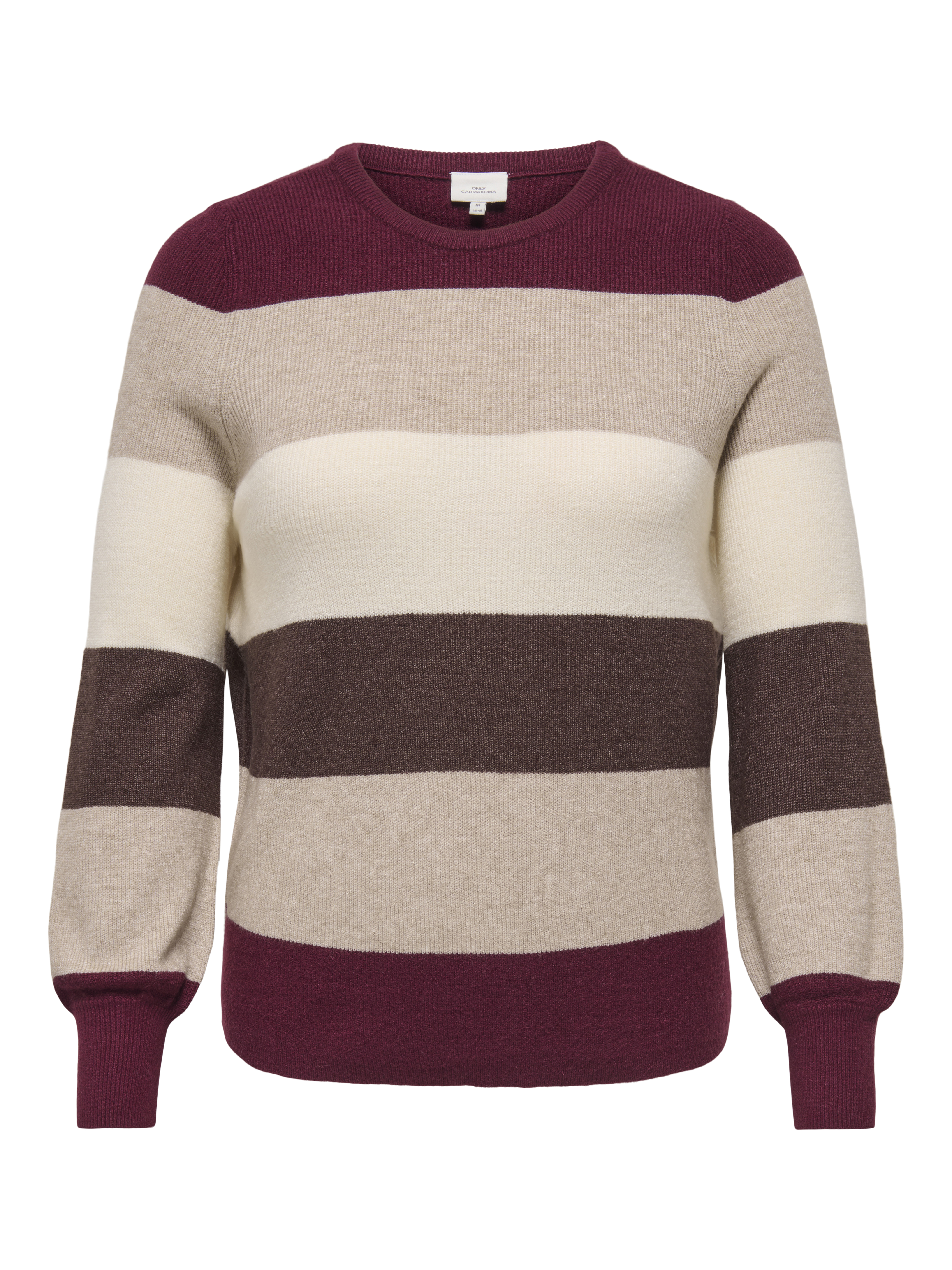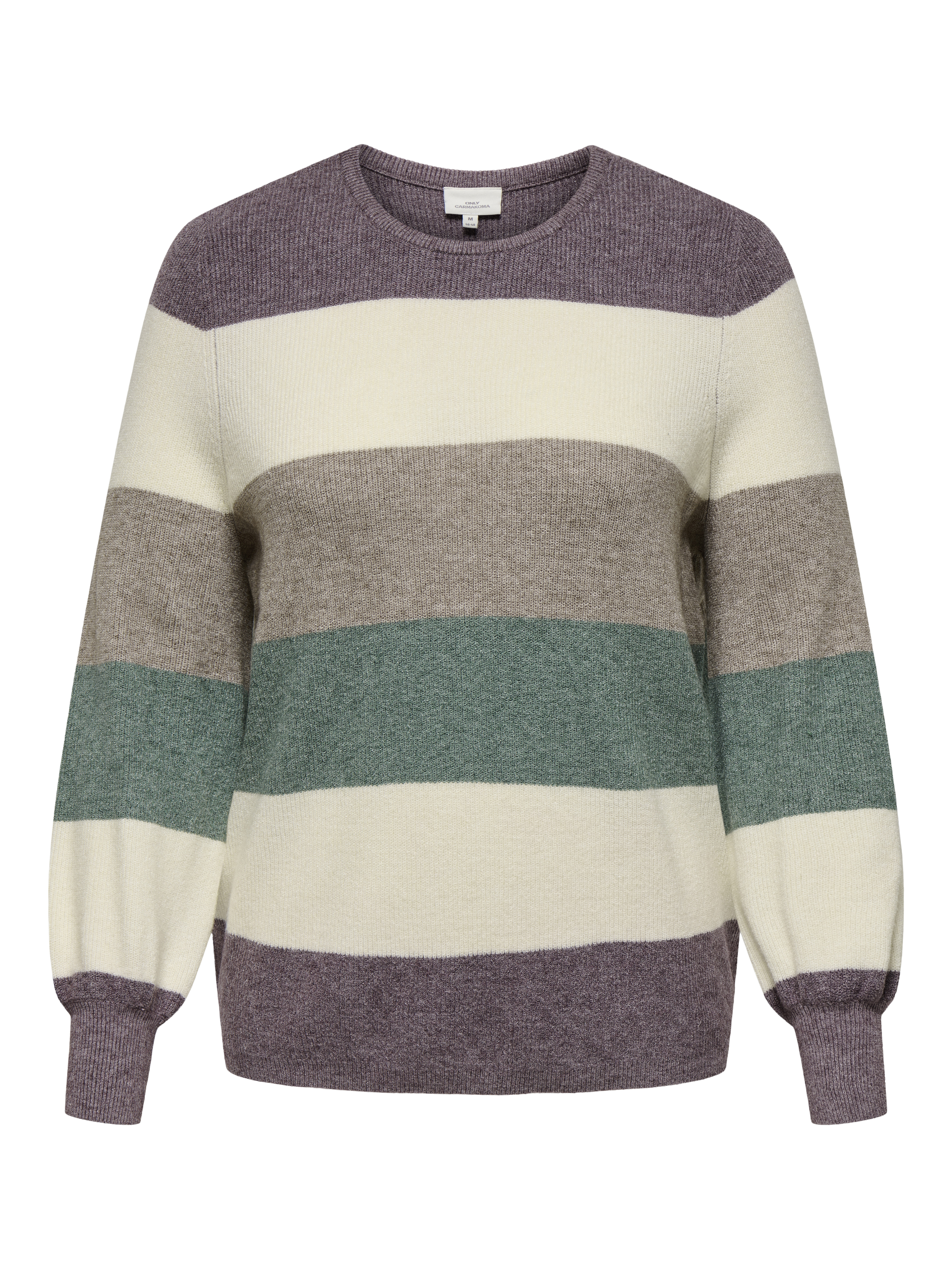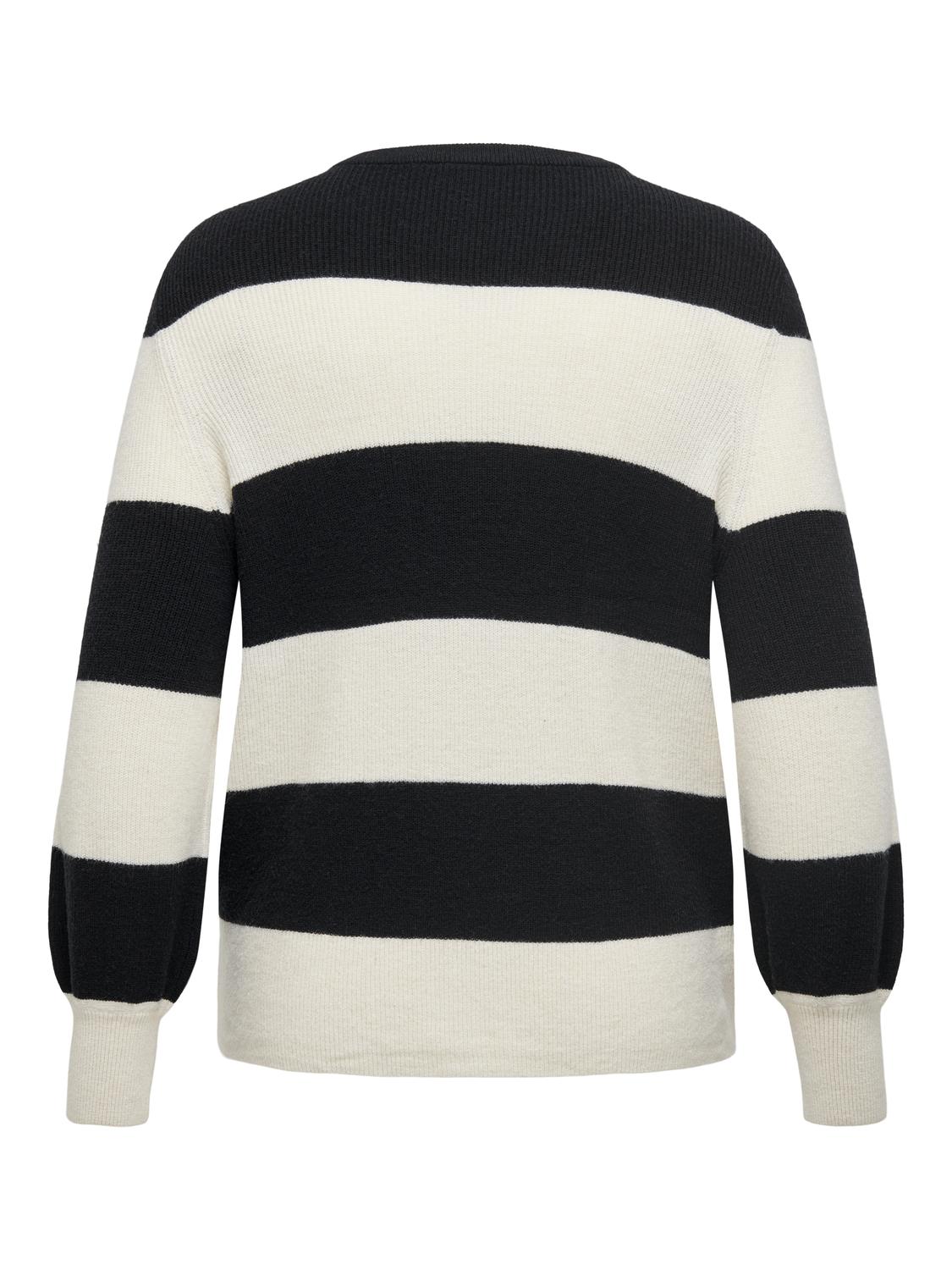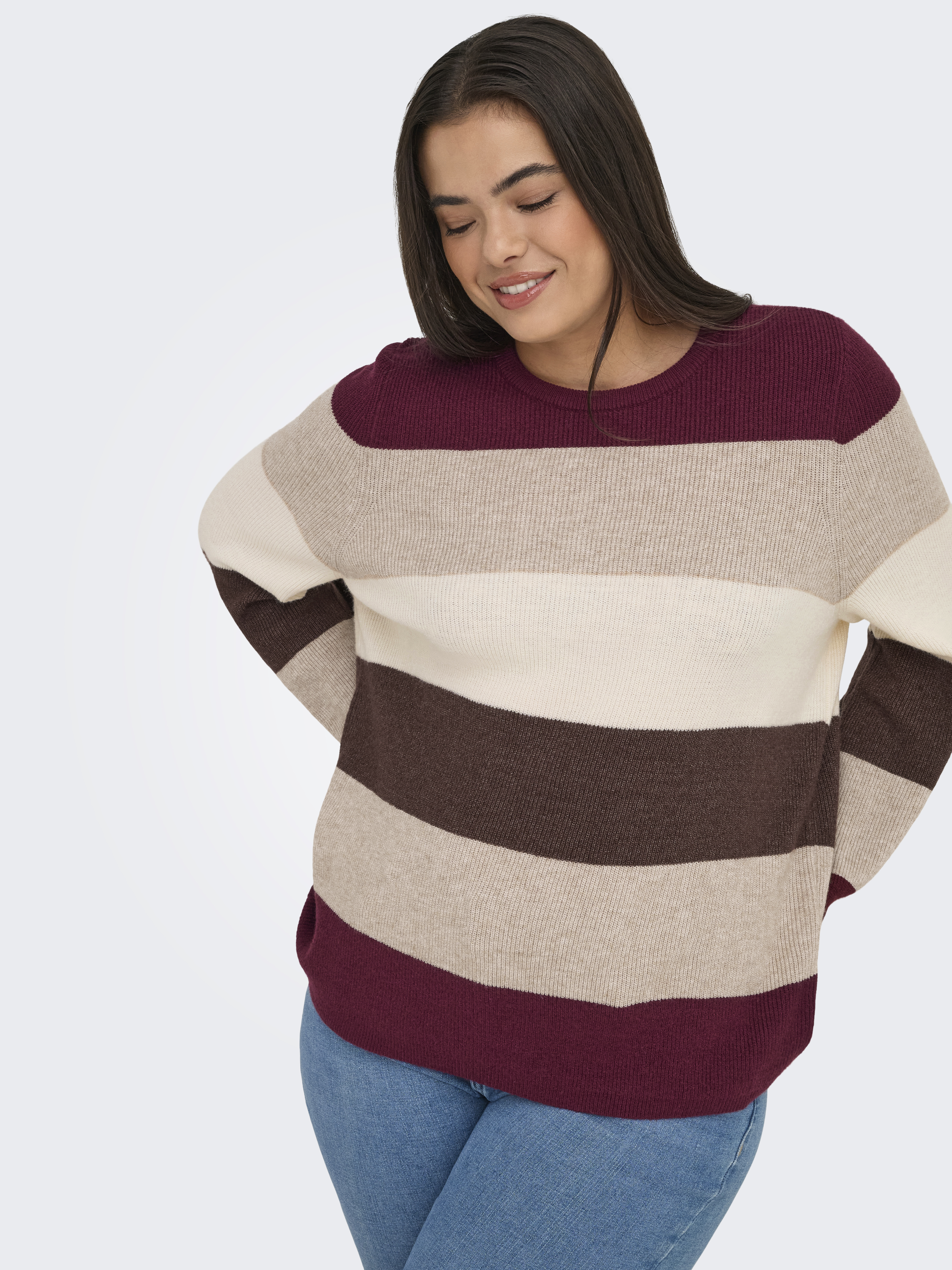 Deze trui van ONLY Carmakoma is een stijlvolle en comfortabele keuze, ontworpen met een strak, modern kleurblokpatroon. Het ontwerp bestaat uit brede horizontale strepen. Naast de huidige stijl, zijn er ook twee andere kleurencombinaties beschikbaar. De trui heeft een ronde halslijn en lange mouwen met elastische boorden die de casual, sportieve uitstraling benadrukken. De gebreide stof heeft een zachte textuur die zorgt voor een aangename draagervaring, terwijl de losse pasvorm een comfortabele fit biedt.