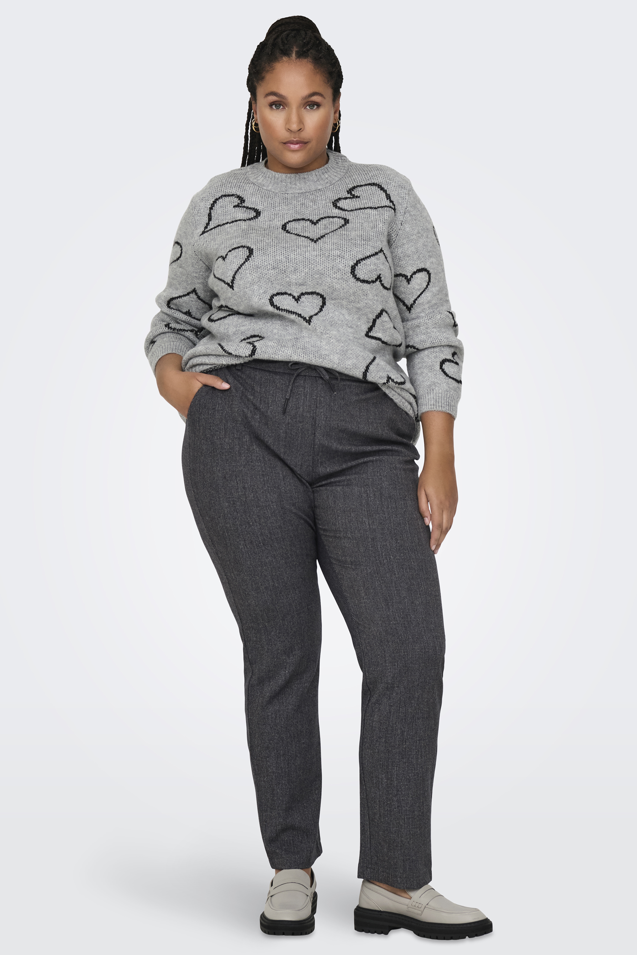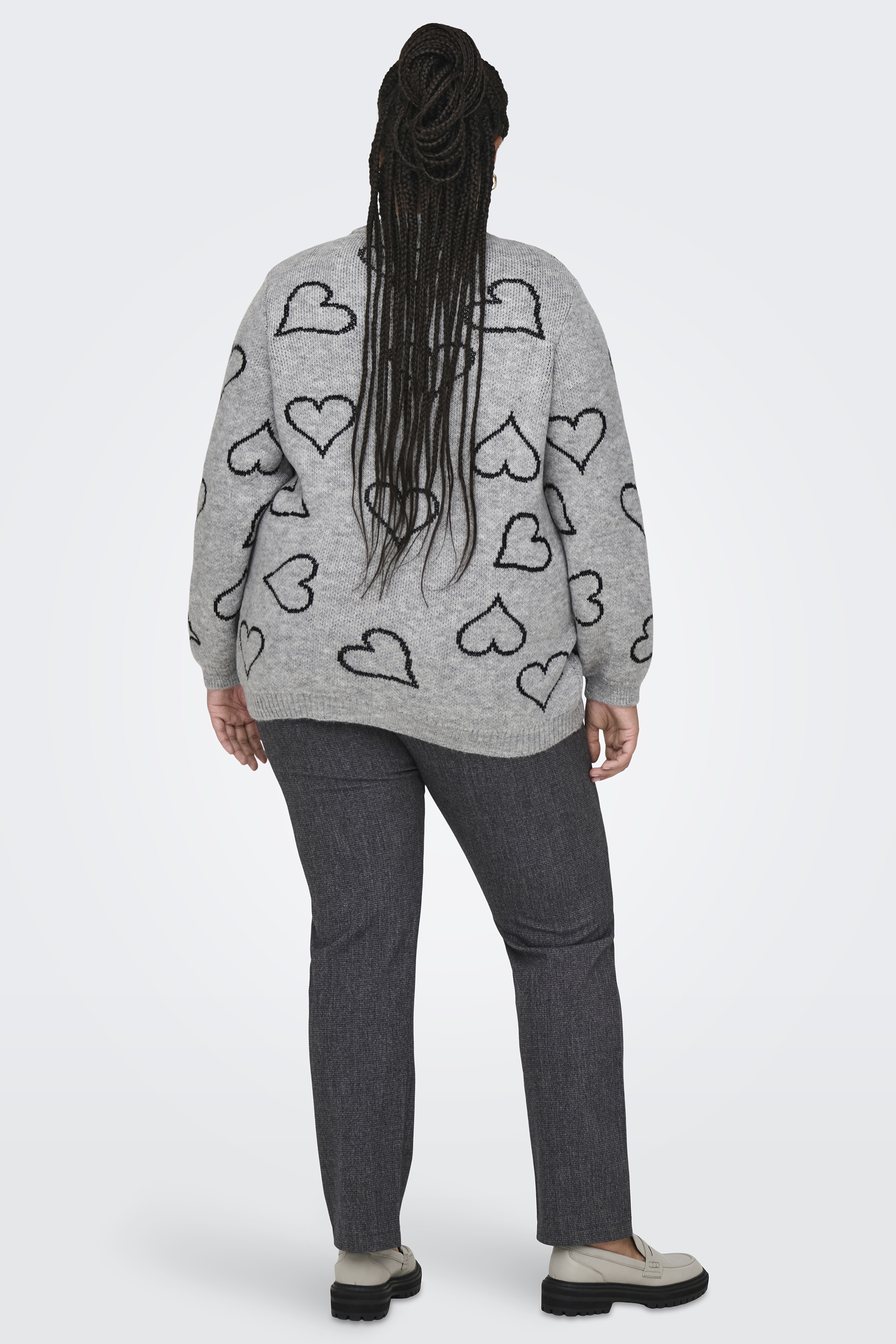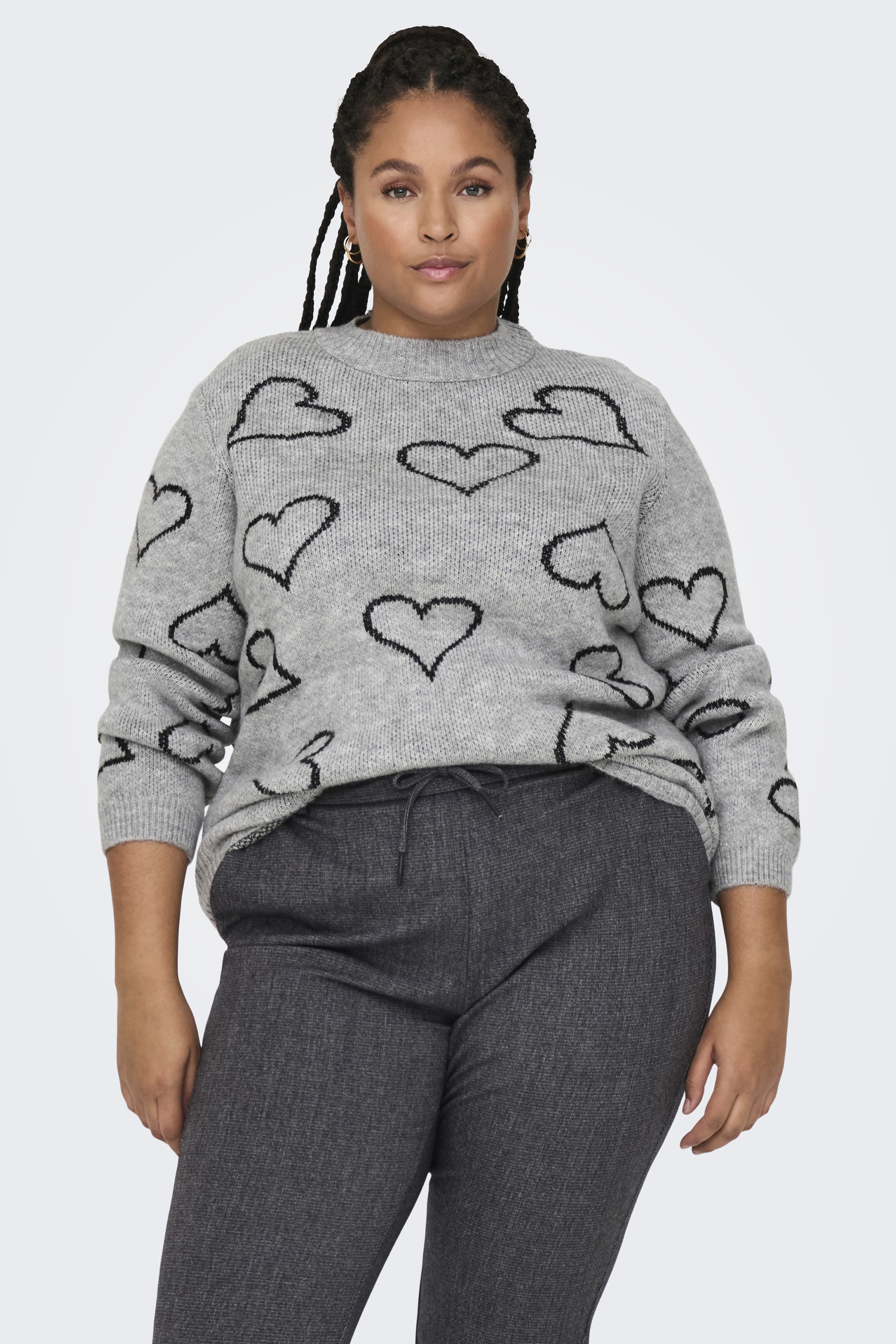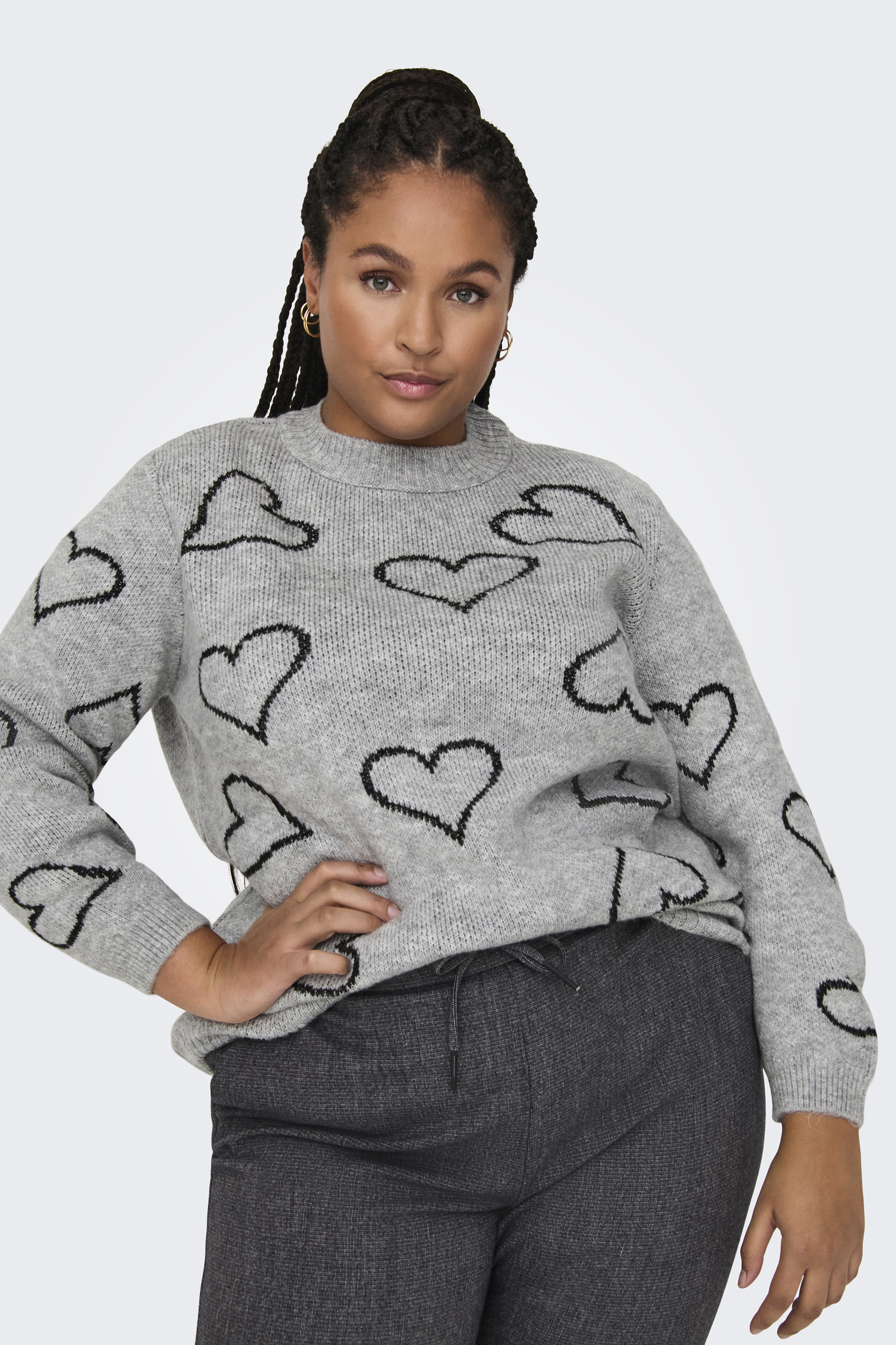 ONLY Carmakoma trui HAPPIE heeft ingebreide hartjes. Bij de zwarte trui in roze en bij de grijze in zwart. Het is een wat korter vallend model met ronde hals en lange mouwen. Draag hem met een jeans voor de vlotte look of met een mooie zwarte leatherlook broek voor de trendy look. Wil je meer truien zien, klik dan op de link.