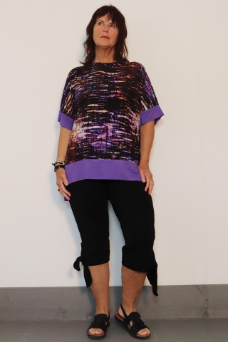 Wat een leuke combinatie heeft Ophilia verwerkt in deze blouse model Lia. Hij heeft een batik look print gecombineerd langs de zoom en in de korte mouwen met een uni paarse stof. De blouse is wat korter aan de voorkant, een vlot effect. Hij heeft een ronde hals.