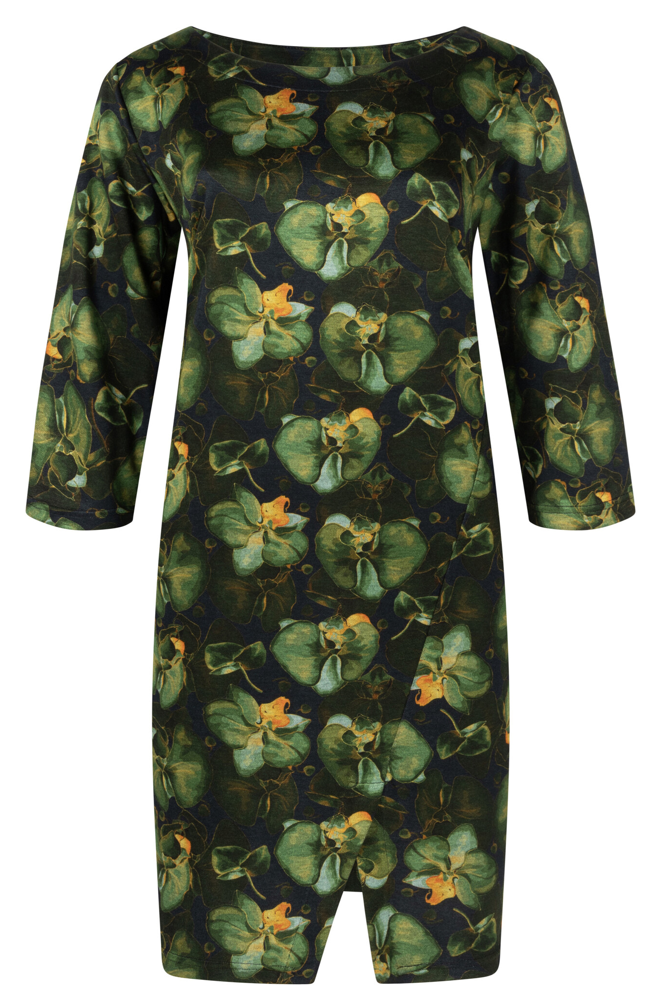 Ophilia jurk Angela print is een knielang model met scheve split bij de zoom. Hij heeft een wat bredere ronde hals en driekwart mouwen. Hij is gemaakt in een heavy jersey.