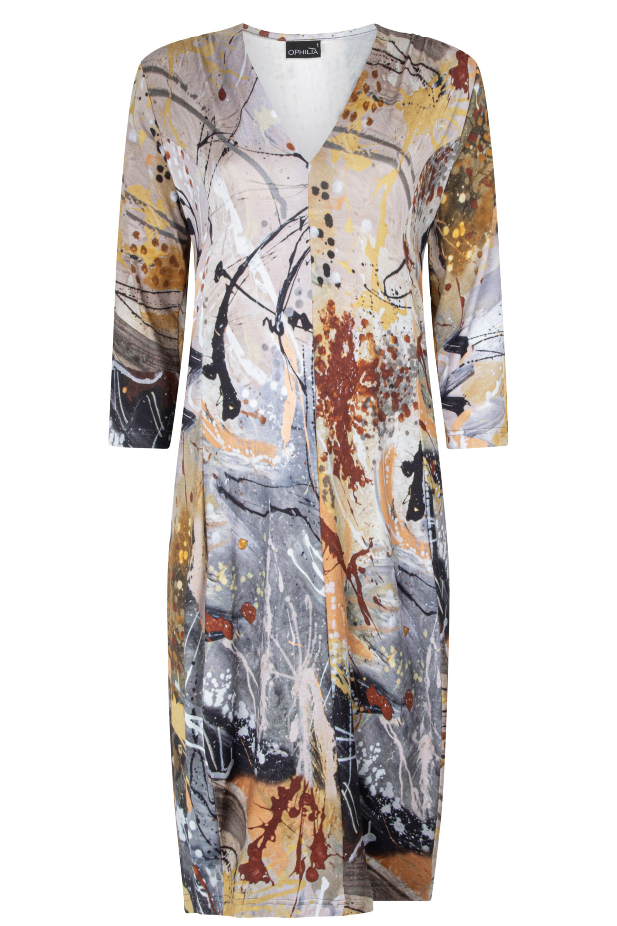 Ophilia jurk Ivy jersey dessin heeft een V hals en driekwart mouwen. De jurk is iets getailleerd aan de bovenkant en heeft een bolling rond de heupen. Hij valt over de knie en in de zijnaad zitten steekzakken.