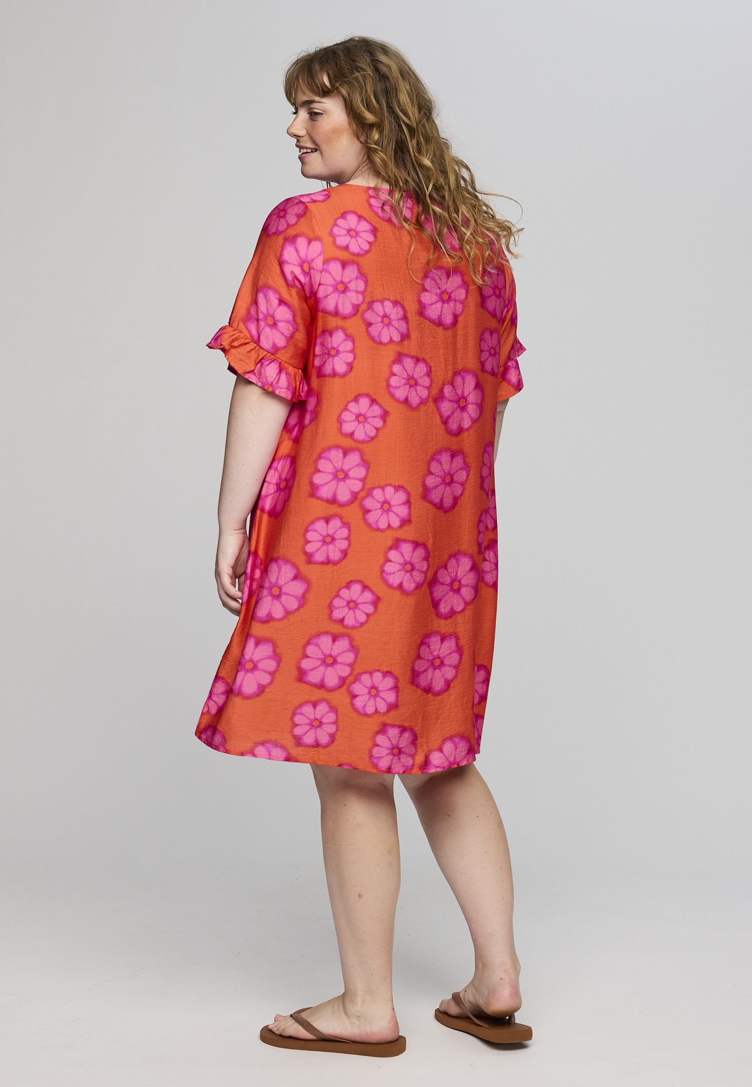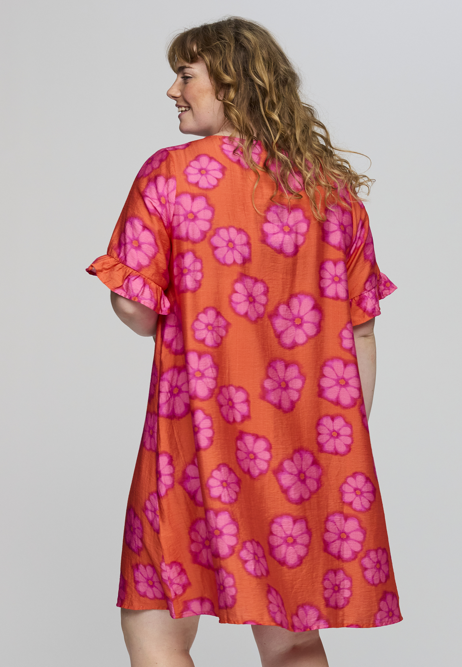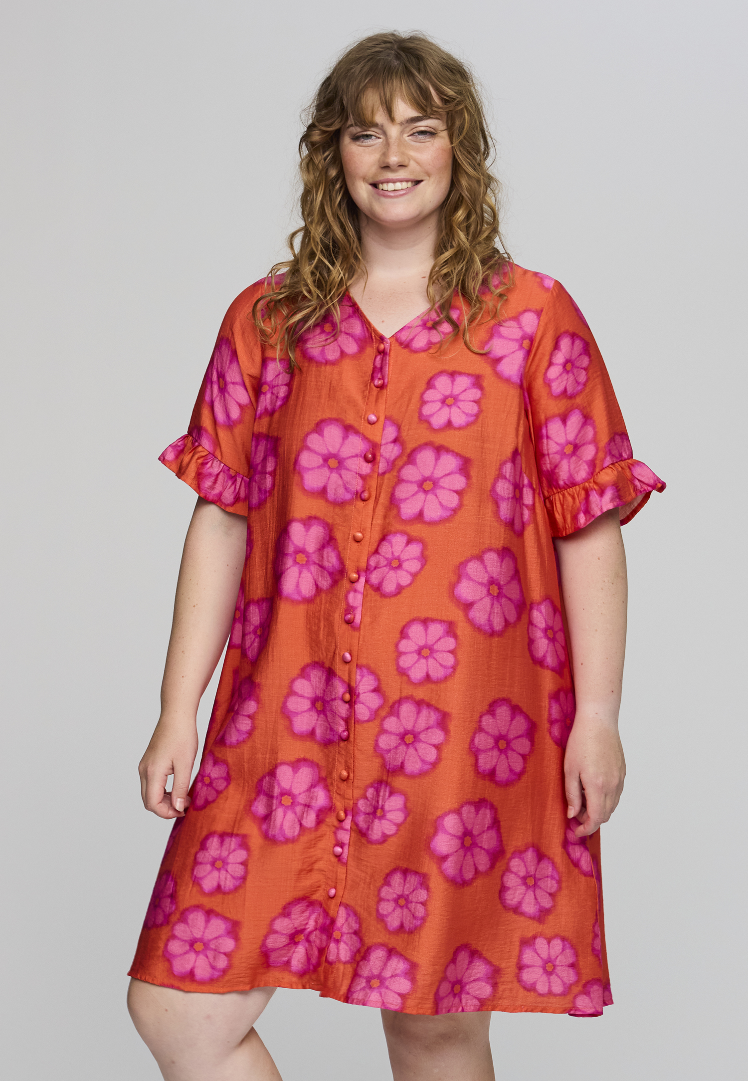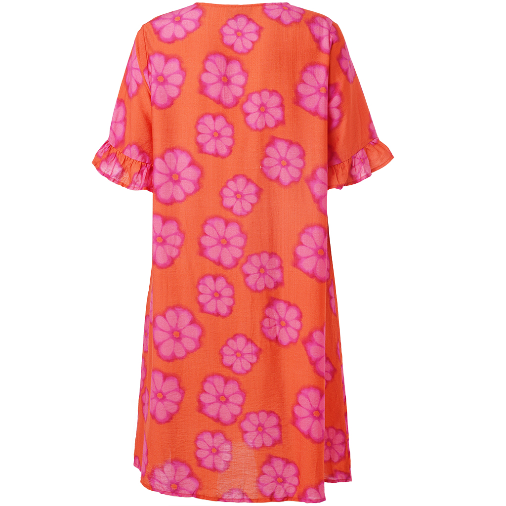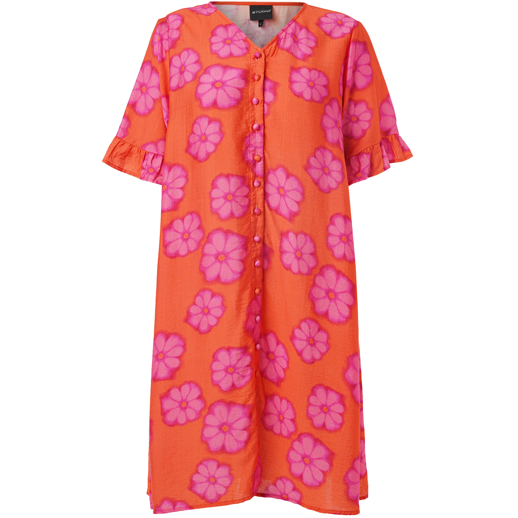 De Ada jurk van het merk Studio is een vrolijke jurk met een oranje basis en een allover roze bloemenprint. De jurk valt soepel langs het lichaam en heeft een lengte over de knie, wat zorgt voor een comfortabele en flatterende pasvorm.