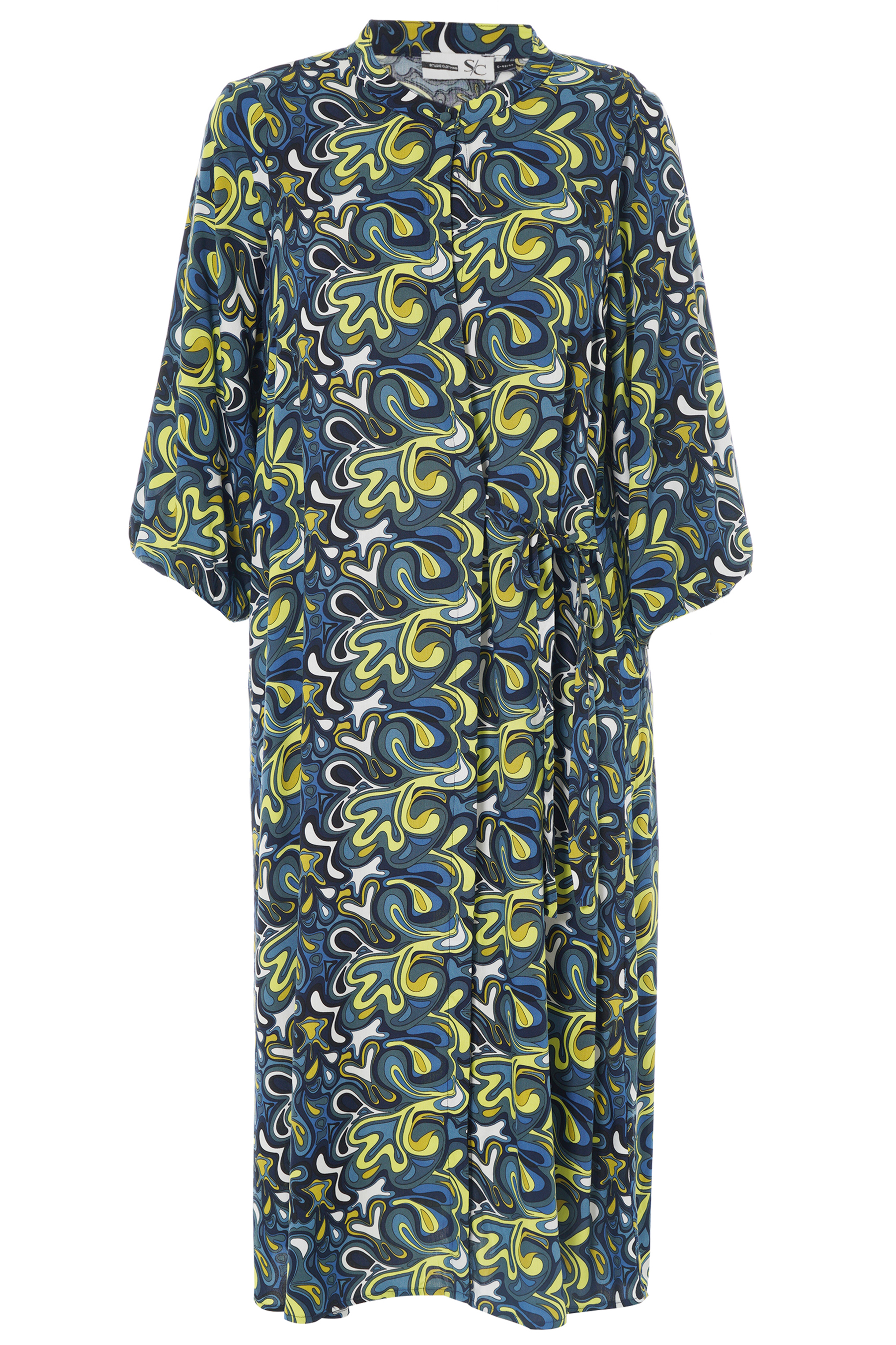 Studio jurk Brianne heeft een mooie print in een fijne viscose stof. De jurk heeft een blinde knoopsluiting en een klein boordje bij de hals. In de taille zit aan 1 kant een striksluting, deze loopt van middenvoor naar de strik in de zijnaad. De driekwart mouwen hebben elastiek in de zoom. Combineer hierbij evt een panty van Cette.