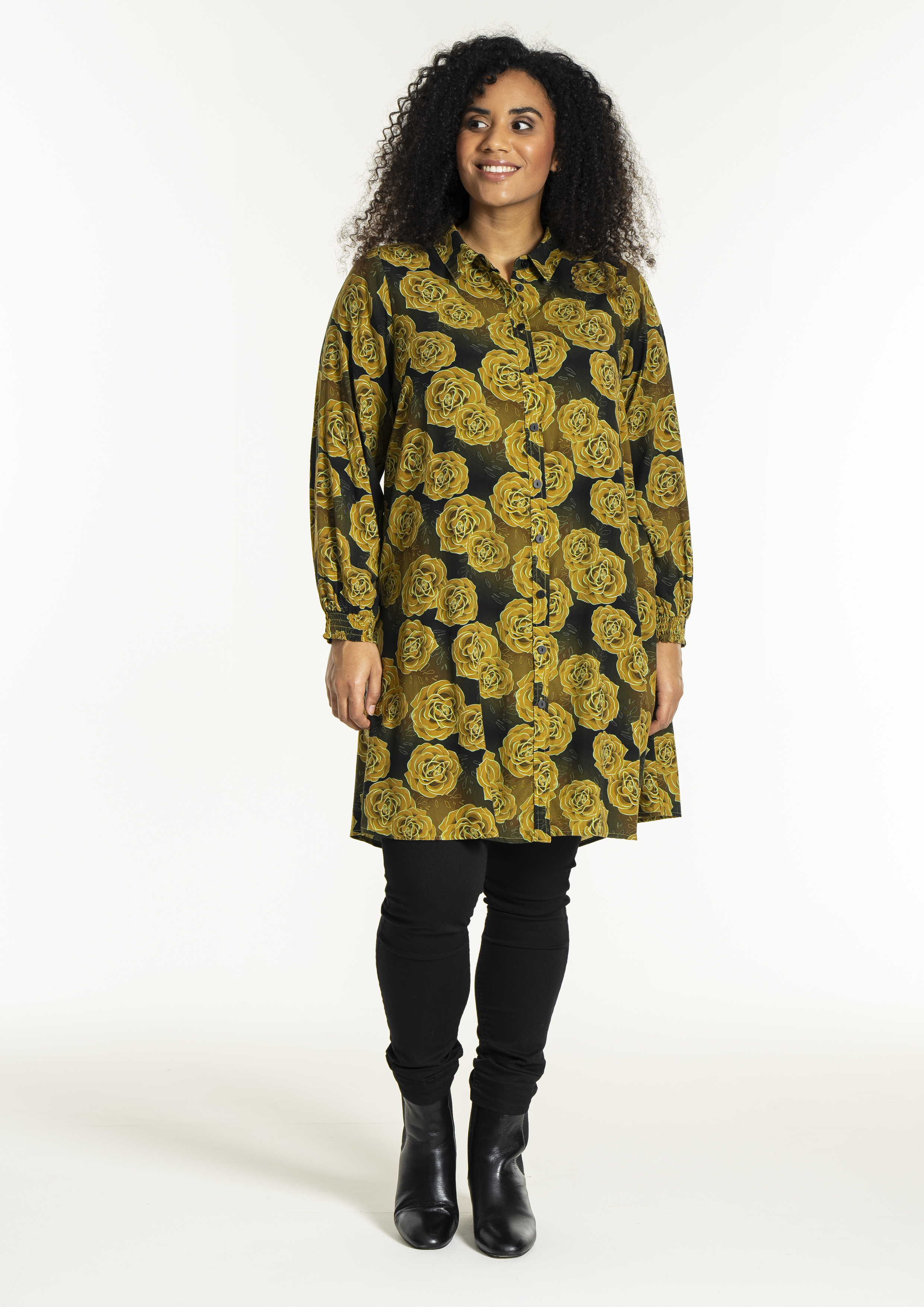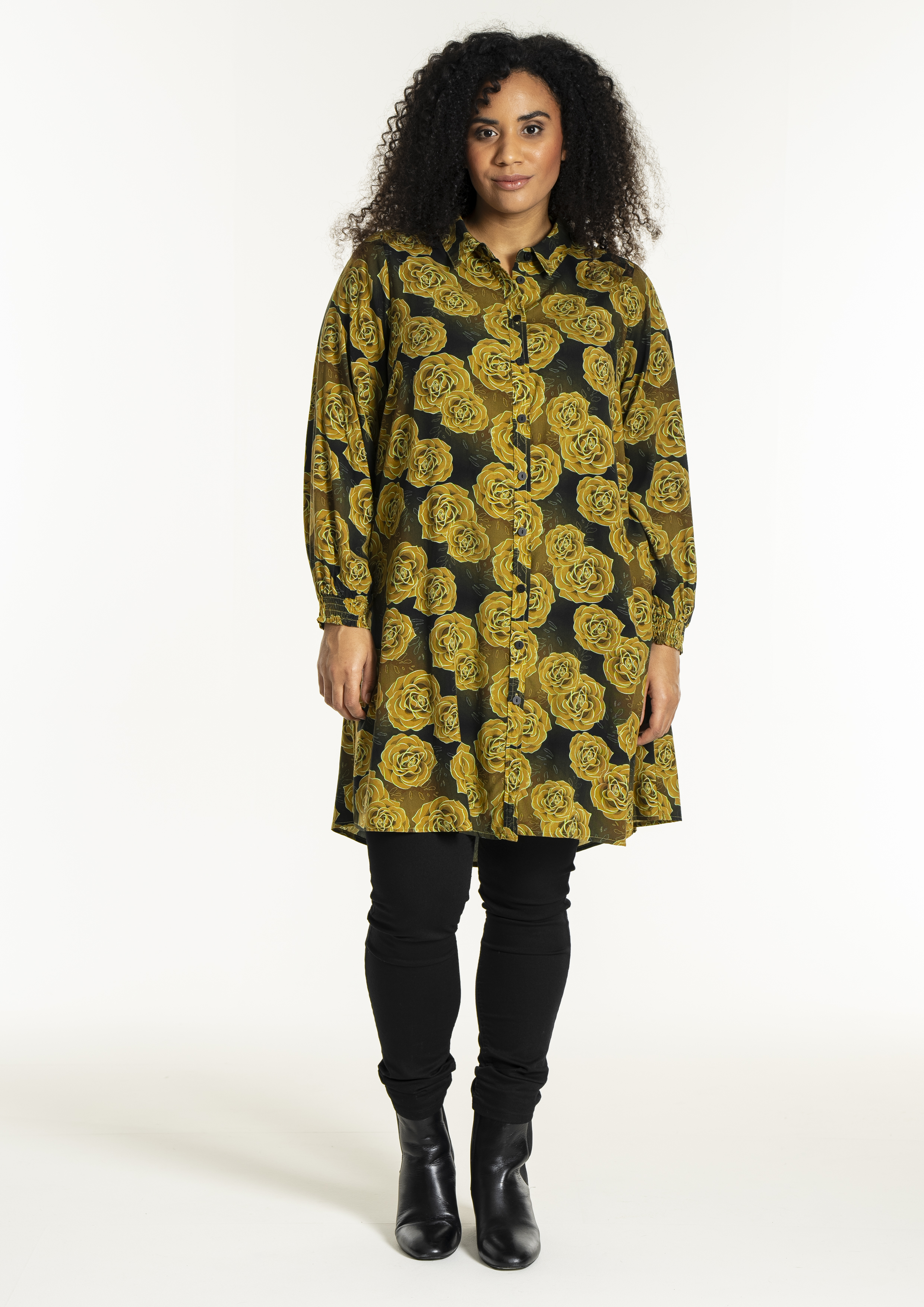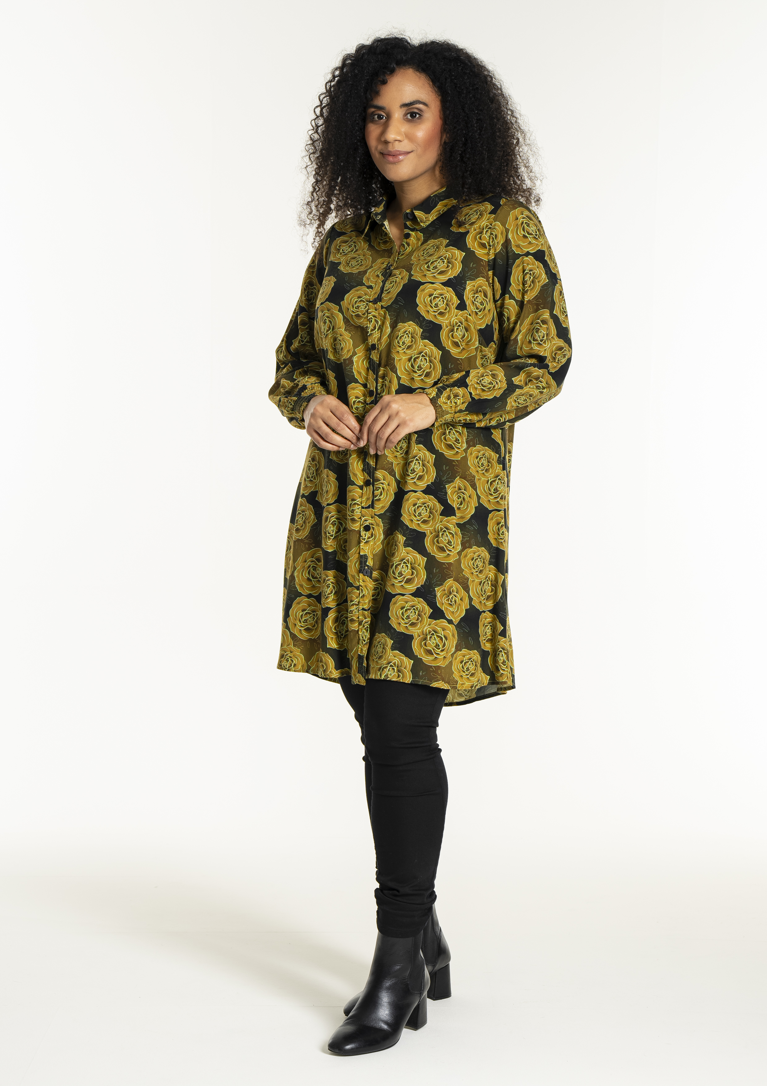 Het Studio Shirt Emilie is een luchtige blouse met een levendige bloemenprint van gele rozen op een donkere achtergrond. Het model heeft een klassieke kraag, lange mouwen met een manchette-afwerking en knoopsluiting aan de voorkant. Het shirt heeft een rechte pasvorm en valt net boven de knie. Het materiaal is niet stretch, maar licht en ademend, waardoor het comfortabel is voor meerdere seizoenen.