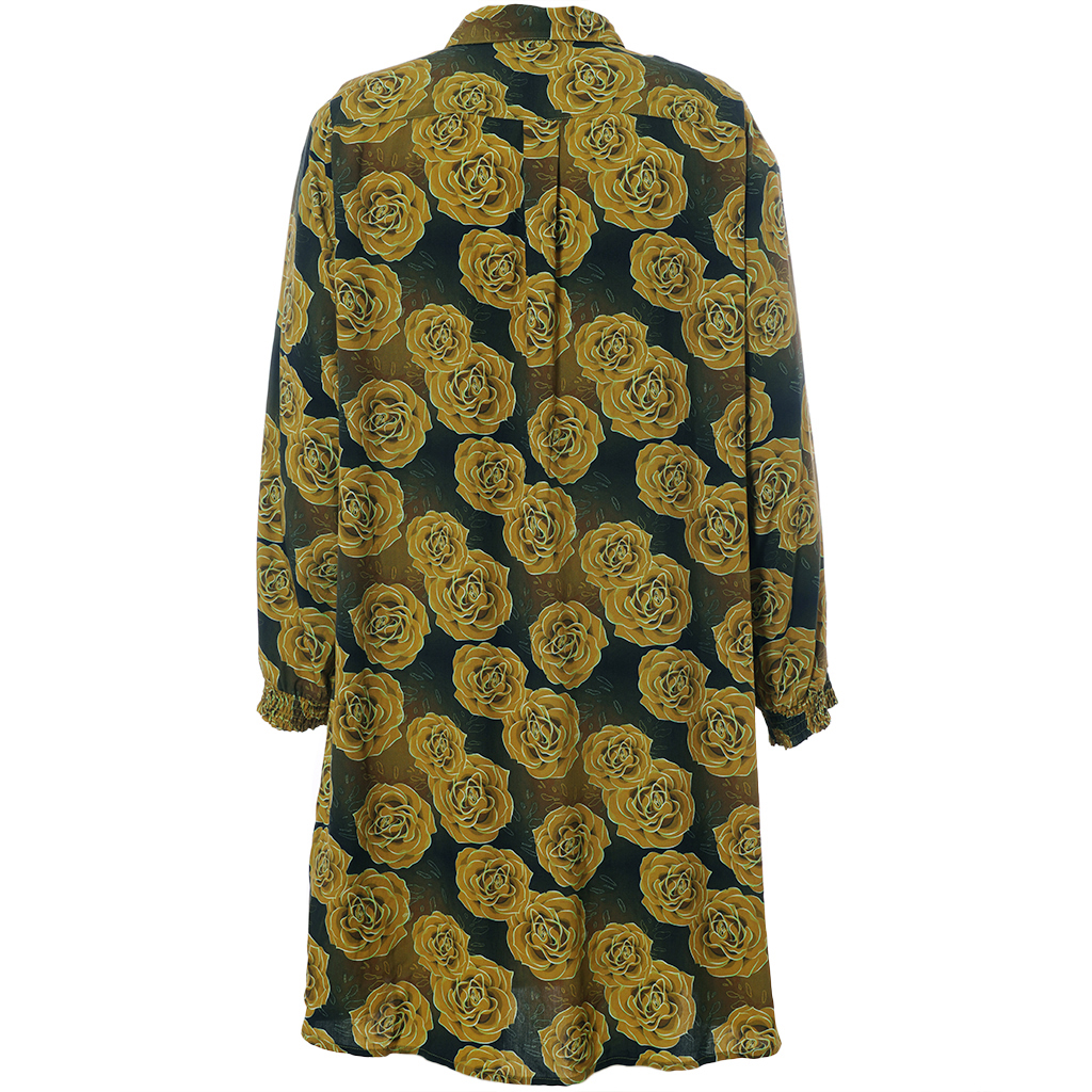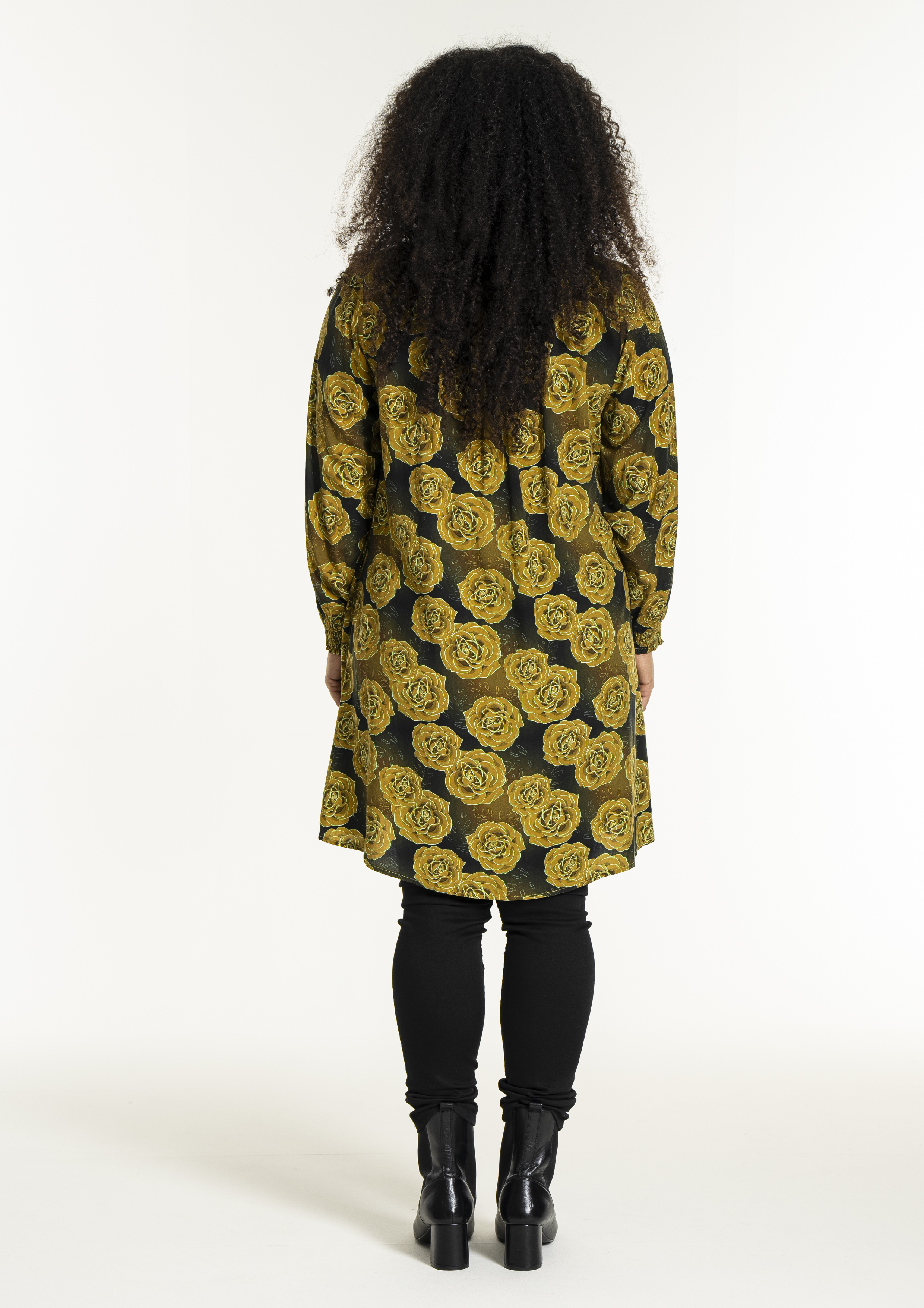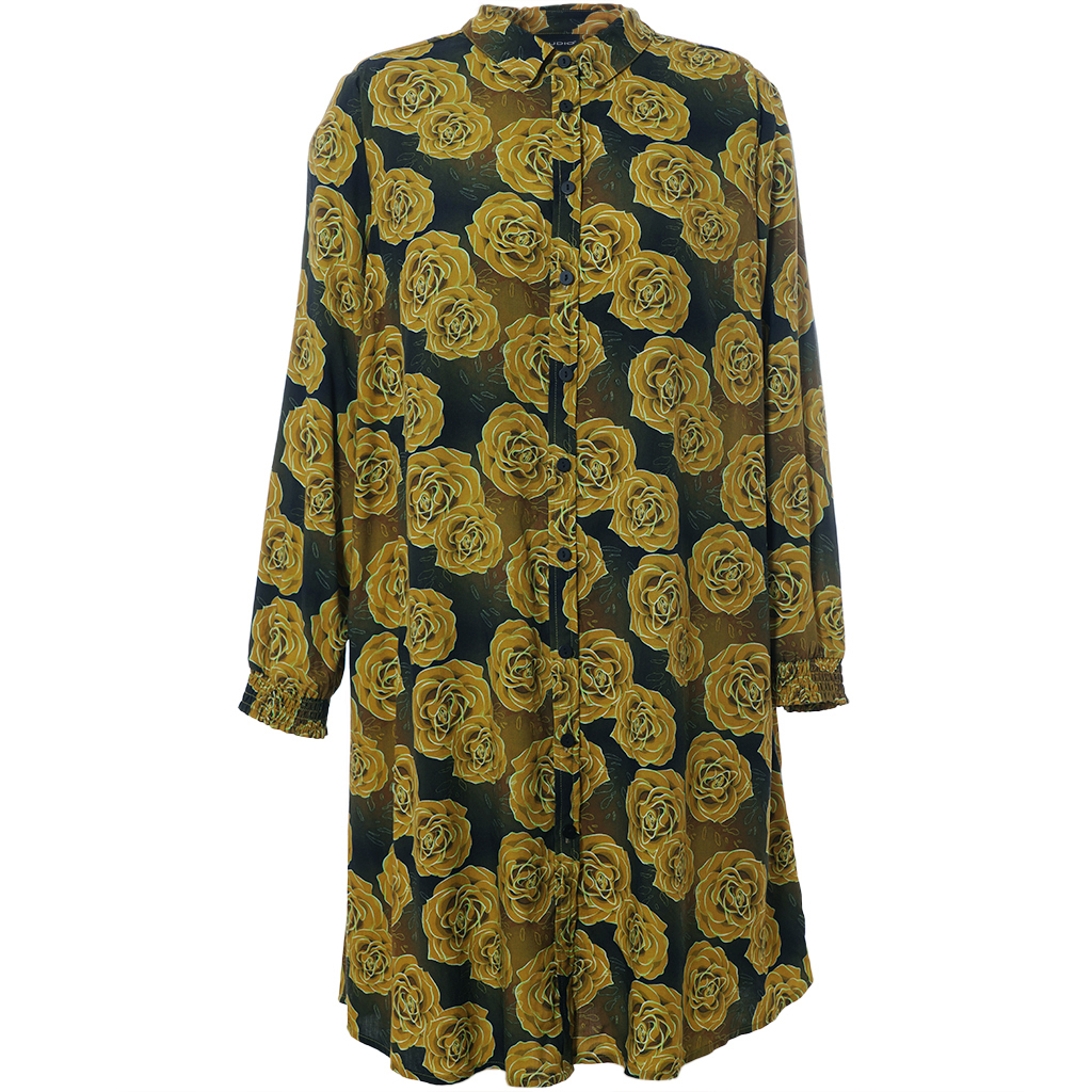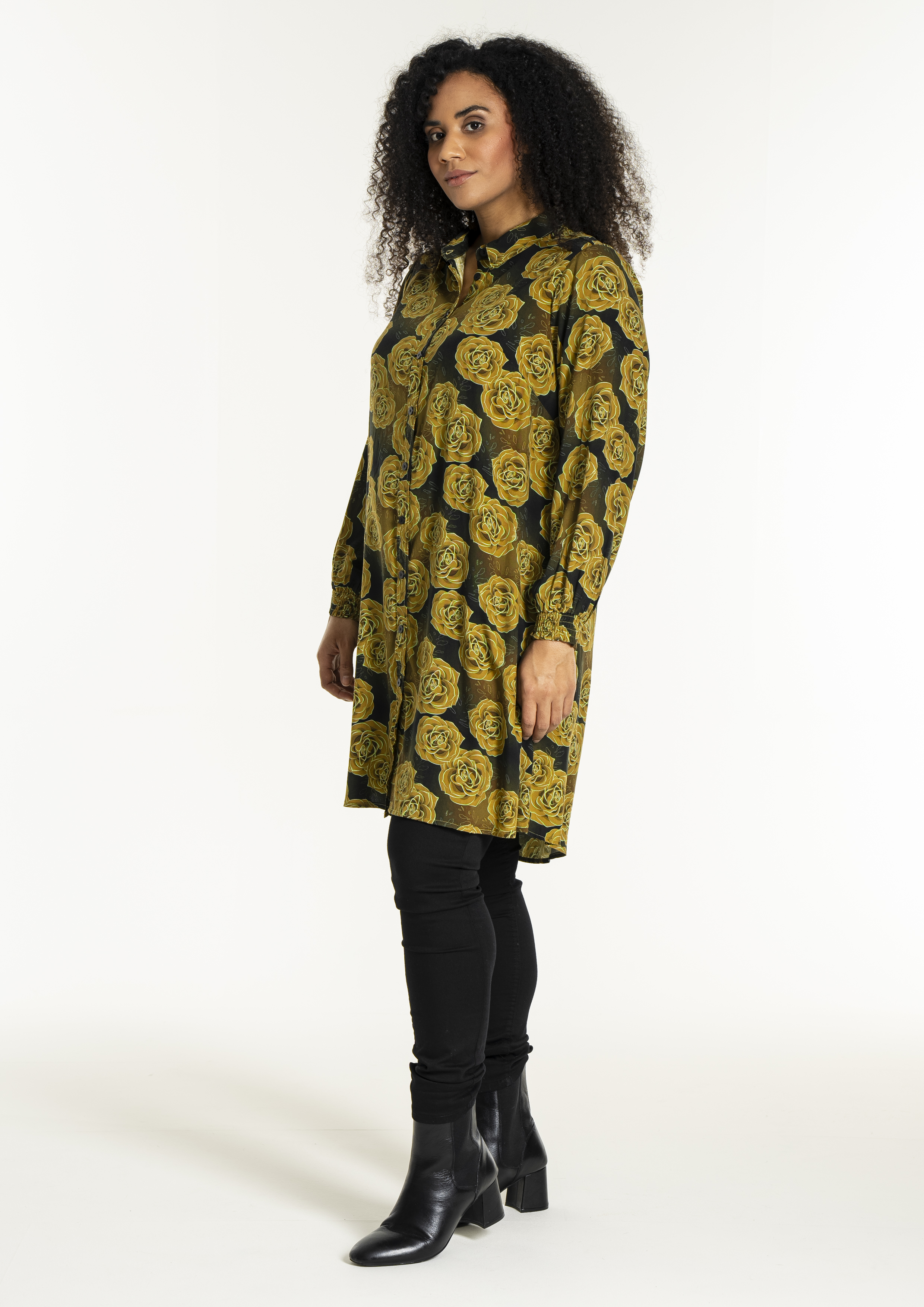 Het Studio Shirt Emilie is een luchtige blouse met een levendige bloemenprint van gele rozen op een donkere achtergrond. Het model heeft een klassieke kraag, lange mouwen met een manchette-afwerking en knoopsluiting aan de voorkant. Het shirt heeft een rechte pasvorm en valt net boven de knie. Het materiaal is niet stretch, maar licht en ademend, waardoor het comfortabel is voor meerdere seizoenen.