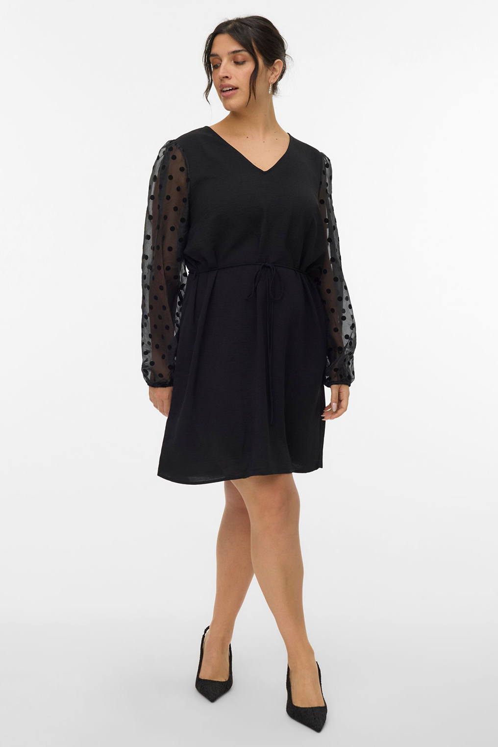 VERO MODA curve ECO jurk is een echte feest jurk. Hij is gemaakt in een mooie stof en heeft voile pofmouwen. Hierin zit een stipje verwerkt. In de taille zit een smal koordje en de jurk heeft een V hals.  De jurk valt op de knie. Mooi met een panty van Cette of Pamela Mann.