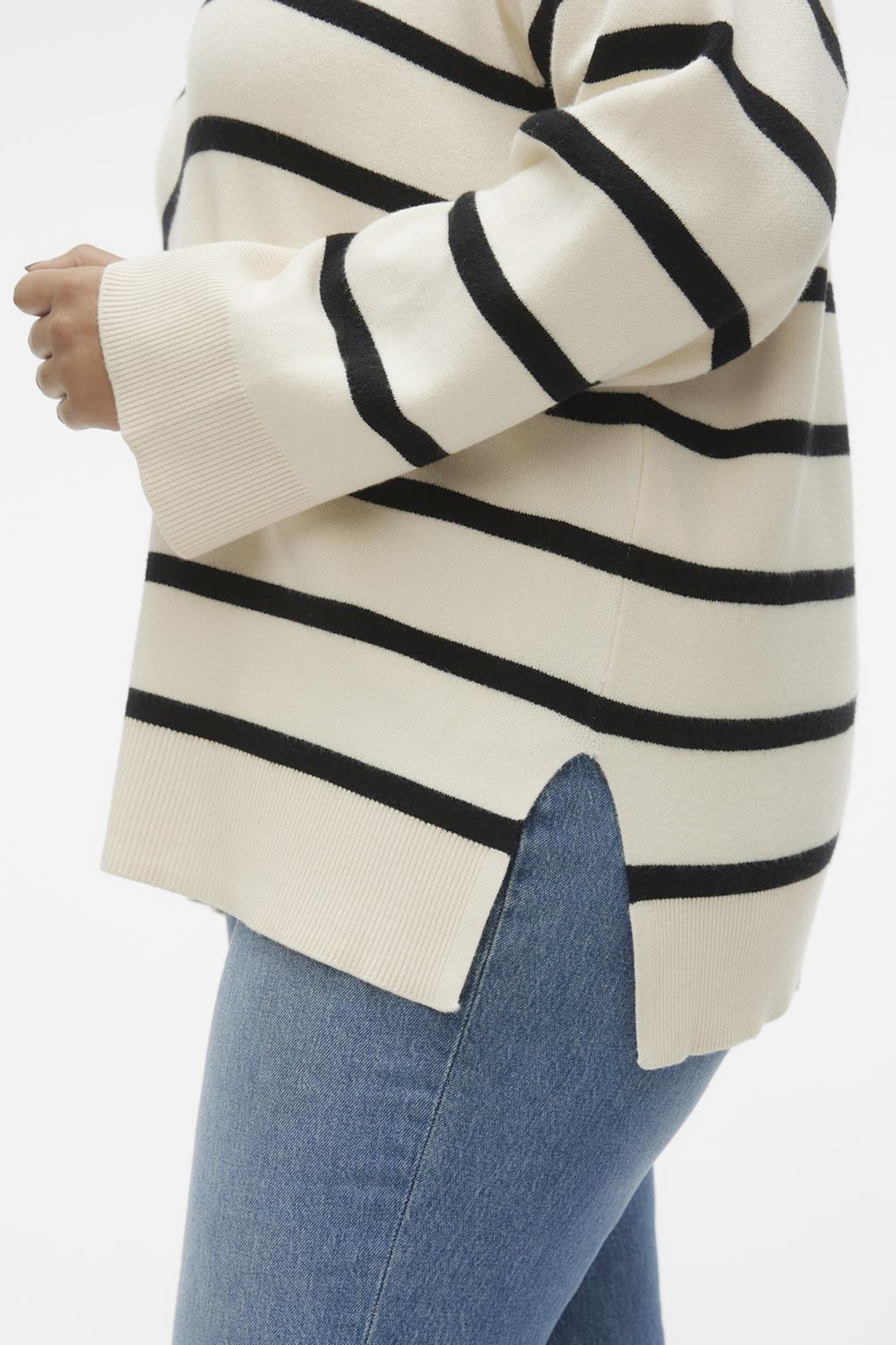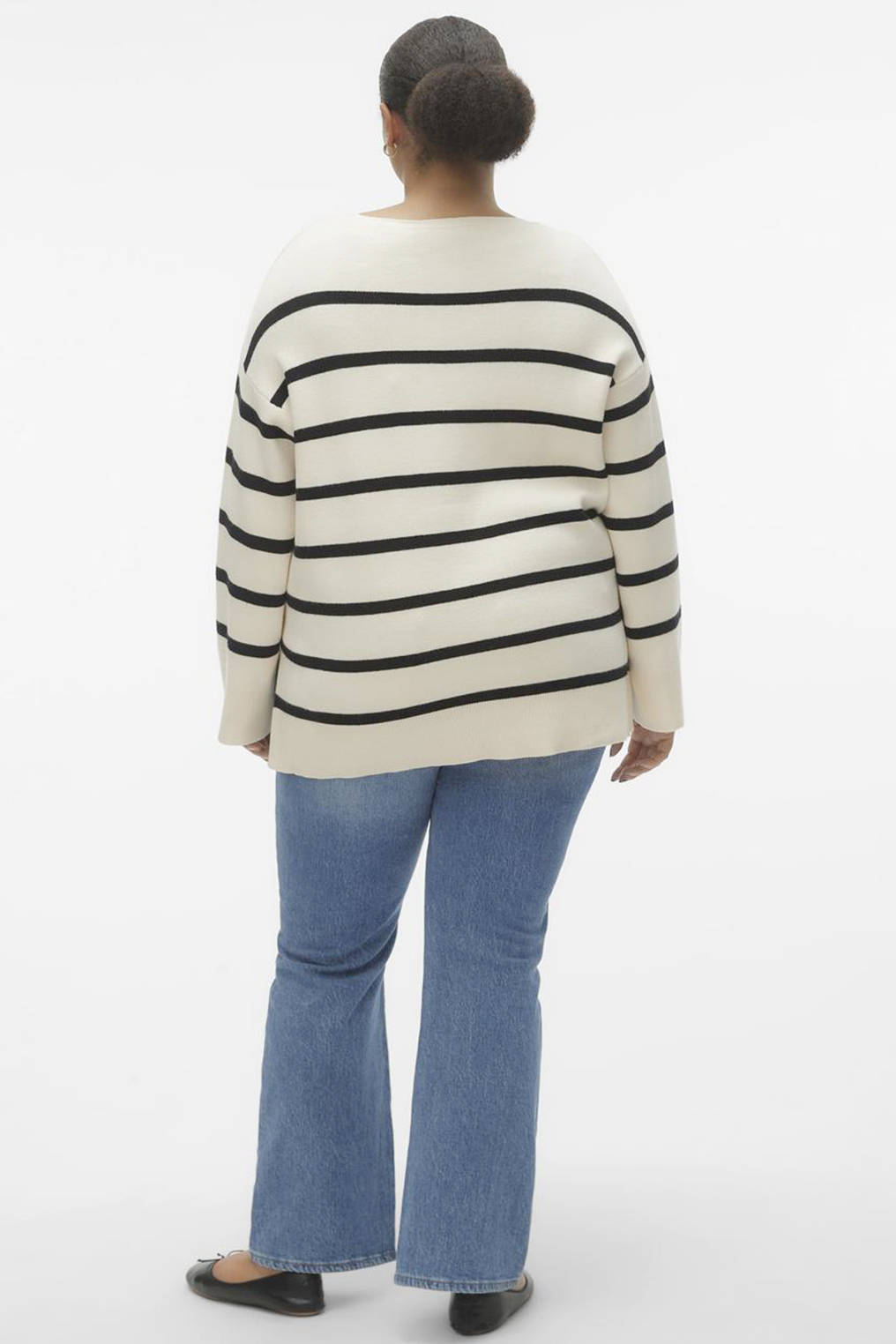 VERO MODA curve ECO trui SABA heeft een streep dessin in een mooi dicht breisel. De trui heeft een V hals en wat wijder vallende lange mouwen. De trui heeft een lengte van 70cm bij maat S. Wij vinden hem super leuk op de jeans 10285012.