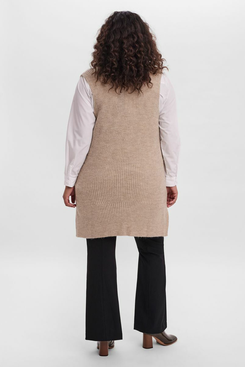 Lange spencer trui van VERO MODA curve. Het is een mouwloos model met diepere V hals. Hij heeft een smalle ribbrei. Het voorpand is korter dan het achterpand en bij de onderkant zit een kort split. Deze spencer draag je met een basic shirt eronder, kijk eens bij de 10251961 of de 10251959 en natuurlijk een skinny jeans.