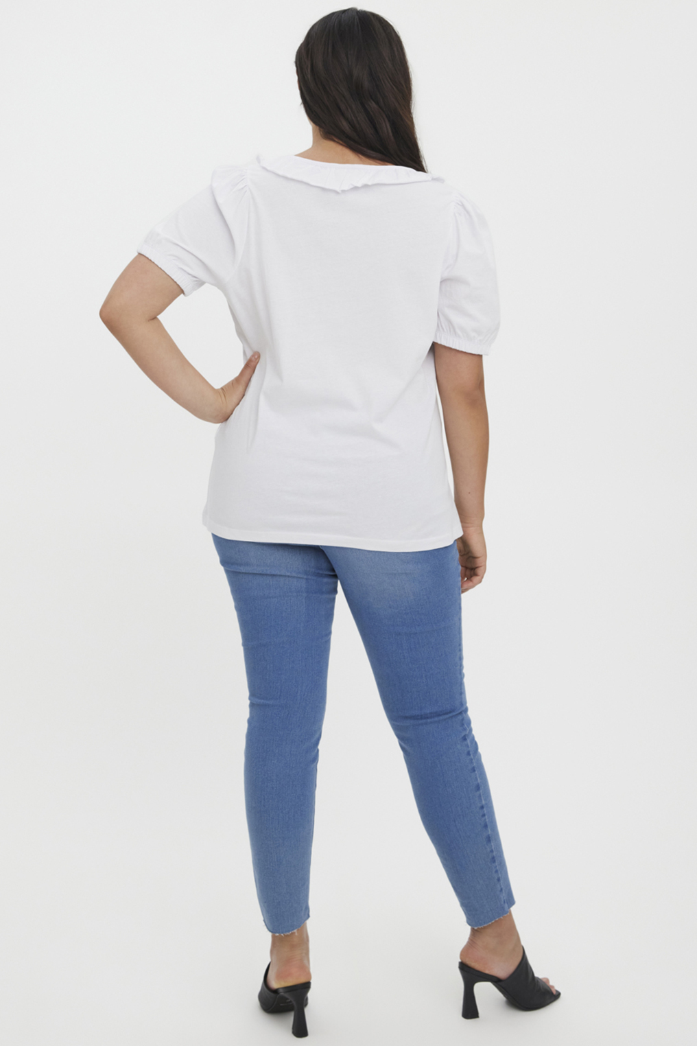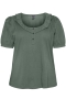 Dit is nou zo'n echt zomers shirt. Leuk op een jeans short of zomerse broek of rok. Het shirt is van VERO MODA curve en heet VMELOS. Hij heeft een diepere ronde hals met daaromheen een smalle ruche rand. Onder de hals zitten 3 knoopjes, deze kunnen niet open. Hij heeft een korte mouw en is licht gevormd in de taille. Hij valt wat korter bij maat S is hij 68 cm lang. Het shirt is gemaakt in een mooie kwaliteit tricot. Je vindt al onze shirts in de categorie grote maten shirts