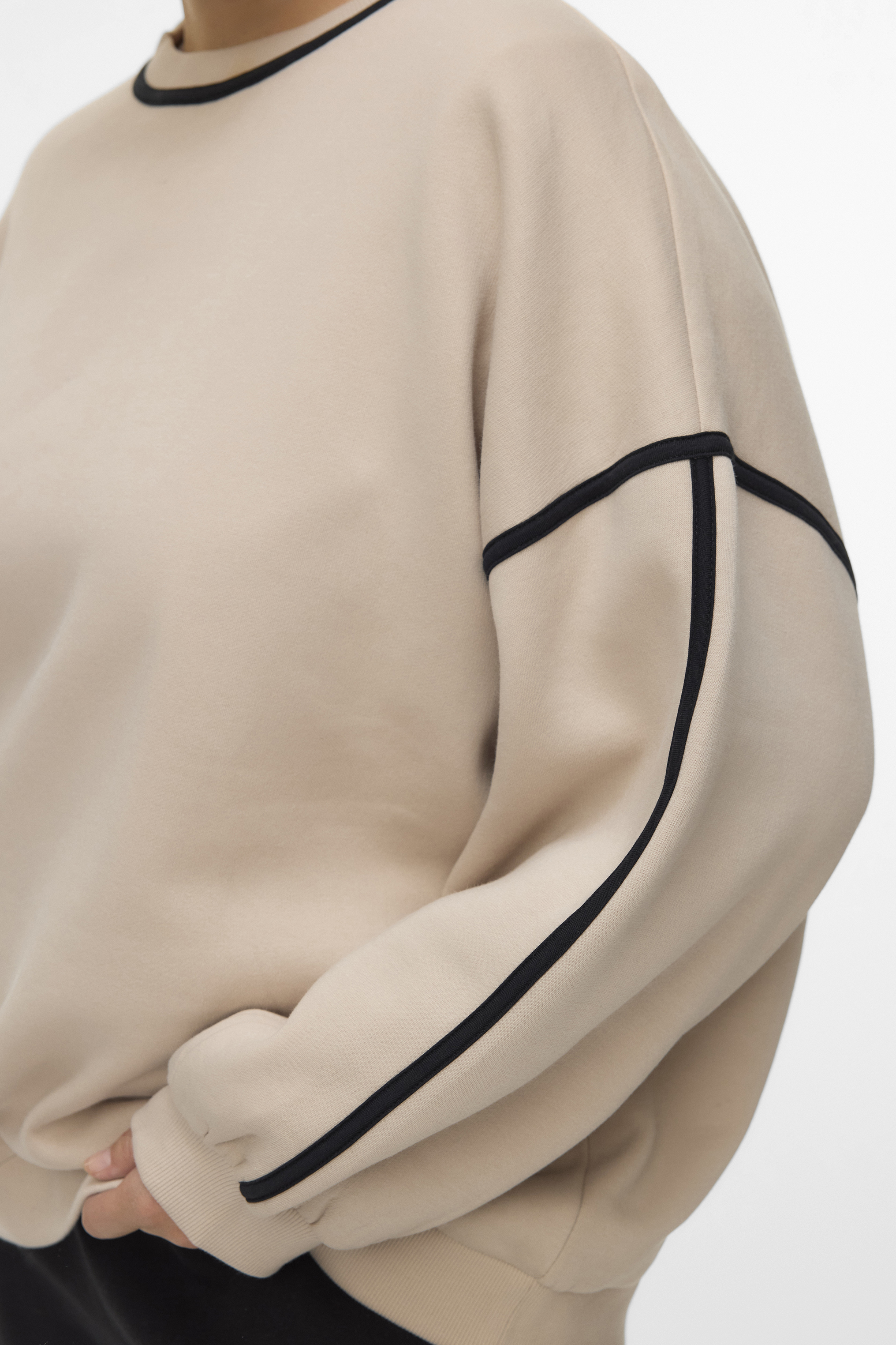 VERO MODA curve ECO trui is een heerlijke sweater met een zwarte bies langs de hals, armsgaten en op de mouw. De trui heeft een normale pasvorm en lengte. Leuk om te dragen op een jeans of bijvoorbeeld een lestherlook broek.