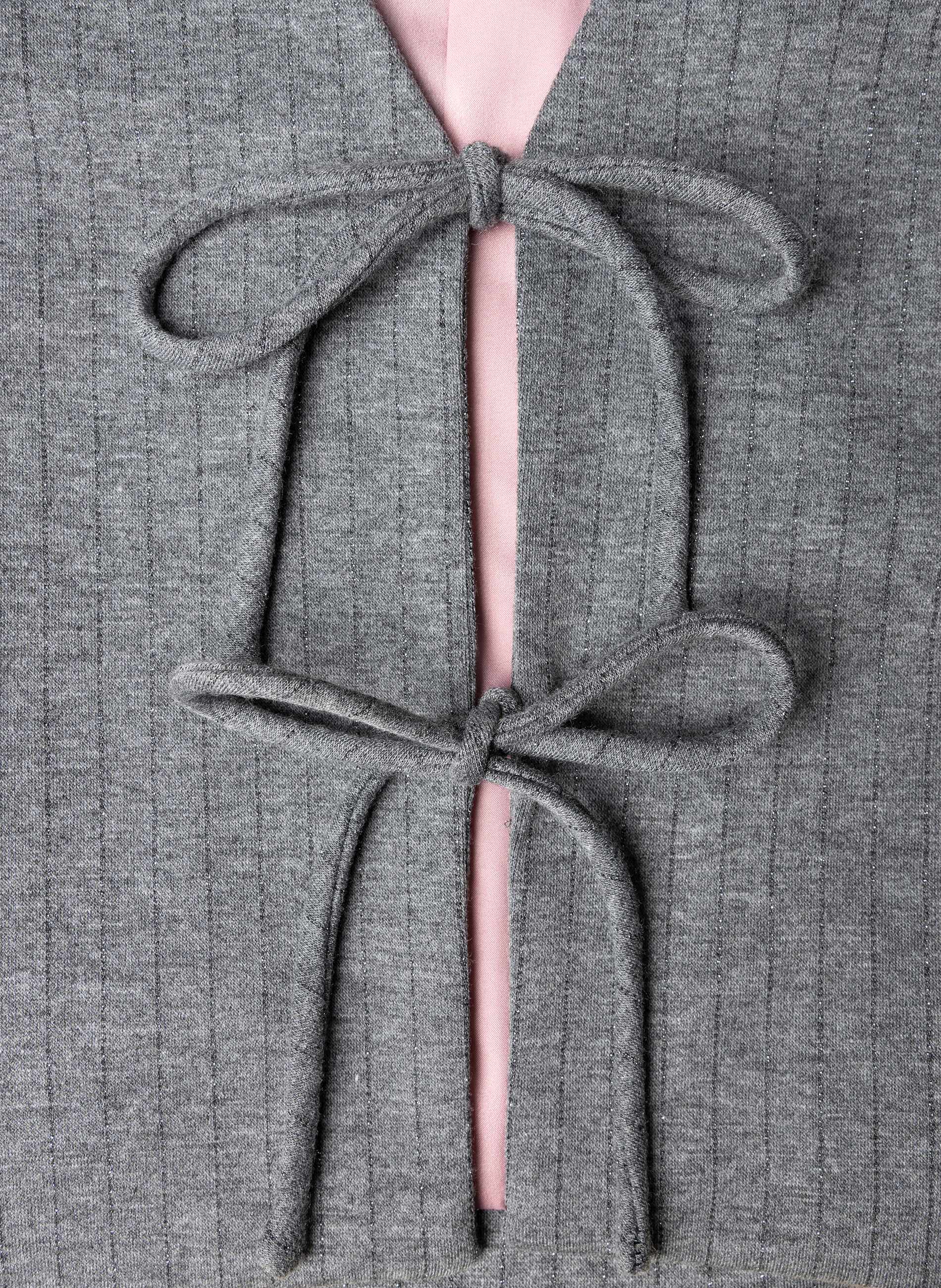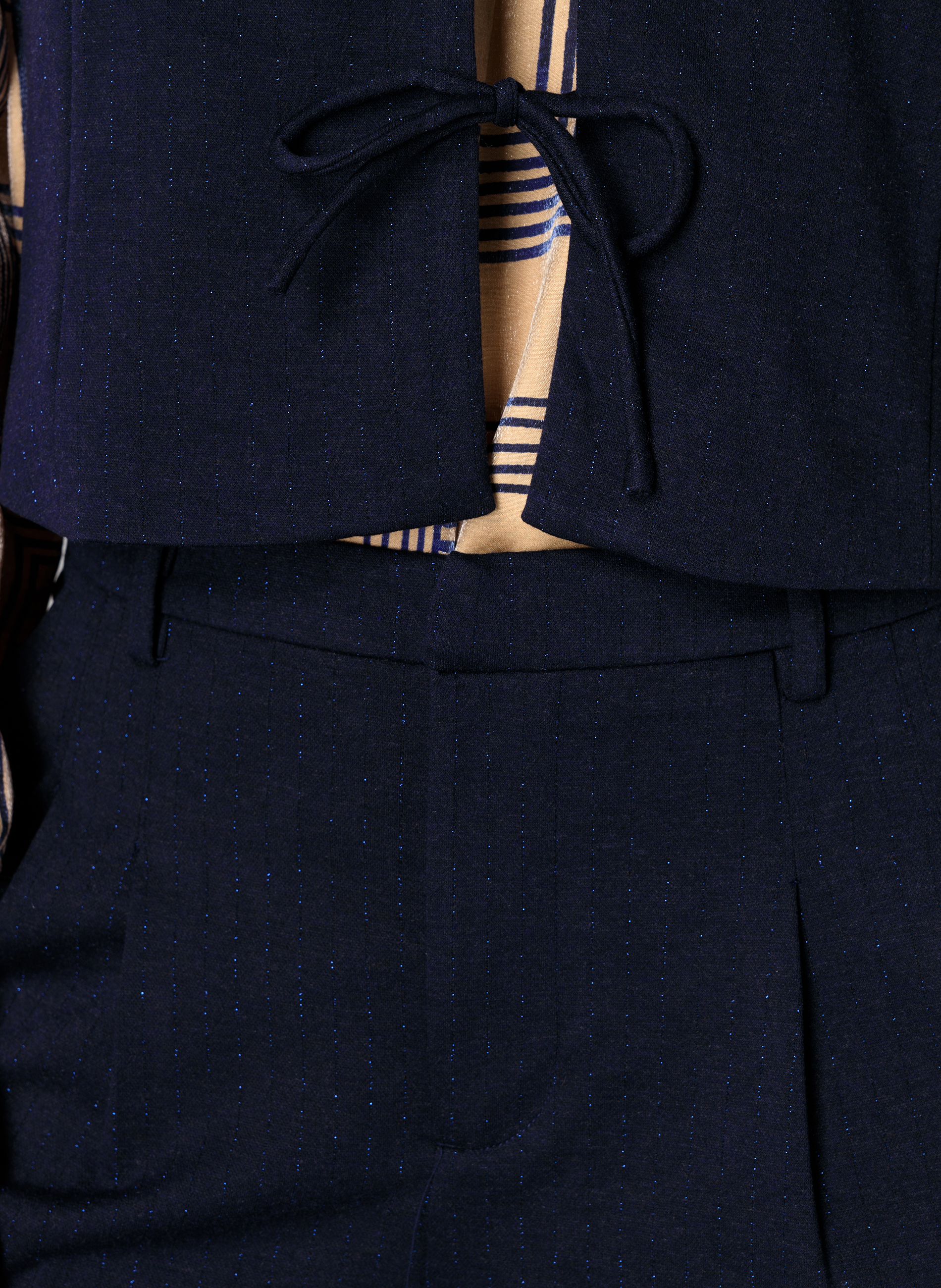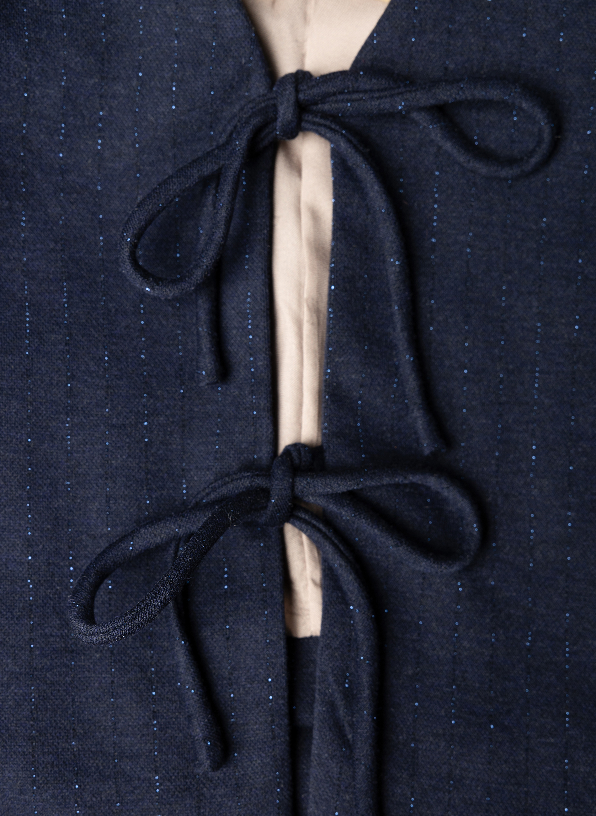 Deze elegante, mouwloze gilet sluit aan de voorkant met twee subtiele striksluitingen voor een verfijnde, vrouwelijke touch. De korte snit zorgt voor een modern silhouet. Deze is verkrijgbaar in twee kleurvariaties.