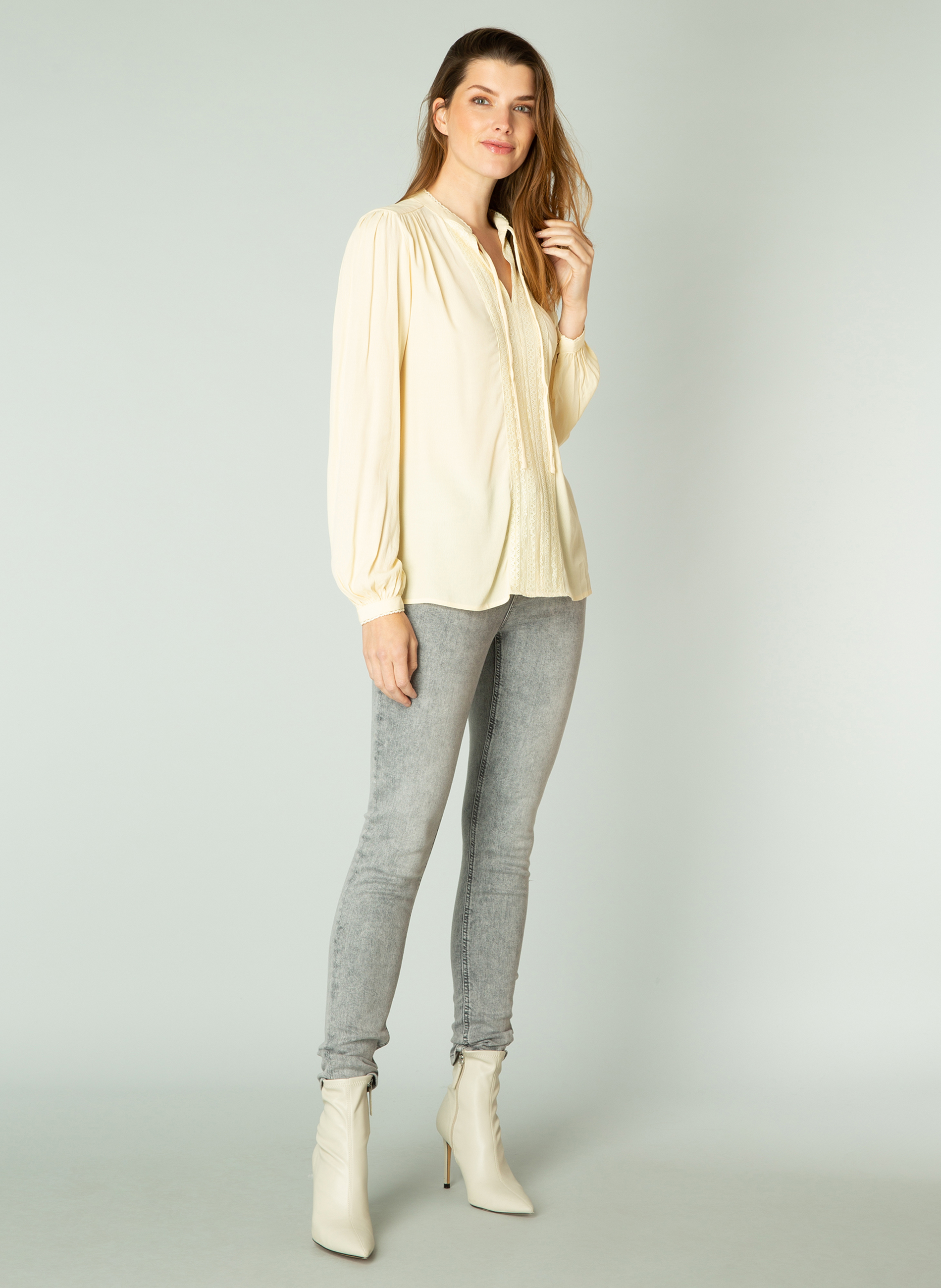 Blouse Gitana van Yest is een romantische blouse met wijde mouwen en een ronde halslijn. De blouse heeft in de hals een strikje. Op het voorpand zit een kant details die vanaf de hals naar de zoom lopen. De lengte van e blouse is 66 cm bij maat 38. Het model draagt op de foto broek Giselle van Yest (0002638).