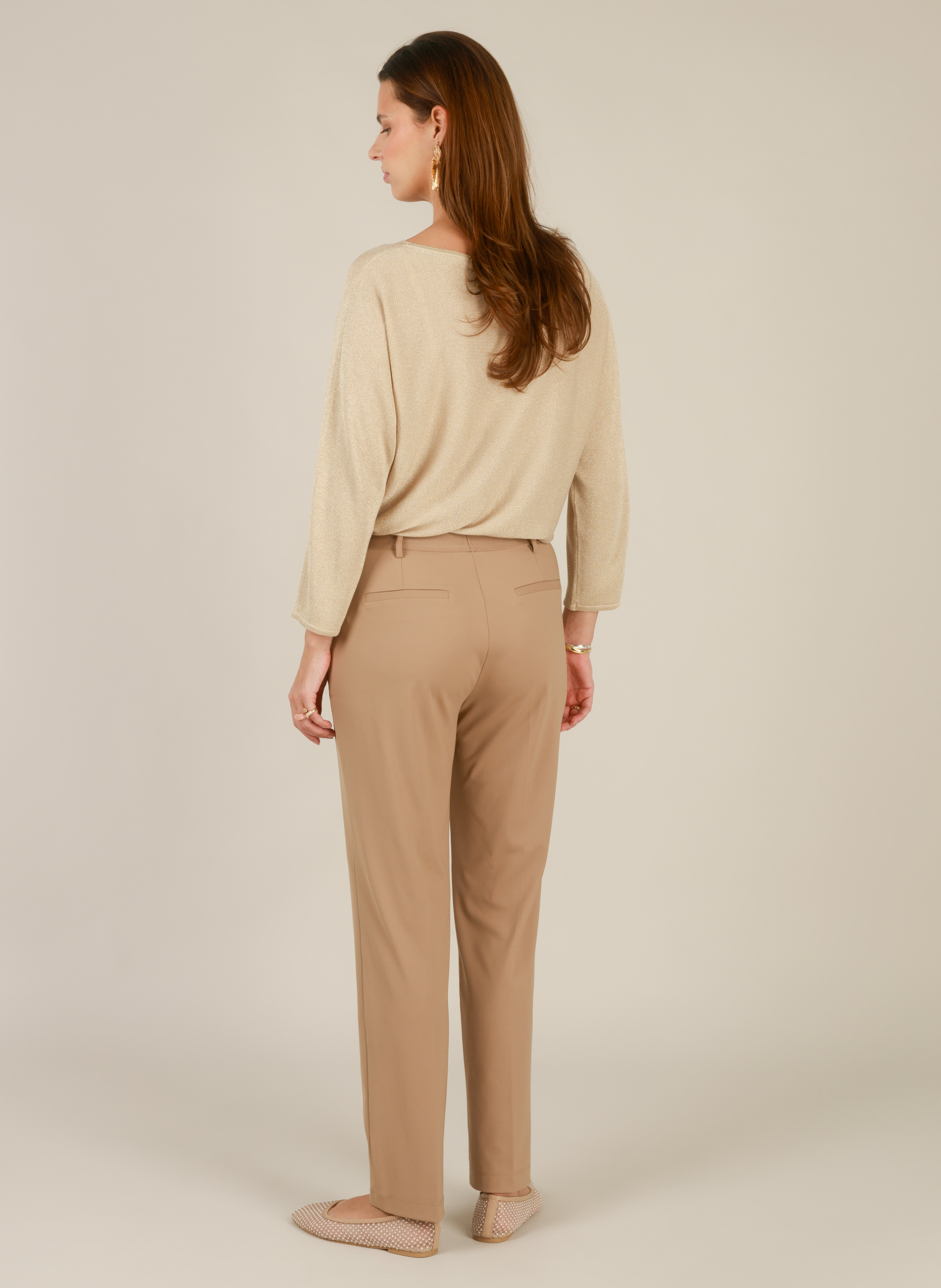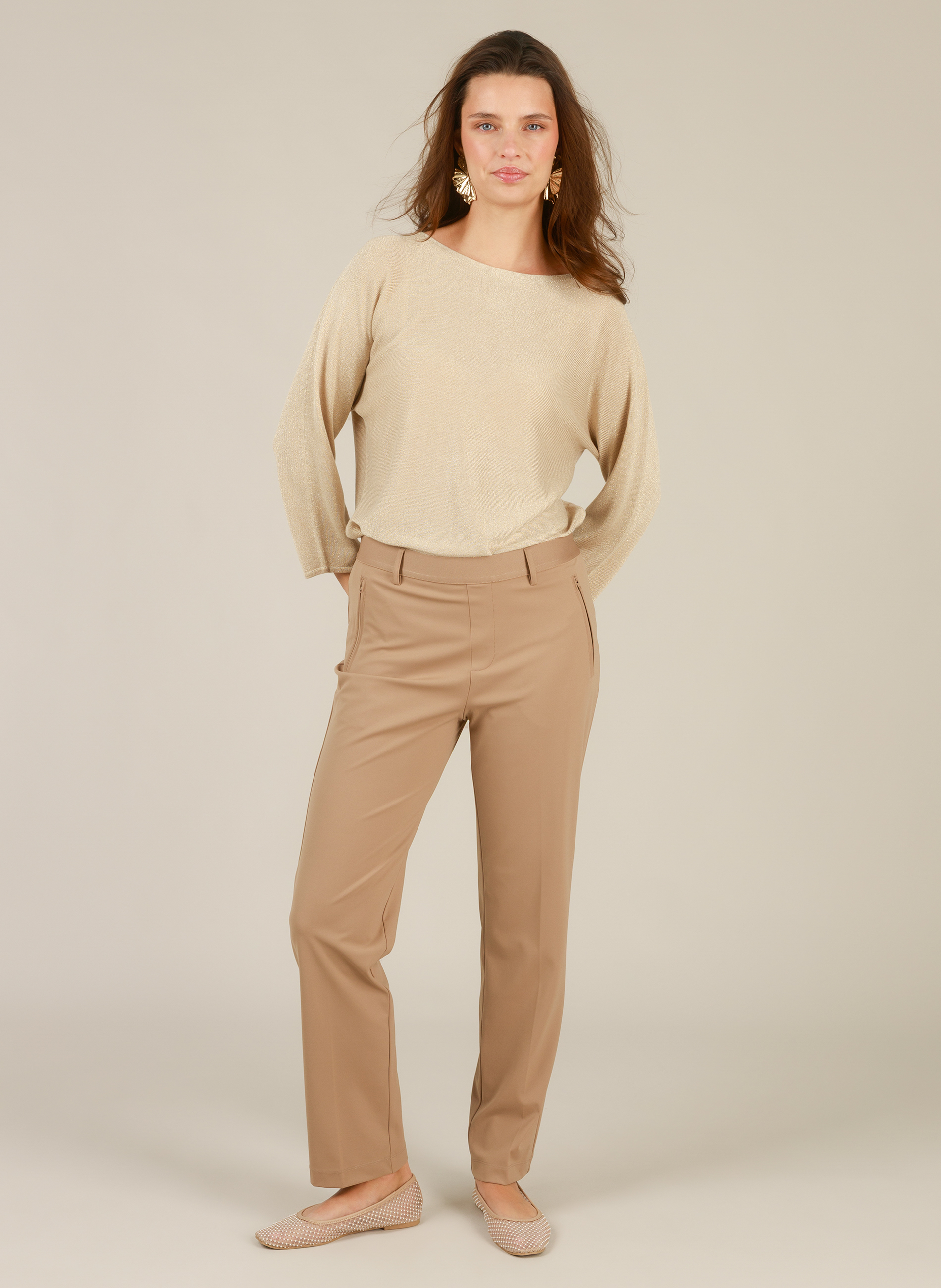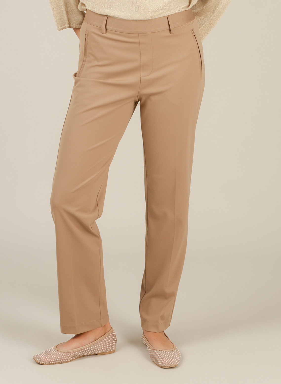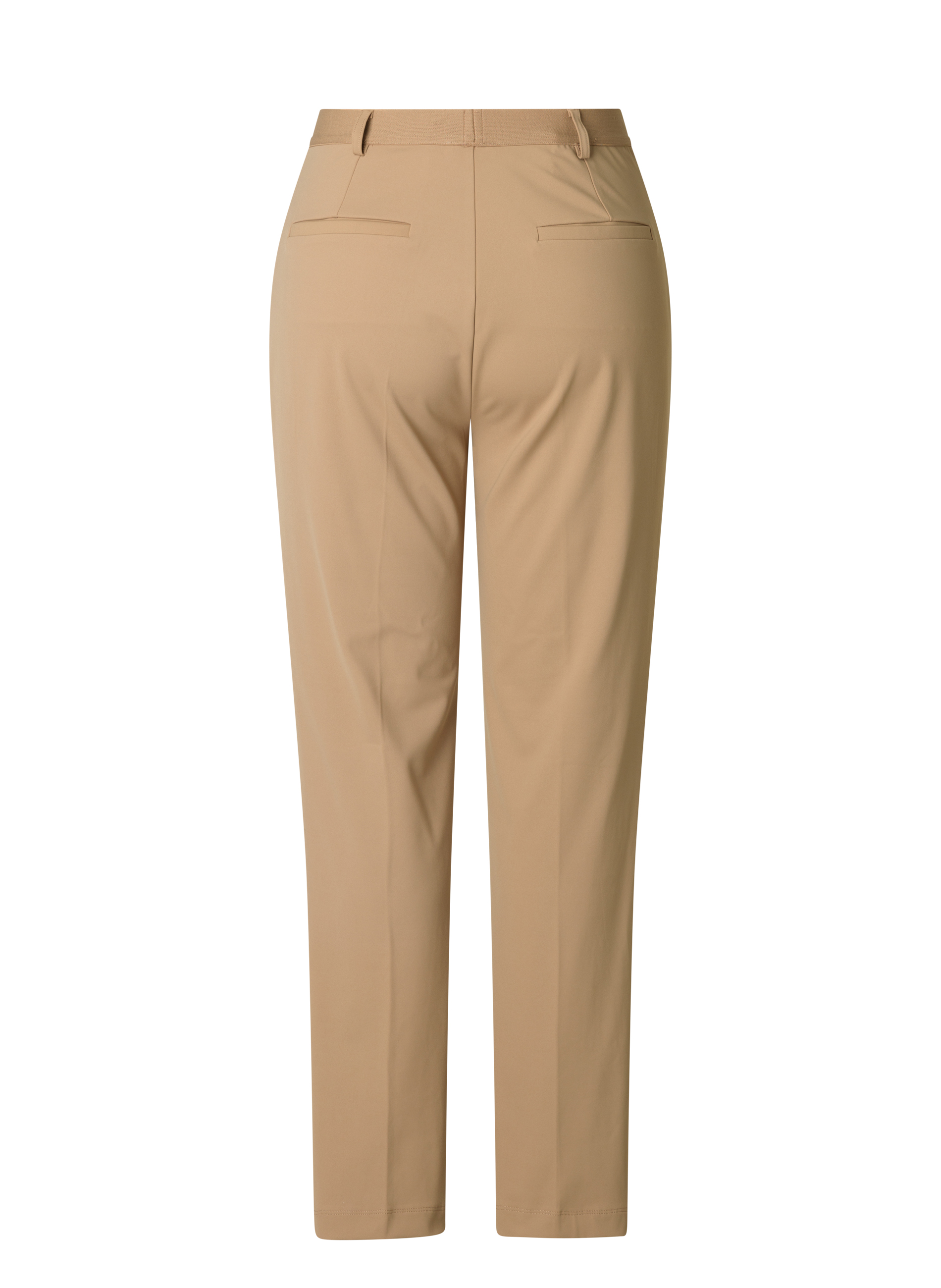De Yest travelbroek is een gladde en comfortabele broek voor dames met een maatje meer. Gemaakt van zachte travelstof van 75% polyamide en 25% elastaan, voelt de broek soepel aan en draagt prettig gedurende de hele dag. De elastische tailleband zorgt voor een fijne pasvorm, terwijl de ritszakken een praktische touch toevoegen.
