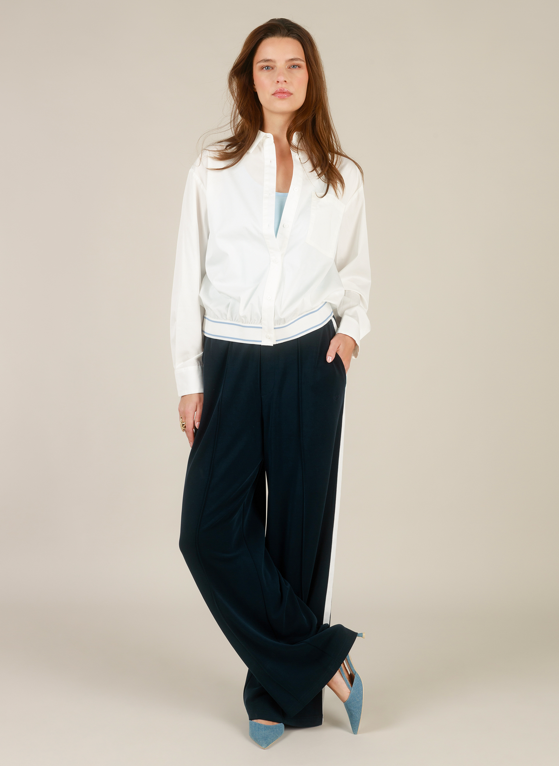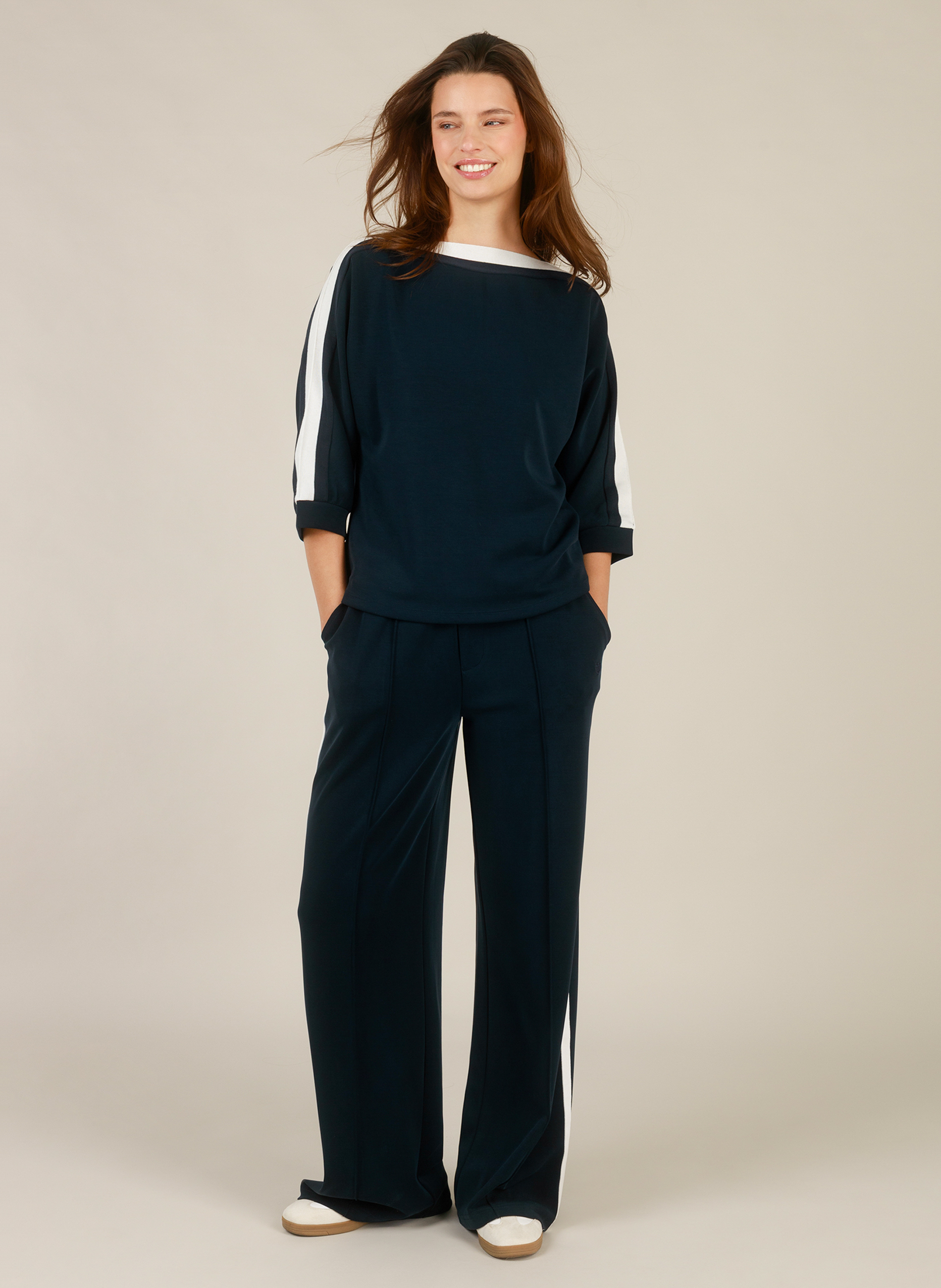 De broek is verkrijgbaar in navy en antique-white, kleuren die makkelijk te combineren zijn met verschillende tops en truien. Met een lengte van 32 inch valt de broek mooi over je schoenen en biedt hij comfort tijdens drukke dagen én ontspannen momenten.