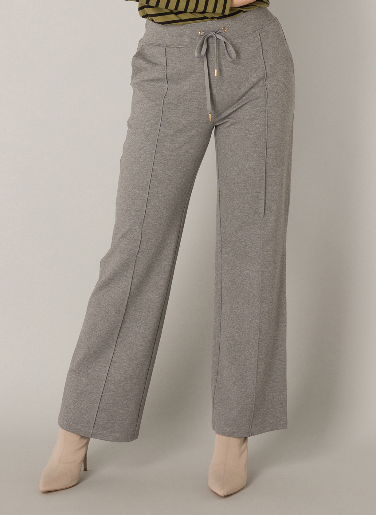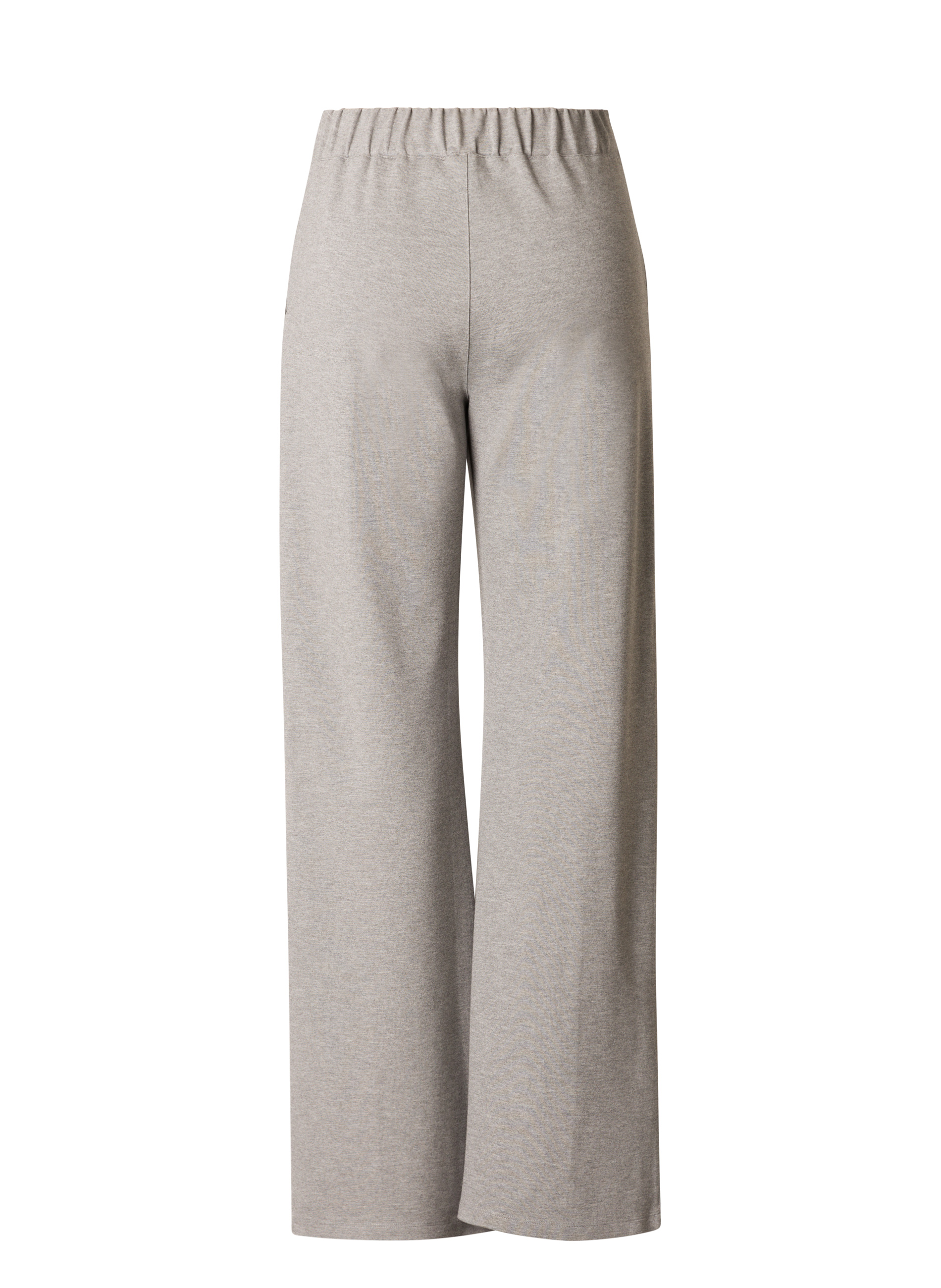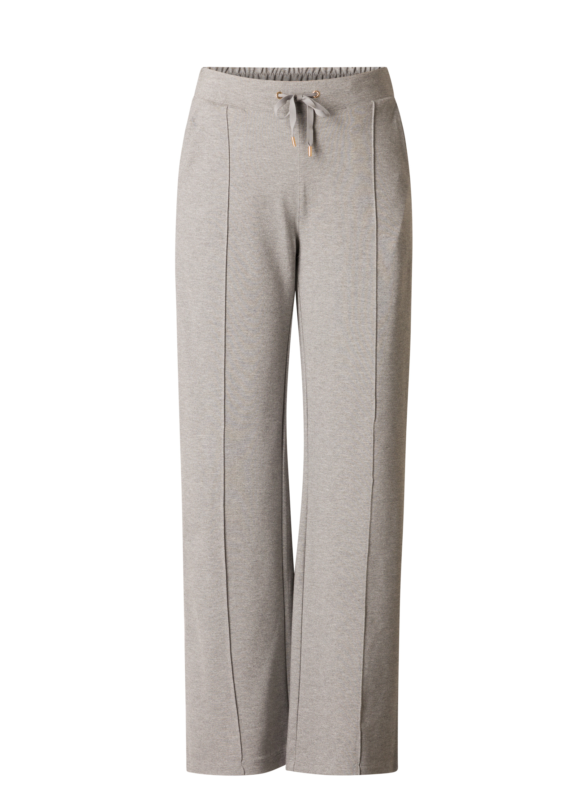 Wide fit pantalon in een gemêlleerde grijze jersey stof. Deze Yest broek met elastische tailleband kan aangesnoerd worden met een strik. De Nadia heeft een platte naad over het been en is voorzien van fijne steekzakken. Lengte 32 inch.