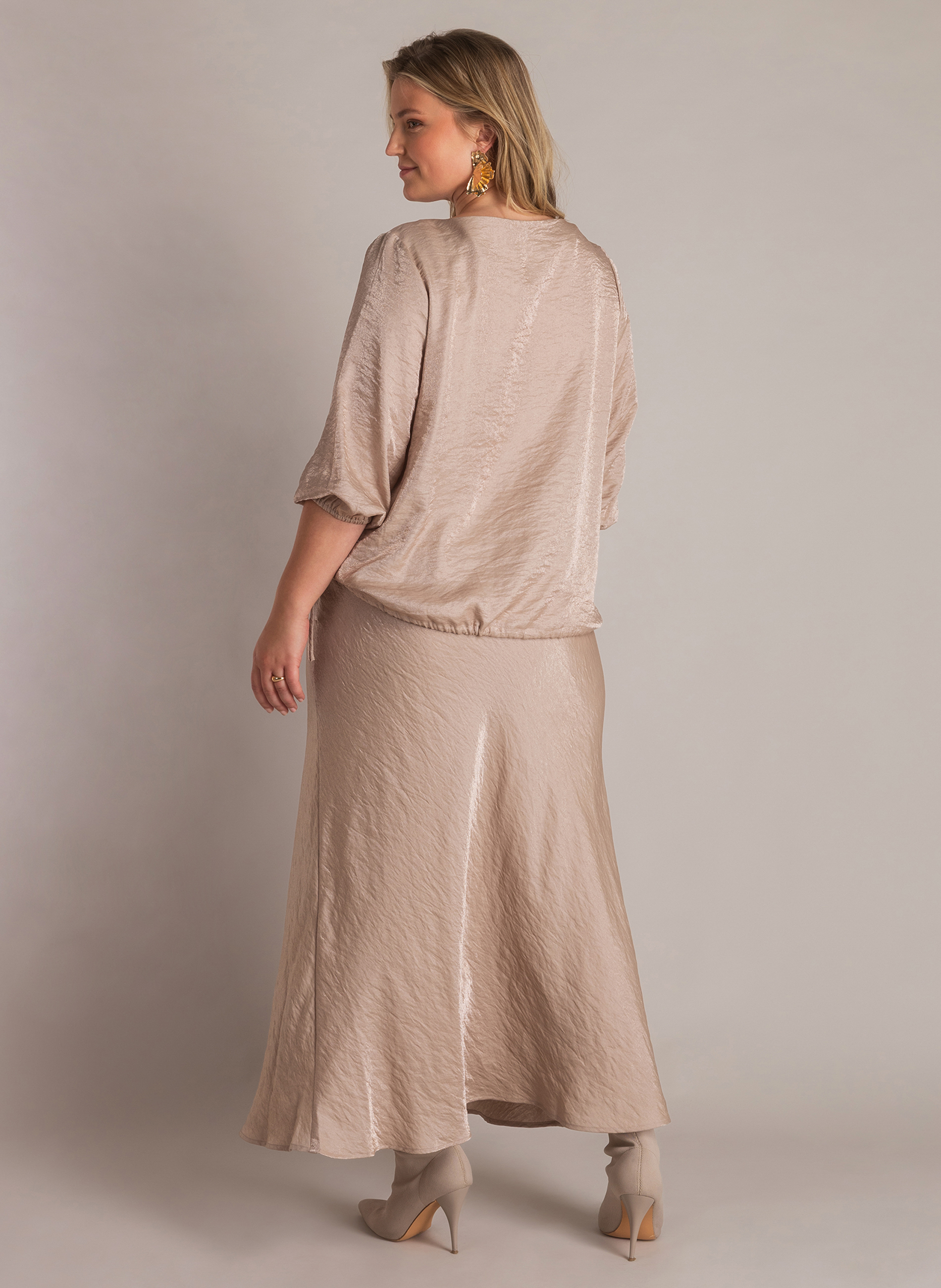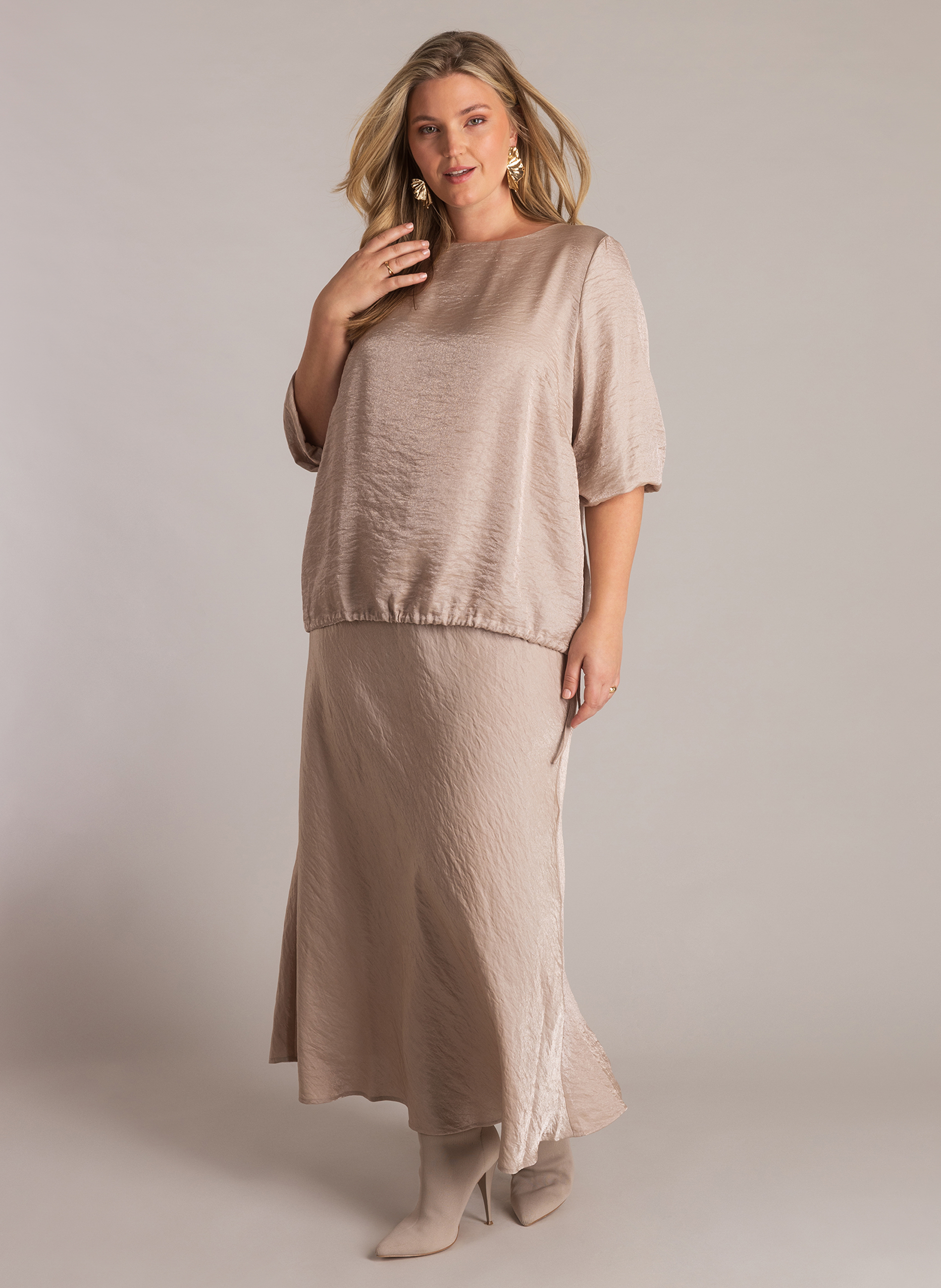 Jolanda straalt subtiele elegantie uit dankzij de zachte glans van de stof. De boothals en lange mouwen zorgen voor een tijdloze, rustige look, terwijl het aantrekkoord onderaan de mogelijkheid geeft om het silhouet naar wens te vormen. De kleur licht taupe geeft een chique uitstraling en in combinatie met de bijpassende rok ontstaat een prachtig, stijlvol geheel.