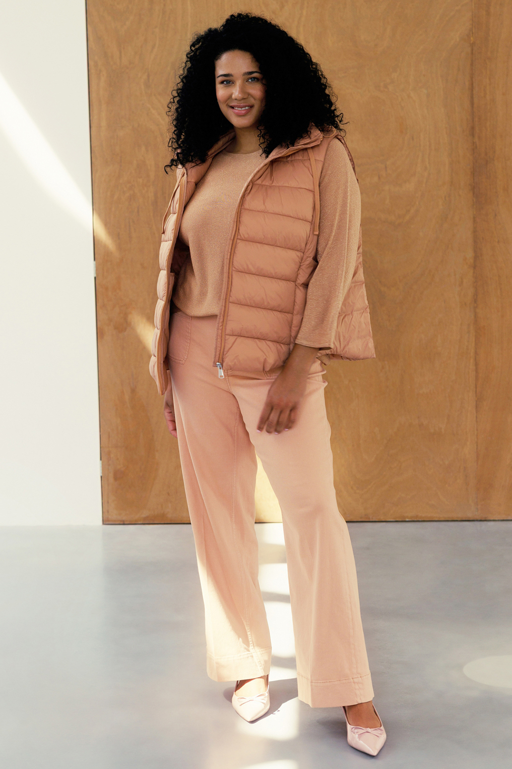 Het licht glanzende nylon voelt zacht en comfortabel aan op de huid, terwijl het model van 178 cm in maat 46 laat zien hoe prachtig deze bodywarmer valt. Ideaal voor over een blouse, jurk of zelfs een fijne trui tijdens de overgangsseizoenen.