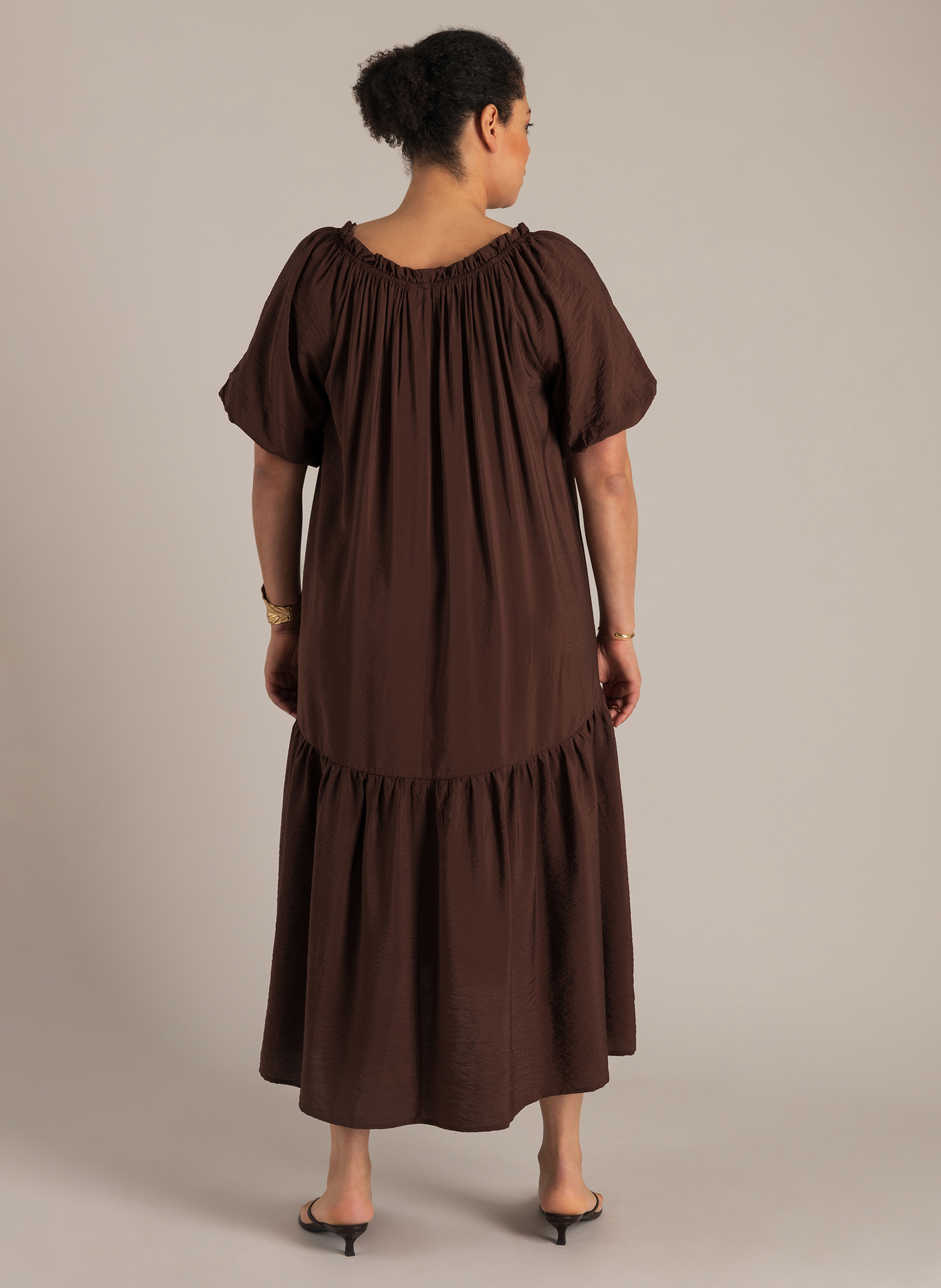 Langer, losser en precies goed voor warme dagen. De jurk valt ruim en beweegt makkelijk mee, zonder zwaar te worden. Met het koordje bij de hals geef je zelf vorm. De kleur is sterk en combineert makkelijk met sandalen of een simpele slipper.
