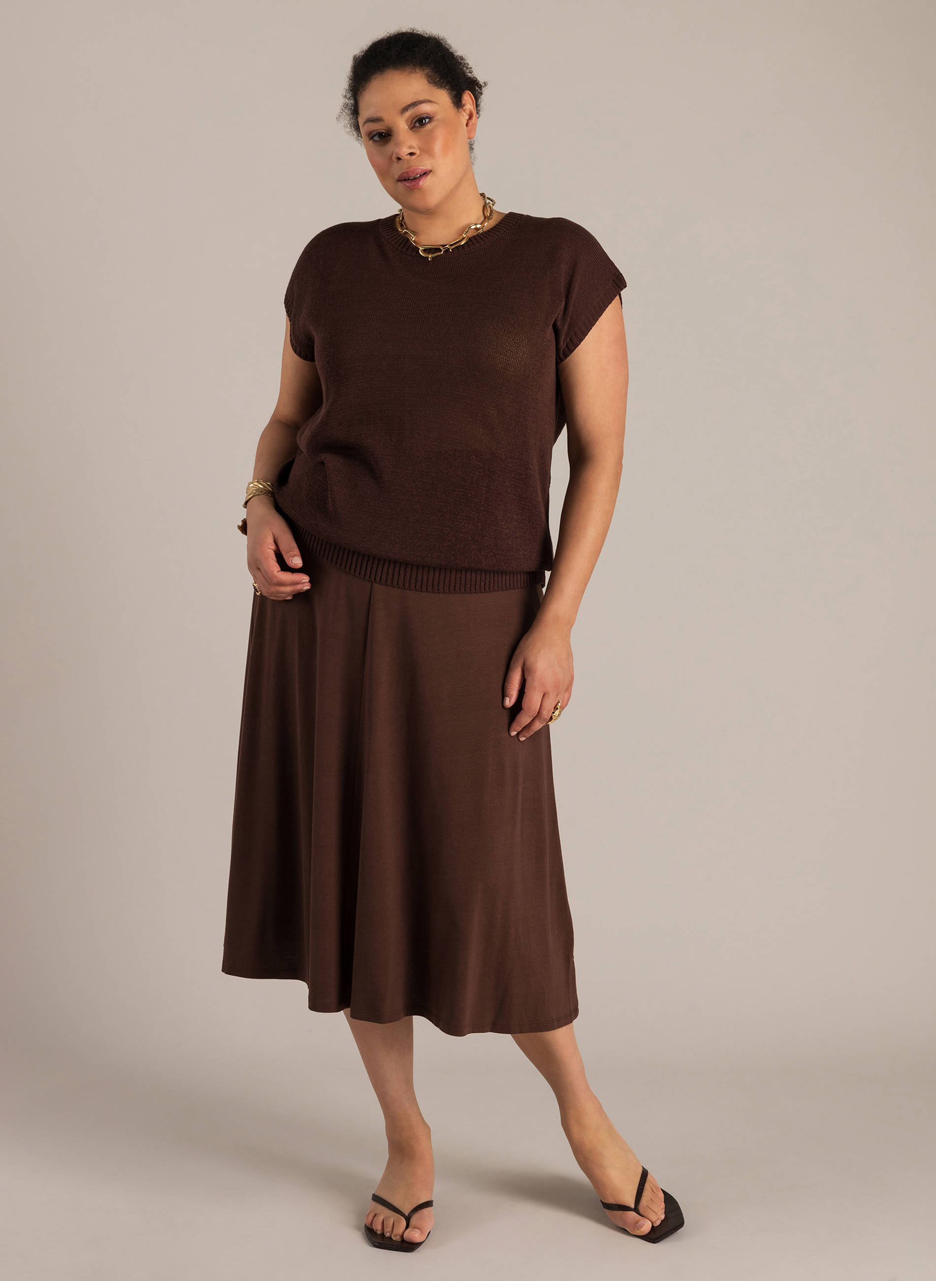 Zoek je een comfortabele en vrouwelijke rok voor in je garderobe? Deze YEST CURVE rok A006353 is een prachtige aanwinst voor onze collectie grote maten kleding. Dankzij de regular A-lijn pasvorm valt de rok soepel om je benen en zorgt het model voor een mooi silhouet. Met een lengte van 84 centimeter valt dit item tot over de knie, wat het zeer geschikt maakt voor diverse gelegenheden. De rok is gemaakt van een zachte jersey samenstelling van 67% Tencel en 33% katoen, wat zorgt voor een ademend en prettig draaggevoel. De comfortabele tailleband maakt dat je deze YEST CURVE rok A006353 de hele dag met plezier draagt. Als specialist in plus size mode begrijpen wij dat een rok de basis is voor een verzorgde outfit. Combineer dit tijdloze item eindeloos en geniet van optimaal draagcomfort en een stijlvolle uitstraling.