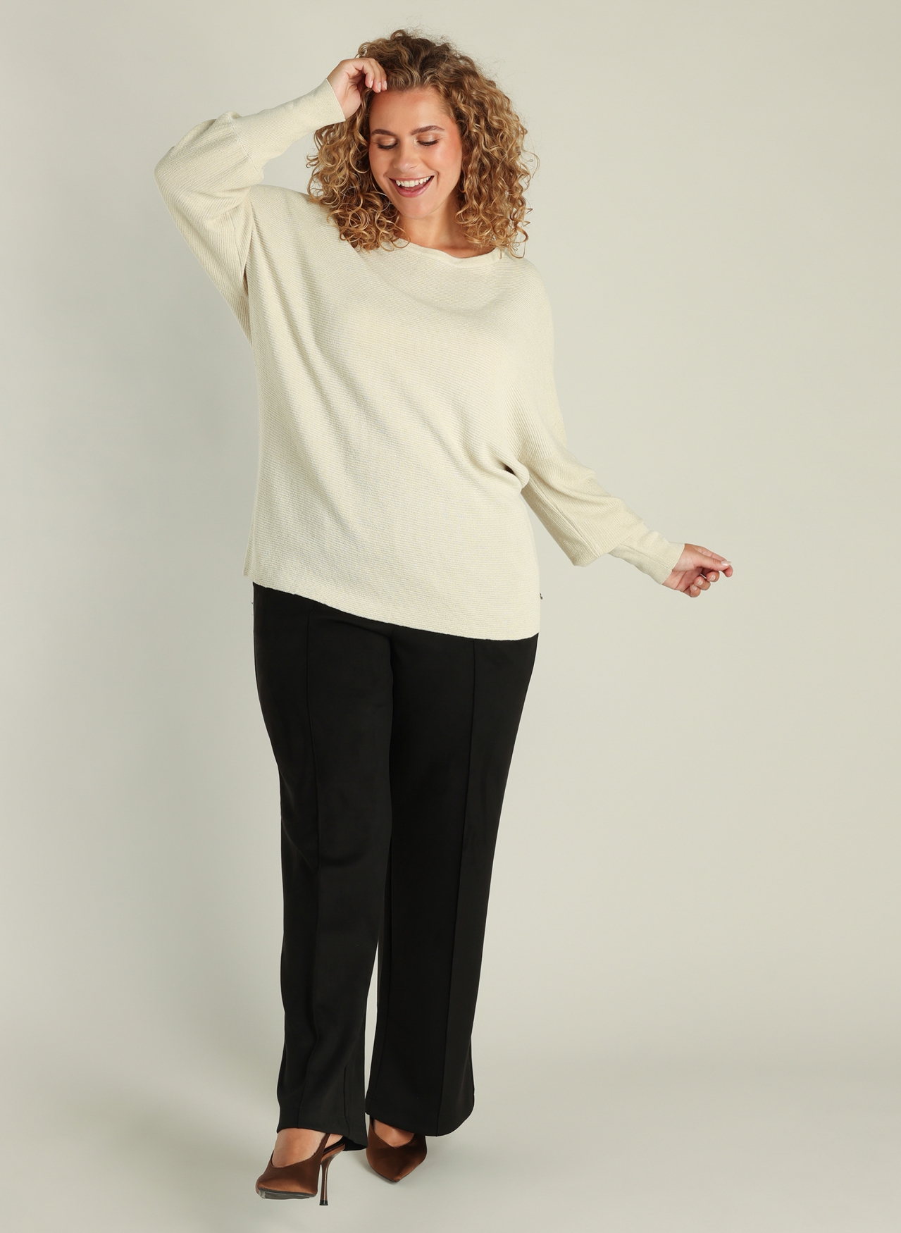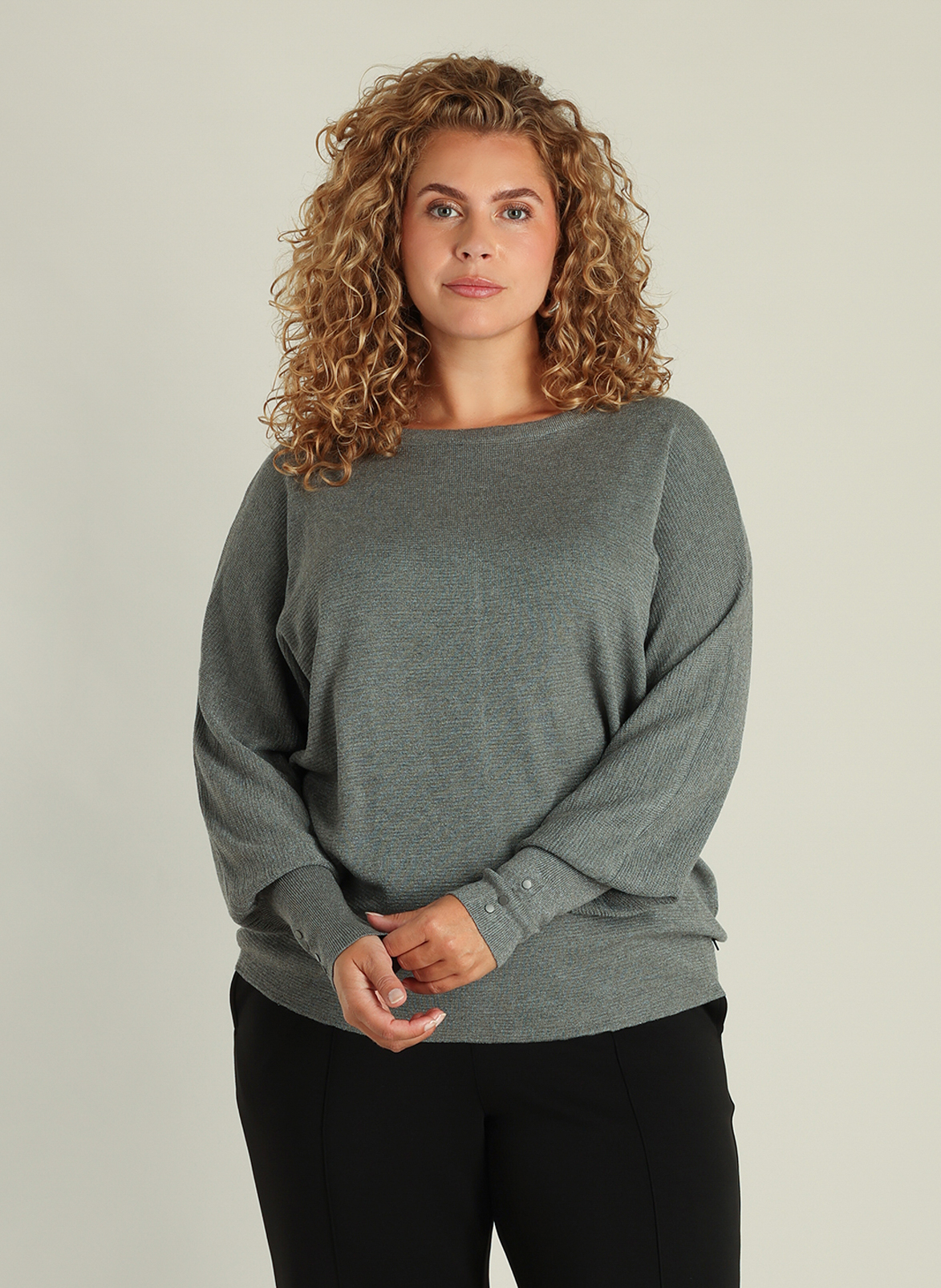 De vleermuismouwen geven extra ruimte en comfort, terwijl de manchetten met knoopjes een stijlvol contrast vormen. Het subtiele glittertje maakt de sweater bijzonder zonder te overheersen, ideaal voor zowel casual dagen als feestelijke gelegenheden. Verkrijgbaar in twee kleuren, zodat je altijd de perfecte match vindt.