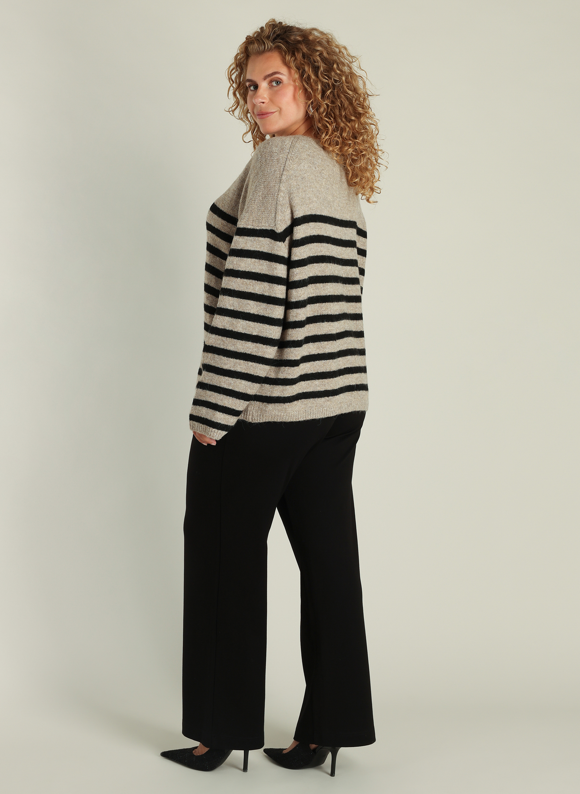 🖤 YEST Curve gebreide trui met streepdessin – black/sand | Grote maten damesmode