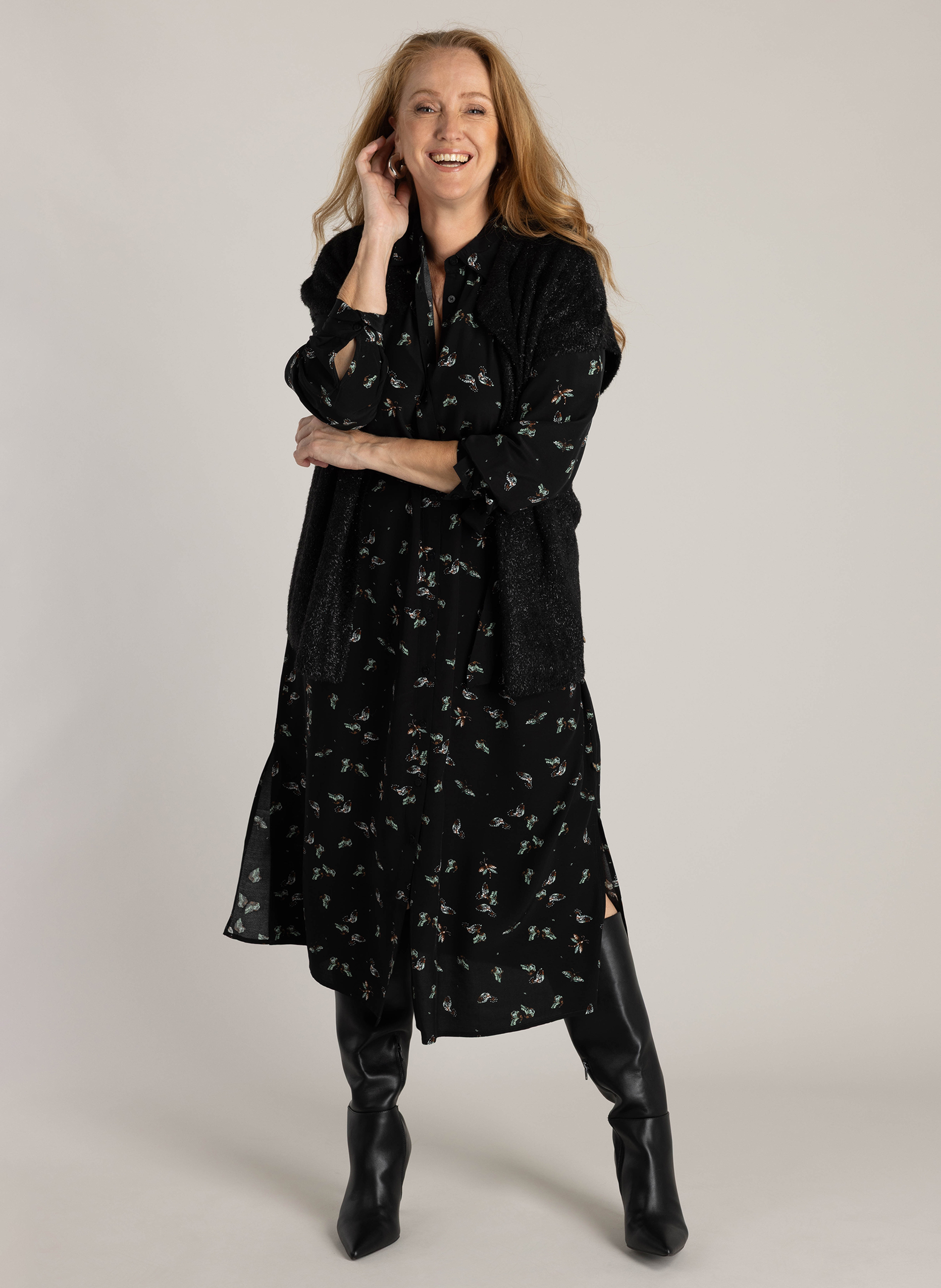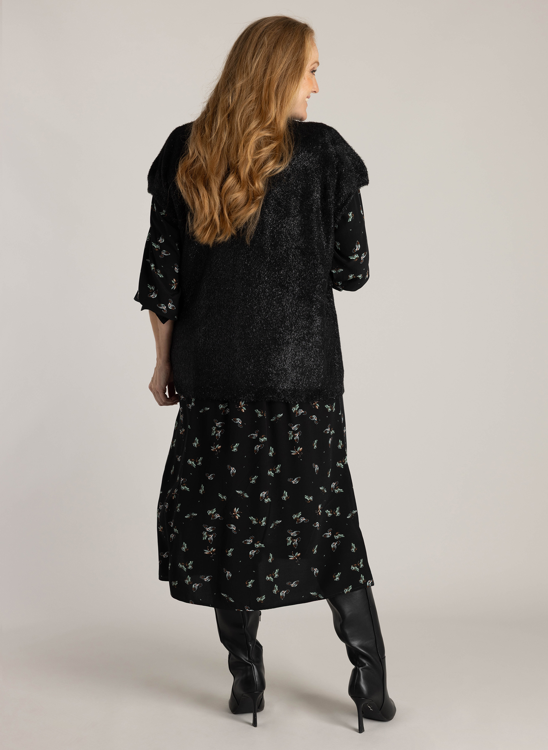 Het model heeft een comfort fit pasvorm en een mouwloze snit, waardoor het vest eenvoudig over andere kledingstukken gedragen kan worden als extra laagje. Met een lengte van 70 cm valt het vest mooi over de heupen en voegt het stijl en beweging toe aan elke outfit. Perfect te combineren met een blouse, top of jurk voor een feestelijke of casual look.