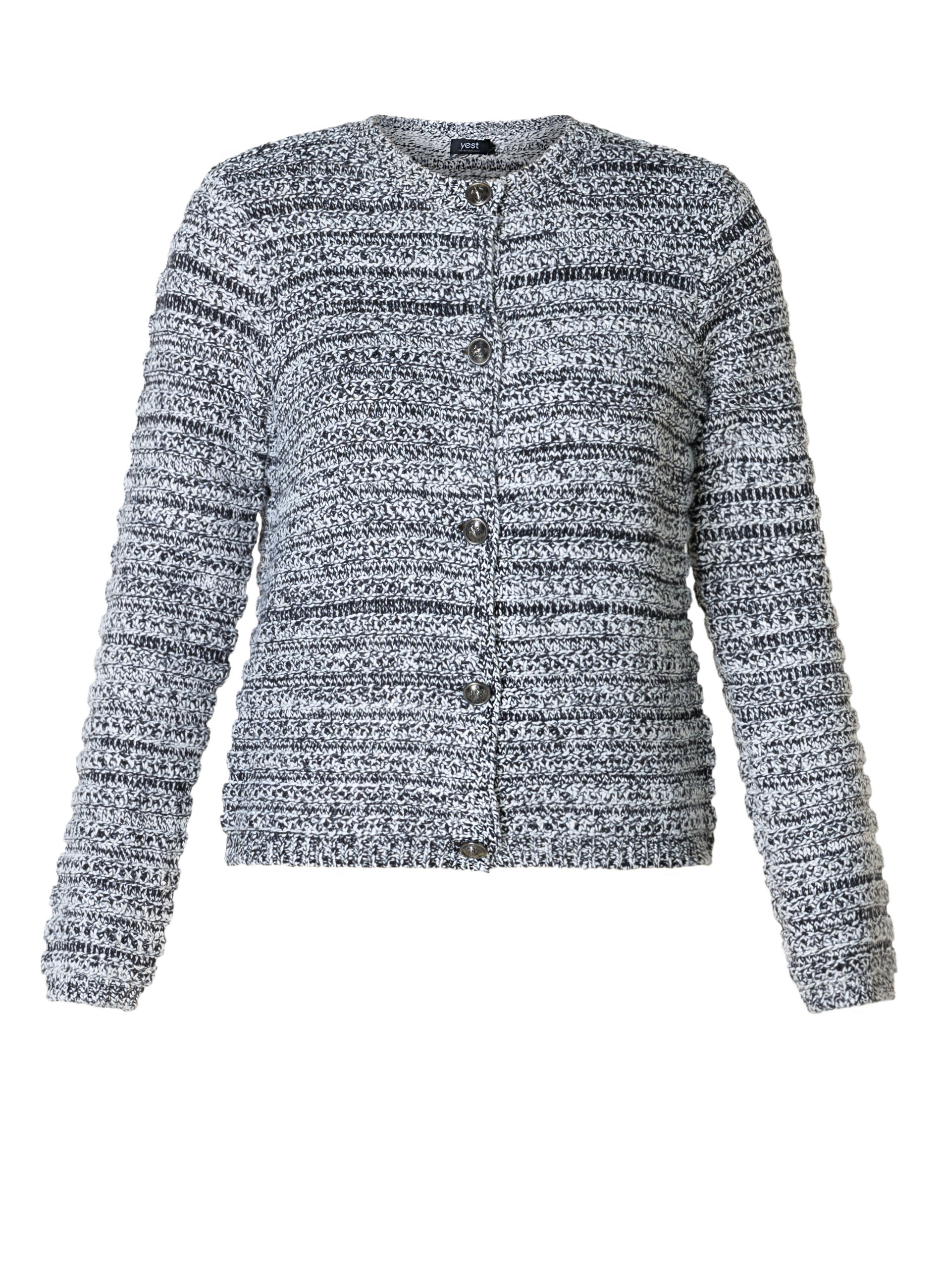 • Kenmerken: Gemêleerd breisel, ronde hals, knoopsluiting, rechte pasvorm