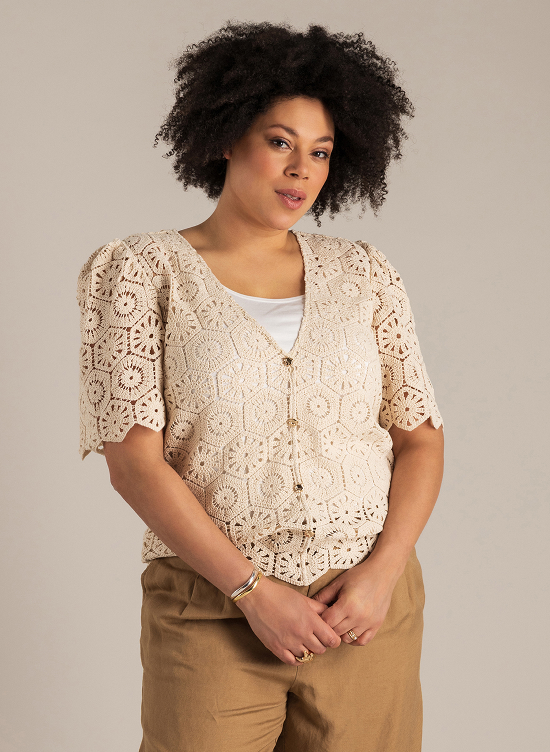 Dit YEST CURVE vest A006313 is een kledingstuk dat je outfit direct leuker maakt. Ben je op zoek naar modieuze grote maten kleding die net even anders is? Dit vest van gehaakt katoen geeft een luchtig effect en staat prachtig als laagje over jouw favoriete top of jurk. De opvallende pofmouwen zorgen voor een vrouwelijk en modern silhouet. De crèmekleur maakt het heel eenvoudig om dit item te combineren met diverse kleuren uit jouw huidige garderobe. Het vest heeft een lengte van 68 centimeter en valt in een reguliere pasvorm. Met de boho geïnspireerde uitstraling voeg je net dat beetje extra stijl toe aan jouw plus size outfit. Dit gebreide vest van YEST CURVE is een comfortabele keuze voor elke dag. Ontdek zelf hoe dit item bijdraagt aan een verzorgde uitstraling.
