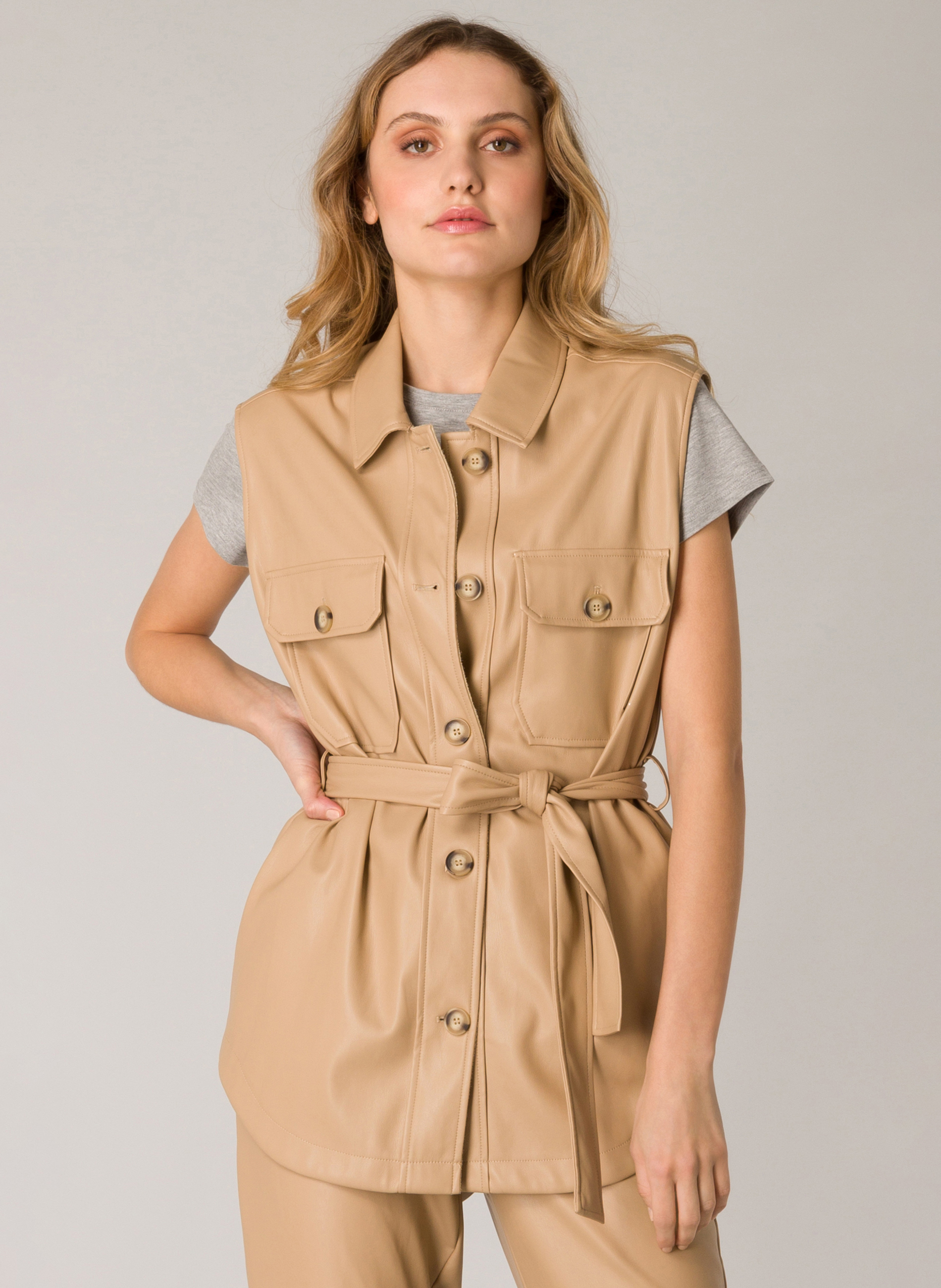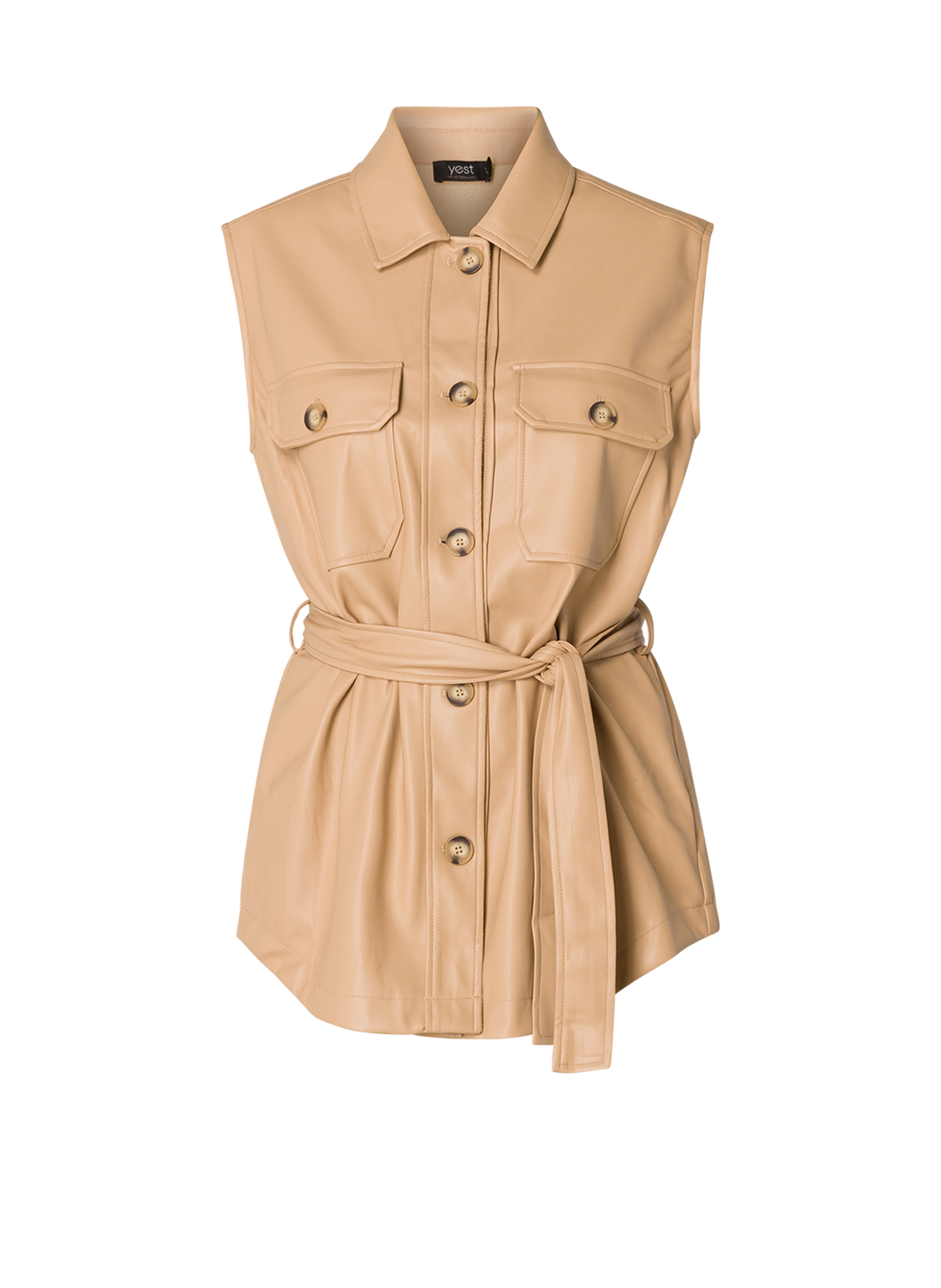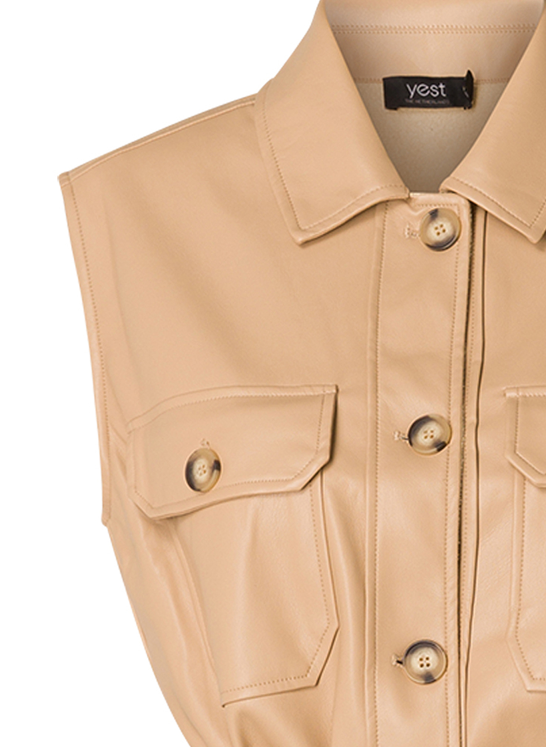 Mouwloos vest van superzacht imitatieleer. Dit item met stoere borstzakken en steekzakken in de zijnaad heeft een ceintuur in dezelfde stof waarmee het vest aangesnoerd kan worden. Tevens leuk om dit mouwloze PU vest open te dragen. Lengte 76 cm.