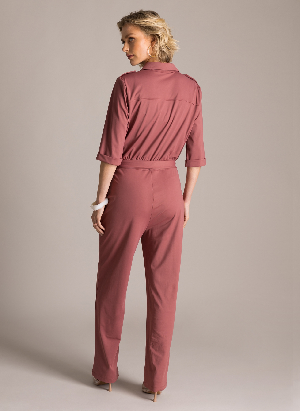 De jumpsuit heeft een normale pasvorm (regular fit) en een binnenbeenlengte van 29 inch. Het ontwerp combineert een stoere uitstraling met vrouwelijke details, zoals de halflange mouwen, de knopenrij aan de voorzijde en de epauletten op de schouders. Dankzij de samenstelling van 75% polyamide en 25% elastaan biedt het pak een optimale pasvorm en veel bewegingsvrijheid. Of u nu een dag naar uw werk gaat of een avondje uit plant, in deze plus size jumpsuit van Bagoes voelt u zich gegarandeerd zelfverzekerd en modieus.
