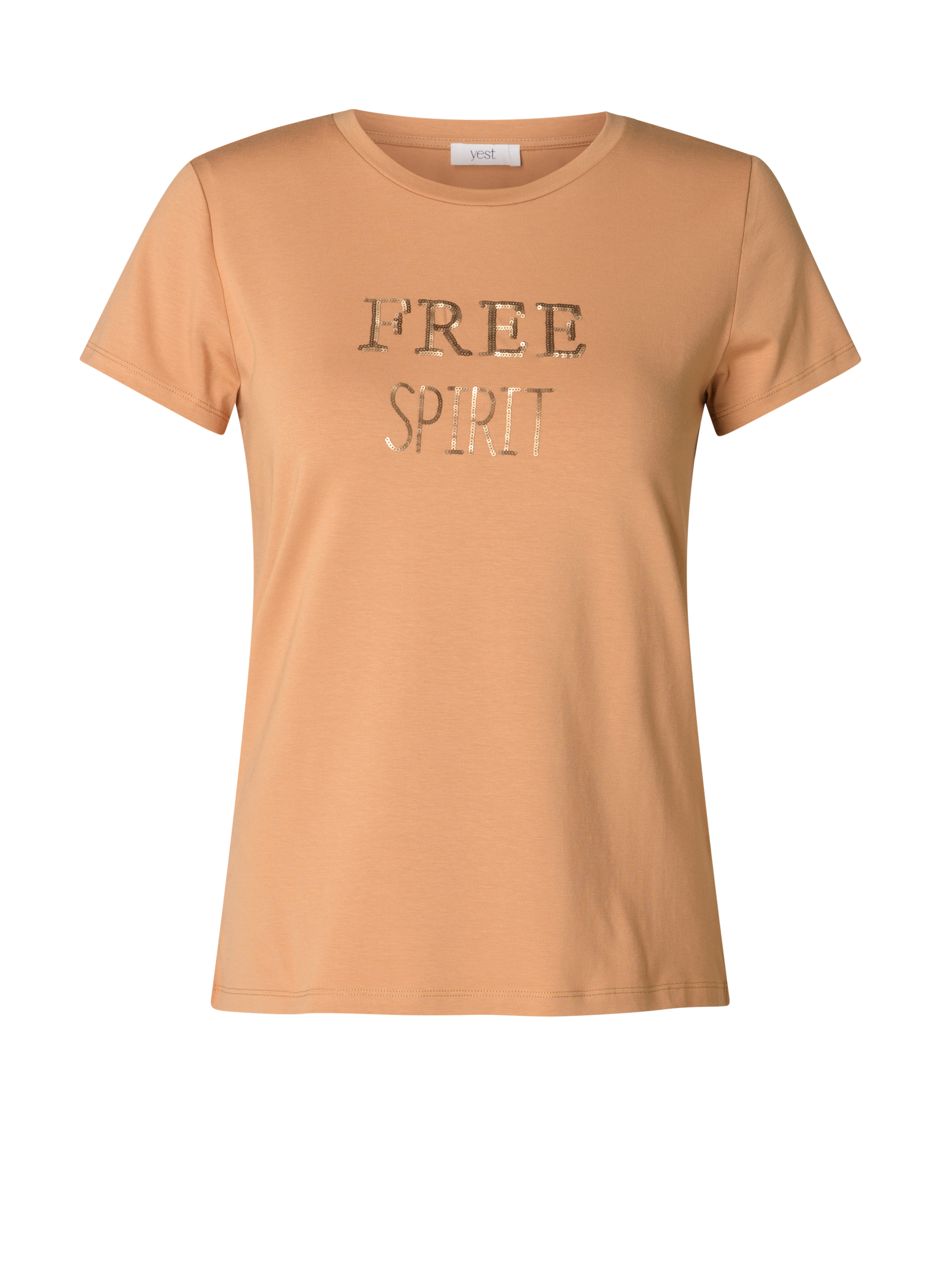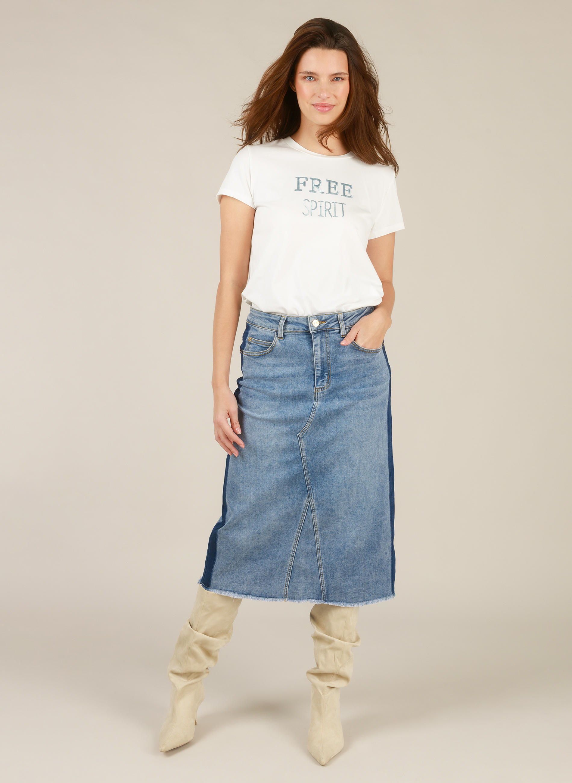 Het T-shirt voelt superzacht aan en is gemaakt van 48% modal, 48% katoen en 4% elastan, wat zorgt voor een lichte stretch en een fijne draagervaring. De ‘Free Spirit’-print geeft een speelse twist aan je outfit en maakt het T-shirt perfect te combineren met verschillende broeken of rokken. Dankzij het veelzijdige ontwerp en de drie beschikbare kleuren is het Gianina Essential T-shirt een favoriet dat je keer op keer uit de kast pakt.