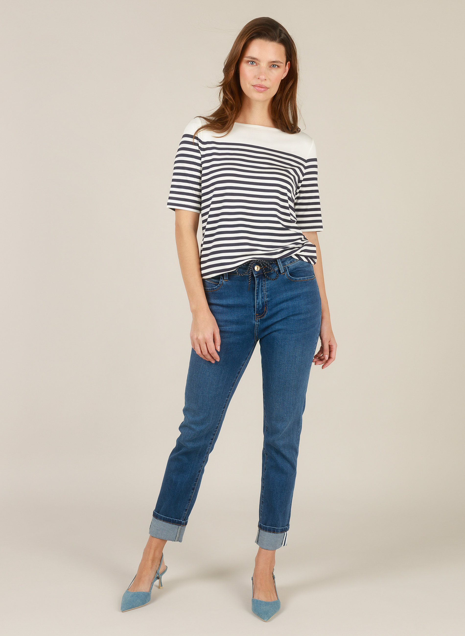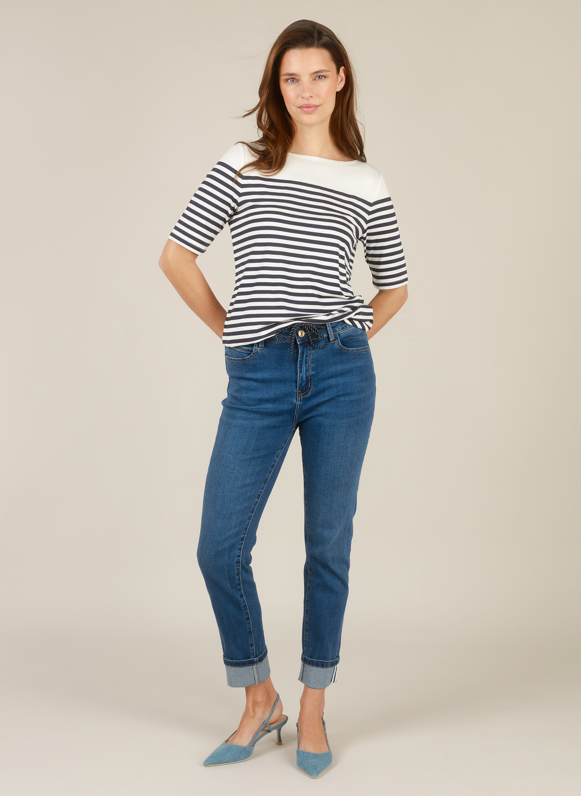 De strepen in off white met navy of pink geven het T-shirt een tijdloze, zomerse uitstraling. De half-lange mouwen en de nette halslijn maken het een veelzijdig kledingstuk dat eenvoudig te combineren is met broeken, rokken of shorts.
