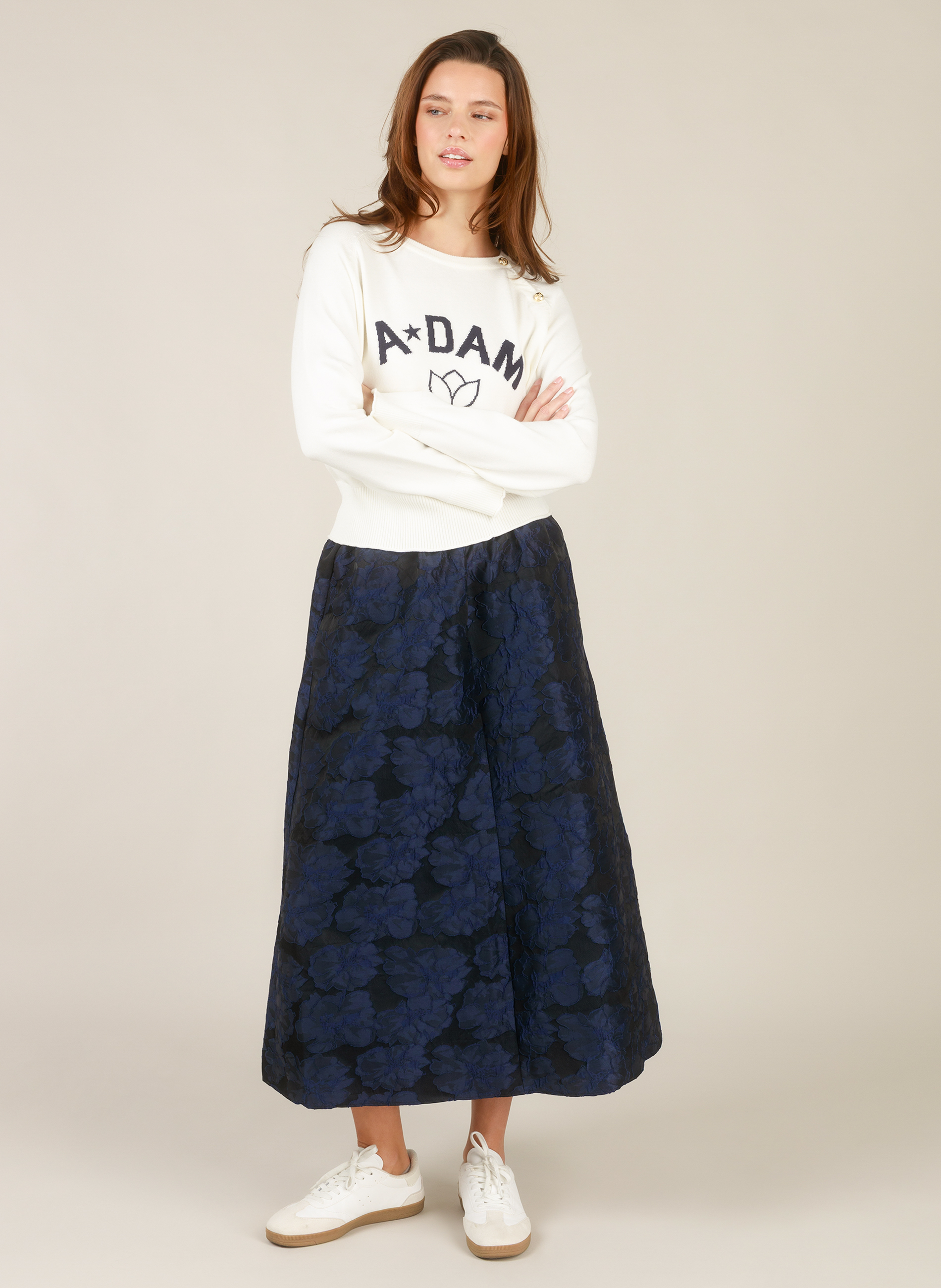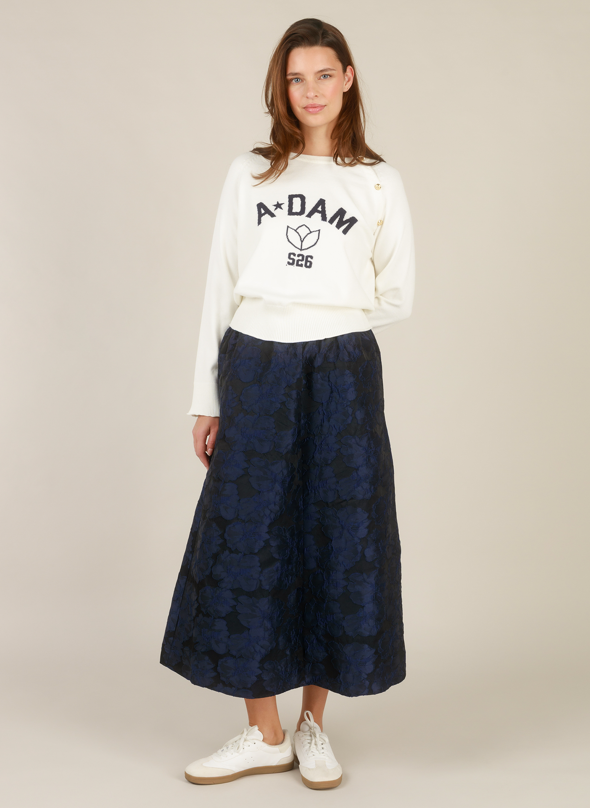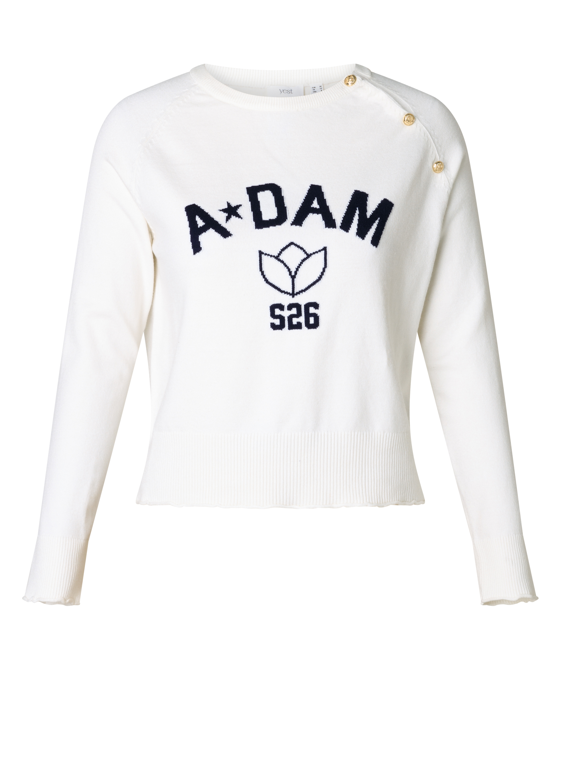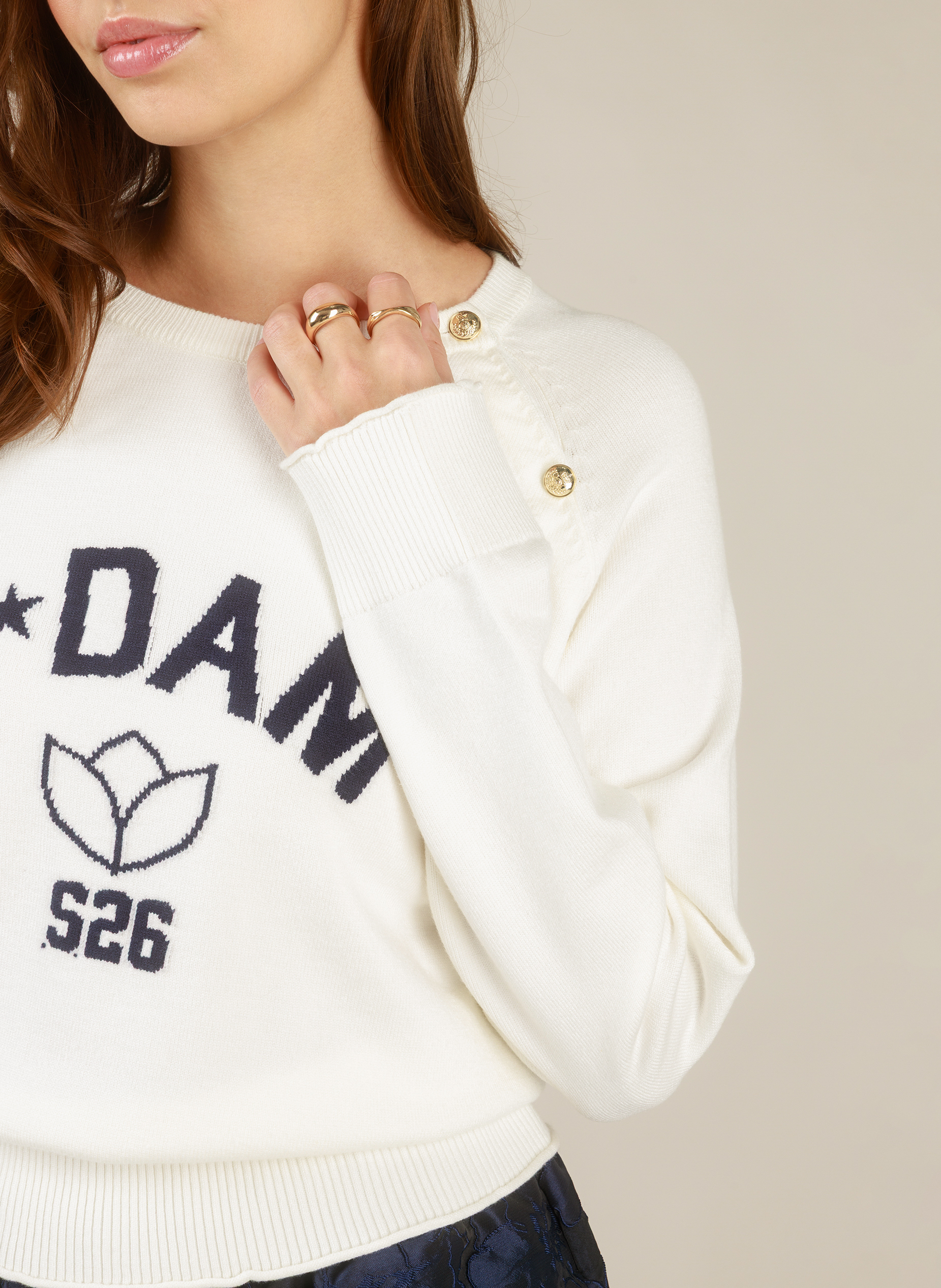 De trui is gemaakt van 50% viscose, 30% polyester en 20% nylon, wat zorgt voor een lichte, soepele kwaliteit en een fijne draagervaring. Het ontwerp heeft een sportief karakter door het grote logo op de borst, terwijl de gouden schouderknopen een verfijnd detail toevoegen. Deze combinatie van comfort en stijl maakt de Isotta trui een veelzijdig item dat je eenvoudig kunt combineren met andere broeken of rokken uit de collectie van Bagoes.