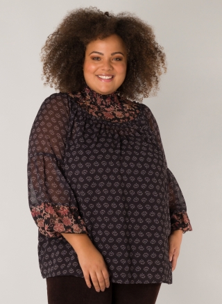 Transparante blouse met een mooie bloemenprint, een ronde pas met aangerimpelde panden en pofmouwen met elastiek. De opstaande kraag is gesmockt en sluit achter met een knoopje. Voorzien van een binnentop met spaghettibandjes. De Djaira van YESTA heeft een Comfort Fit en is gemaakt van 100% Recycled Polyester. Deze blouse is verkrijgbaar in Black/Multi-Colour. De mooiste blouses vindt je in de categorie grote maten blouses.