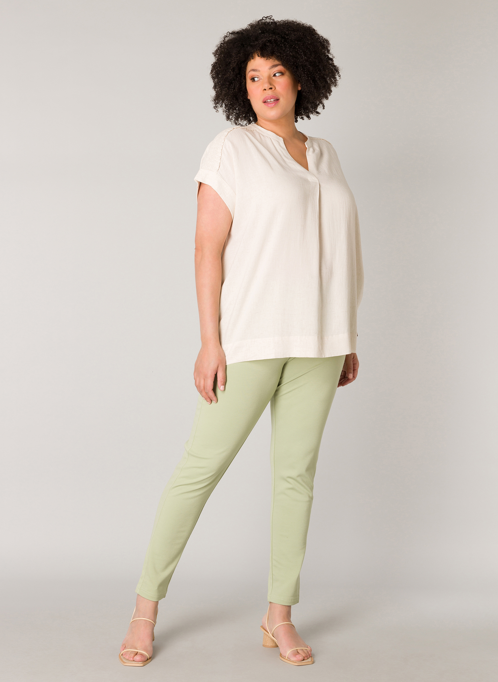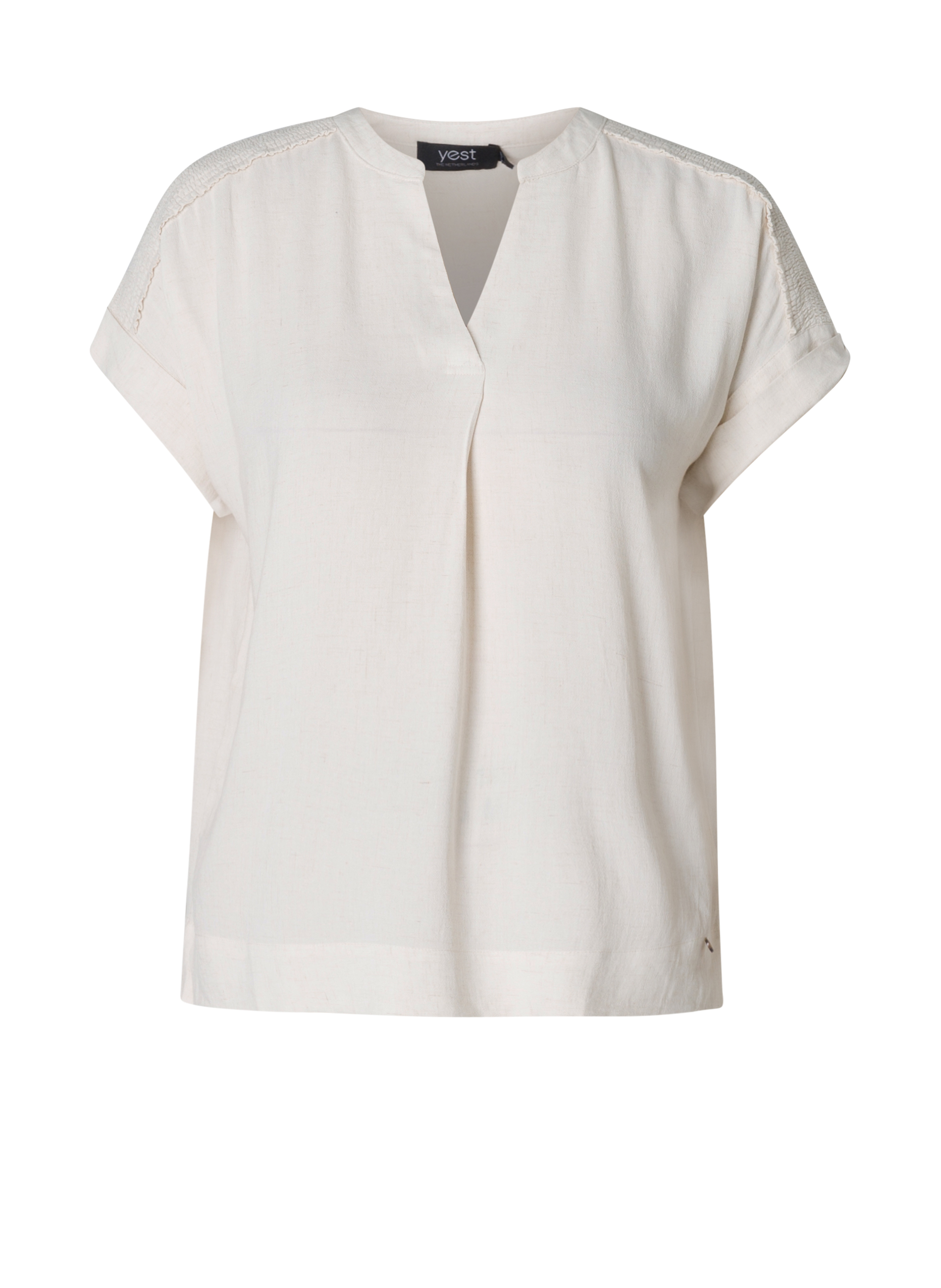 Linnen blouse van Yesta met een ronde halslijn die overloopt in een V-lijn. De blouse met korte aangeknipte mouwen heeft een mooie melange linnen kleur. Op de schouders een smock inzet. De Jalou is 74 cm lang. Verkrijgbaar in de kleur light beige melange. De mooiste blouses vindt je in de categorie grote maten blouses.