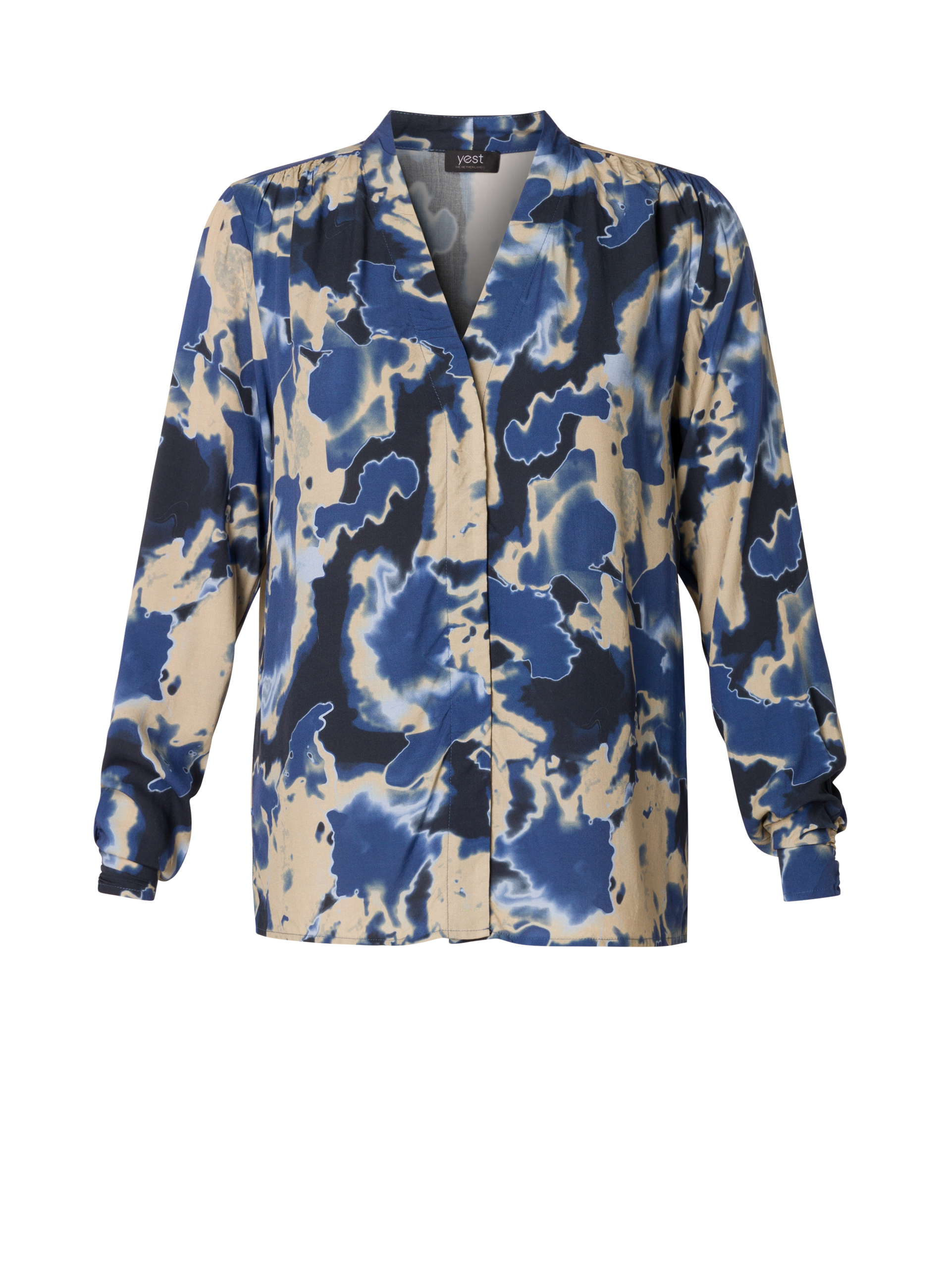 Blouse met een allover print in blauw-sand kleuren. Deze Yesta blouse van soepele viscose heeft een lage V-hals en sluit met knoopjes. Op de schouderlijn kleine plooitjes voor een comfortabele fit. De Raldy is 73 cm lang. De mooiste blouses vindt je in de categorie grote maten blouses.