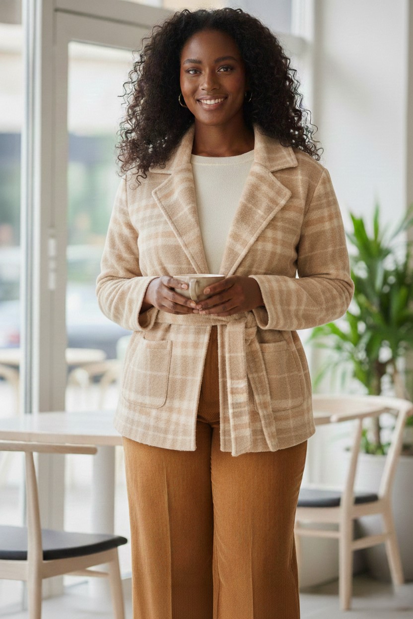 Dit jasje van Yesta is gemaakt van zachte geruite dekenstof en beschikt over een sjaalkraag en een bijpassende ceintuur voor een elegante uitstraling. Aan de voorkant zijn twee handige zakken toegevoegd voor extra functionaliteit. De Will is 72 cm lang. De mooiste jasjes vind je in de categorie grote maten jasjes.