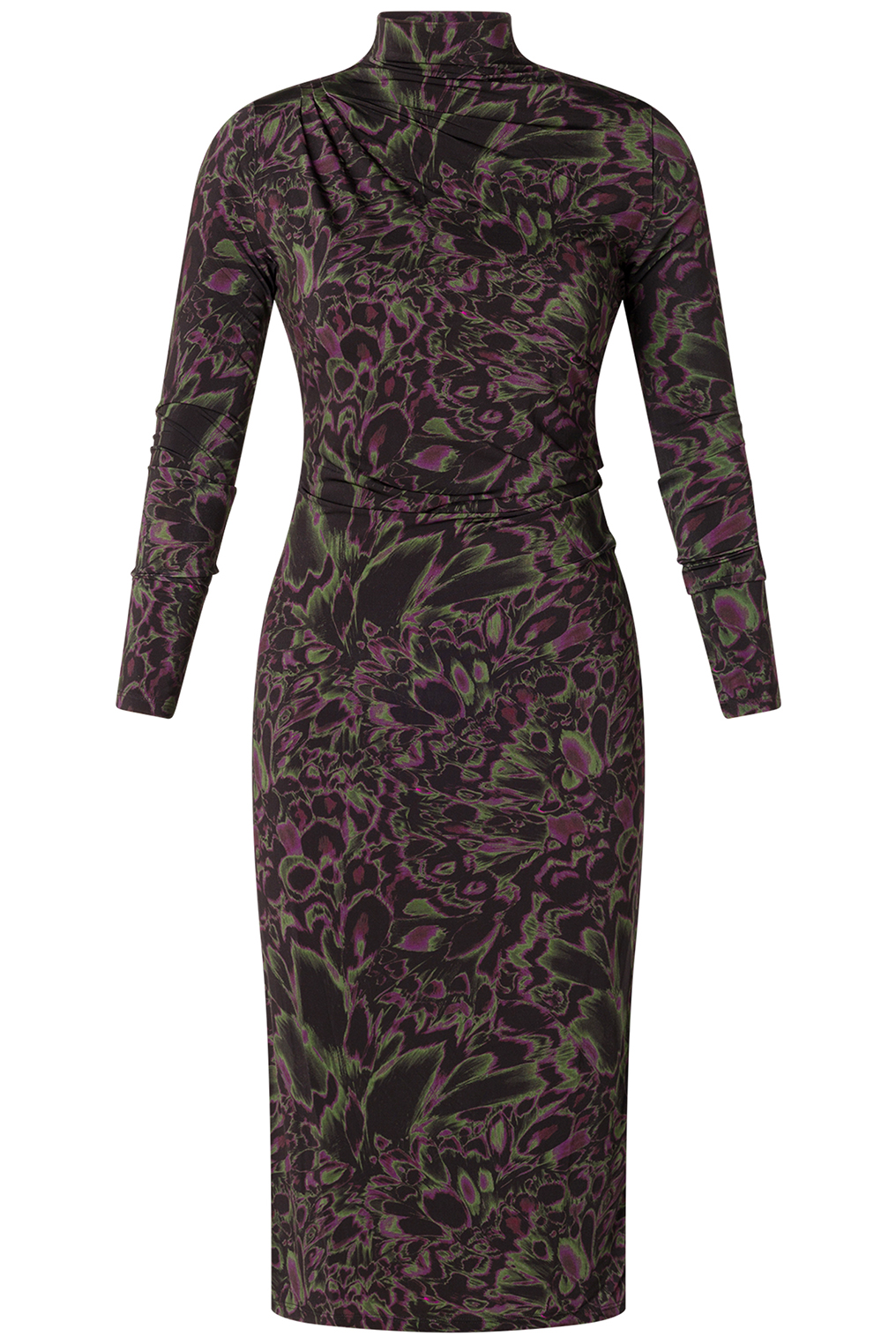 Deze gladde Yesta jurk, met een zwart-groen-paarse print, is een aansluitend kledingstuk dat wordt gekenmerkt door een turtle neck. Aan één kant van de zijnaad zijn subtiele plooien aangebracht voor een verfijnd en flatterend effect. Bekijk al onze jurken in de categorie grote maten jurken.