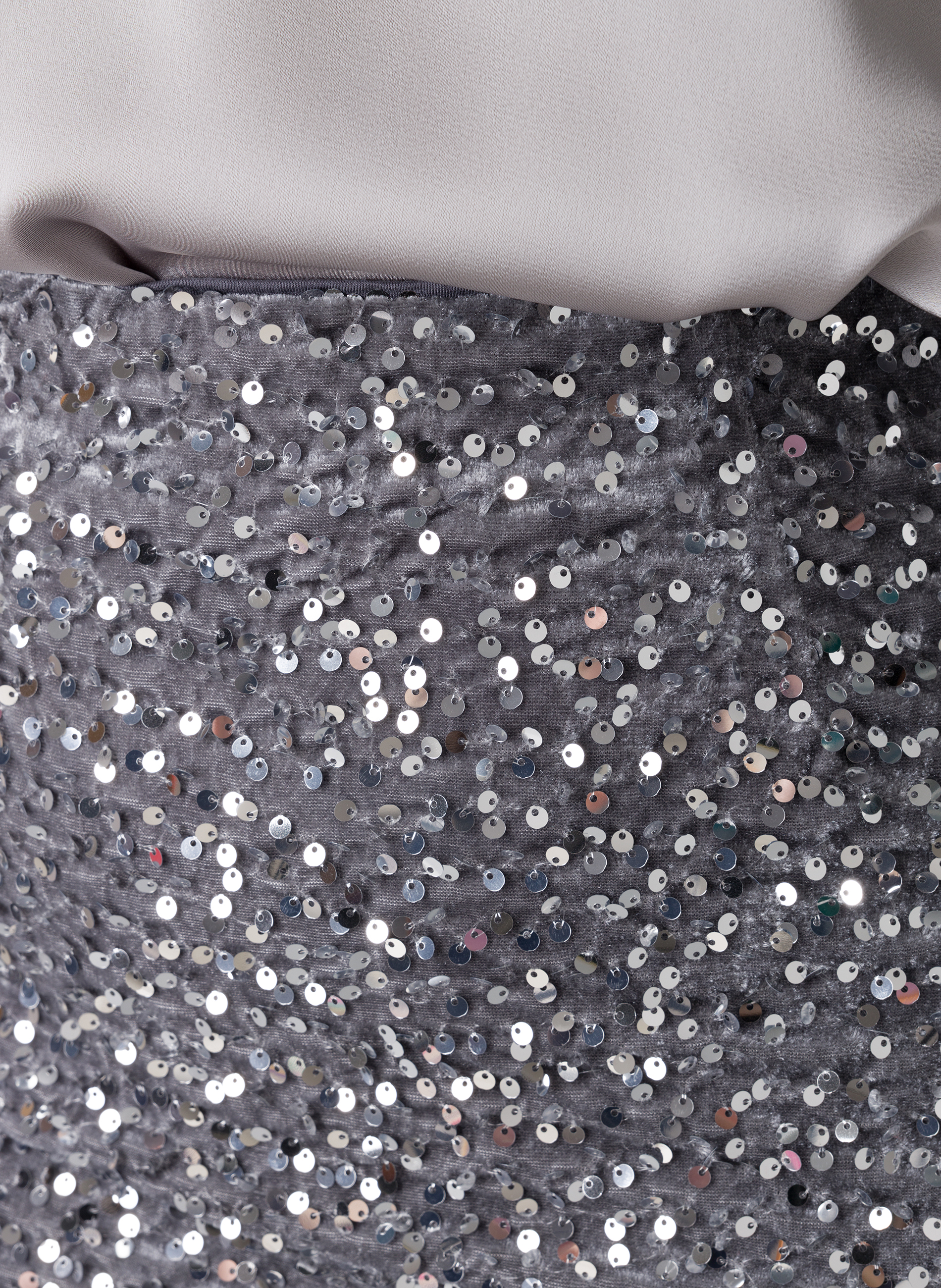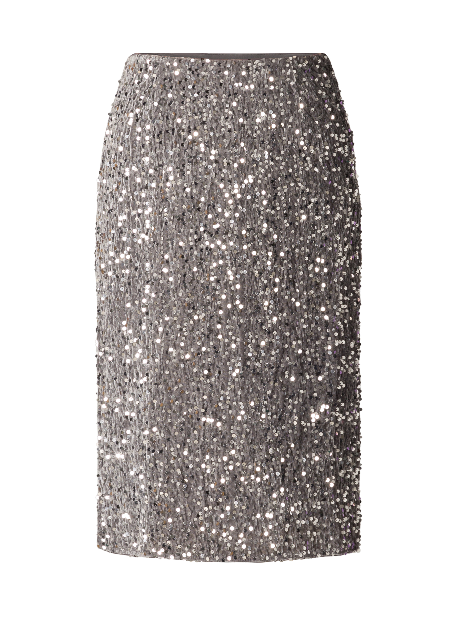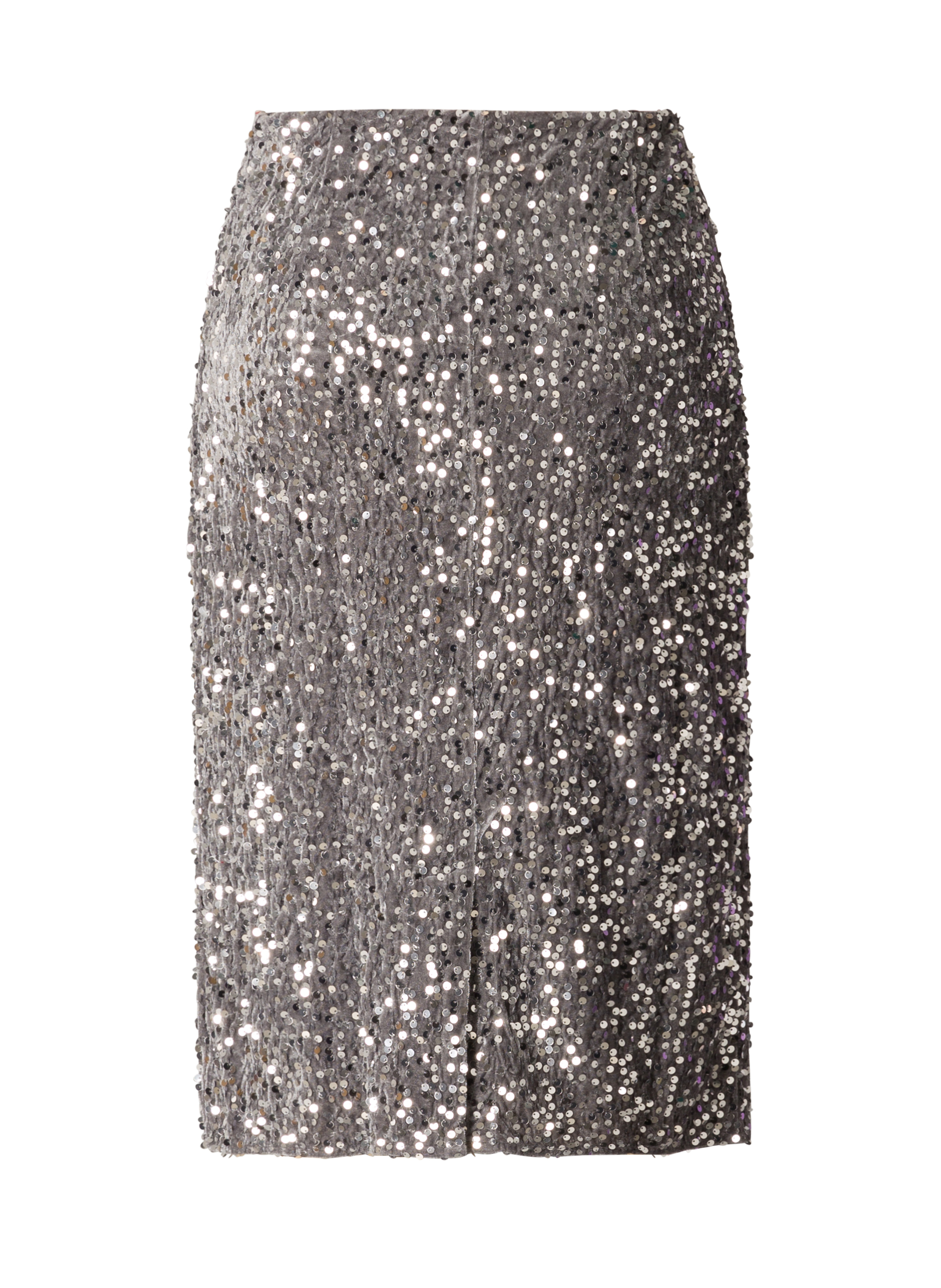 Voeg een vleugje glamour toe aan je garderobe met deze rok uit de partycollectie van Yesta. De velvet jersey stof, versierd met pailletten, zorgt voor een feestelijke uitstraling. Beschikbaar in grijs en zwart. De lengte van de rok is 70 cm (maat 38). De Thirza is 72 cm lang. Was een artikel met pailletten altijd voorzichtig met de hand.