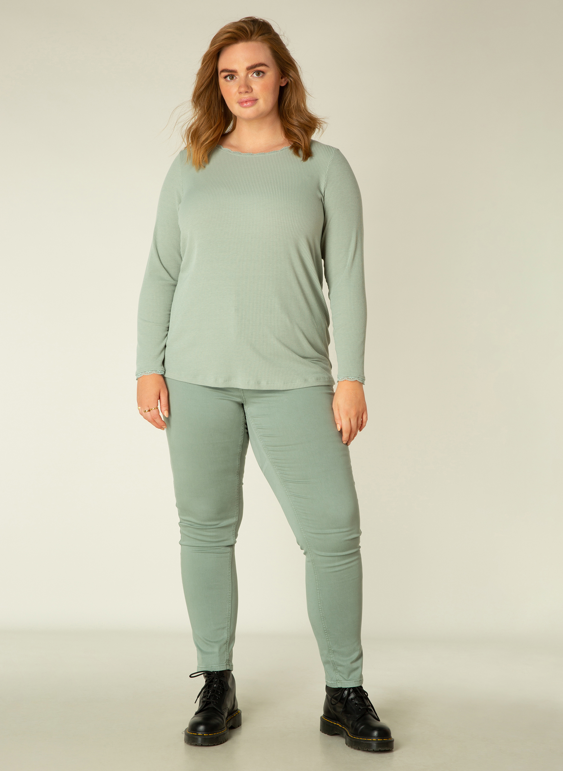 Shirt Bertina van Yesta is gemaakt in een tricot rib breisel van een zachte kwaliteit. Langs de ronde hals en aan de onderkant van de mouwen zit een klein kanten randje. Het shirt is een slimfit model. Het shirt is verkrijgbaar in twee verschillende groene kleuren, een lichte en een donkere groen. Hij heeft een lengte van 74 cm bij maat 2. Het model draagt op de foto jurk Berfin (A002519) en broek Mella (A002187). Bekijk al onze grote maten shirts.