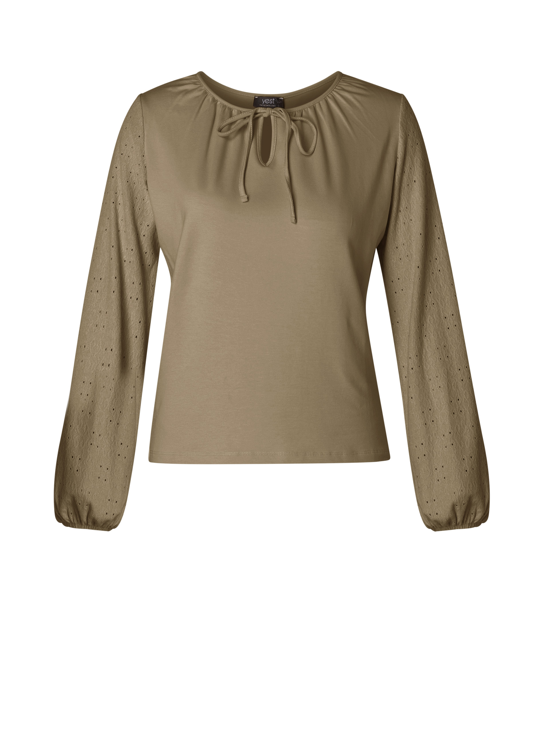 Damestop met een wijde ronde halslijn met een koordje. De lange wijde mouwen hebben een jacquard breisel en elastiek in de boord. Langs de halslijn kleine plooitjes. De Bettine van YESTA heeft een Regular Fit en is gemaakt van 48% Modal, 48% Katoen en 4% Elastaan. Dit jersey shirt is verkrijgbaar in Cream en Soft Army. ​Je vindt meer shirts in de categorie grote maten shirts.