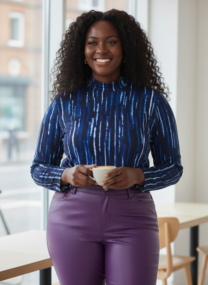Longsleeve van Yesta met een blauw dessin. Dit model met een slim fit heeft een turtle nek en lange mouwen. ​​De Verani Essential is 74 cm lang. Je vindt al onze shirts in de categorie grote maten shirts.