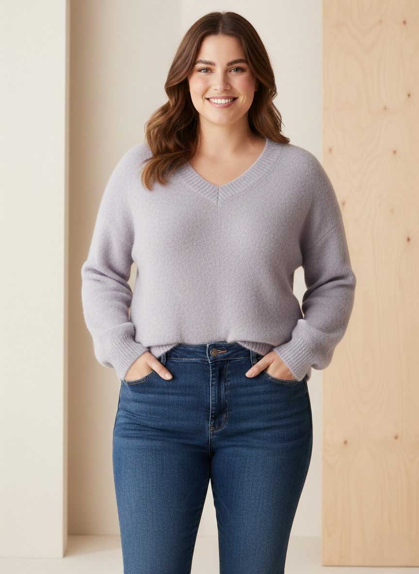 Deze zachte, grote warme Yesta trui met V-hals is perfect voor de koude dagen. De geribde boorden langs de hals, mouwen en onderkant zorgen voor een luxe afwerking en extra warmte. Ideaal om te combineren met je favoriete jeans of leggings voor een stijlvolle, cozy look! Verkrijgbaar in Grey Melange en Dark Blue. De Tatum is 70 cm lang.