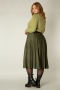 Trui Vesa van Yesta heeft een diepere V hals met een kort knooppad. De lange mouw heeft een kleine ruche randje. De trui is gebreid in een smal ribje, dus heeft veel rek. Het Yesta model draagt hieronder het shirt A002077 en de rok A002017.