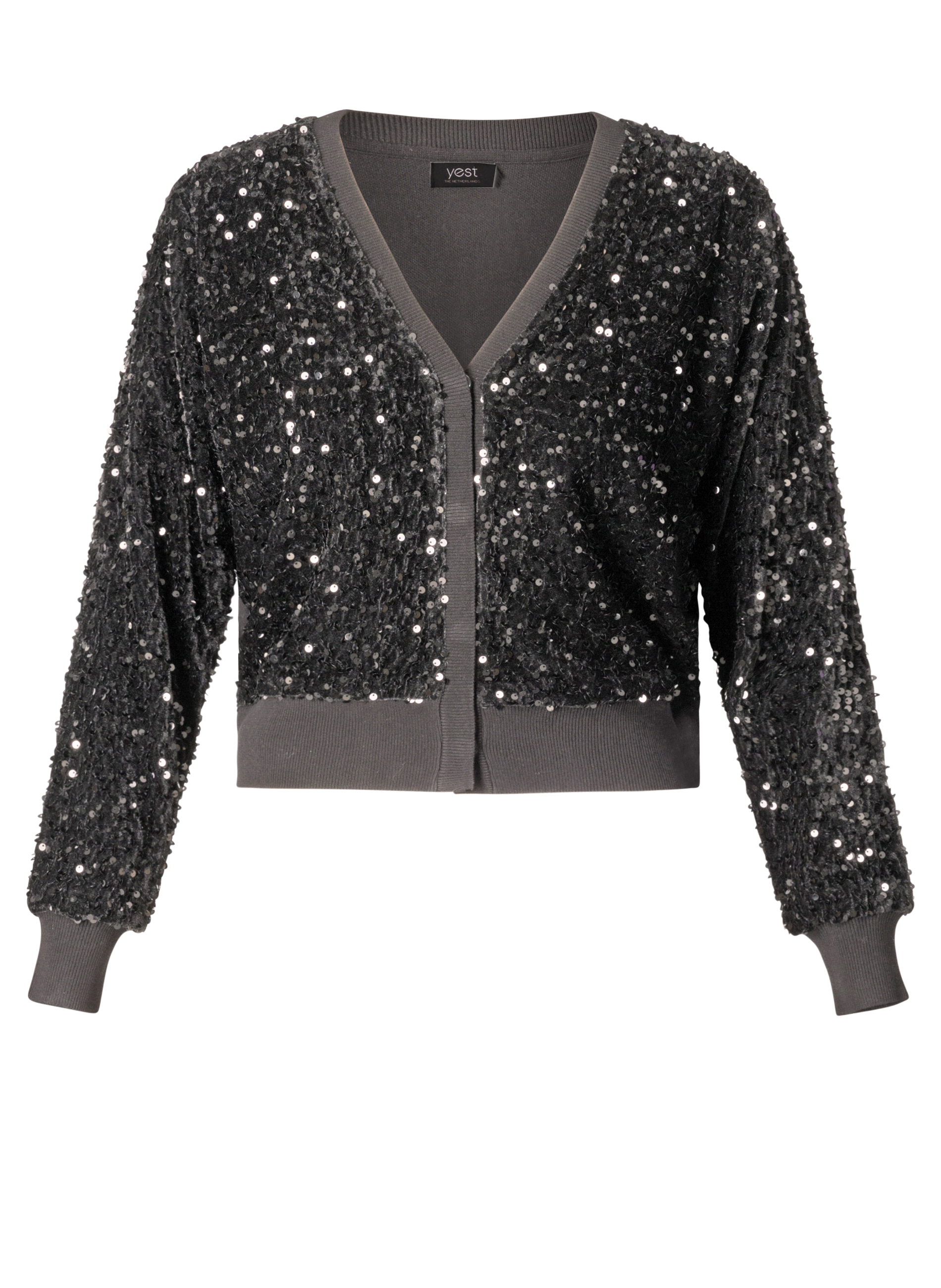 Voeg wat glans toe aan je feestoutfits met dit zwarte gebreide vestje. De knopen en glinsterende pailletten aan de voorzijde en op de mouwen maken het een opvallend stuk, terwijl de zachte voering ervoor zorgt dat je je comfortabel voelt zonder irritatie. Ideaal voor de feestdagen