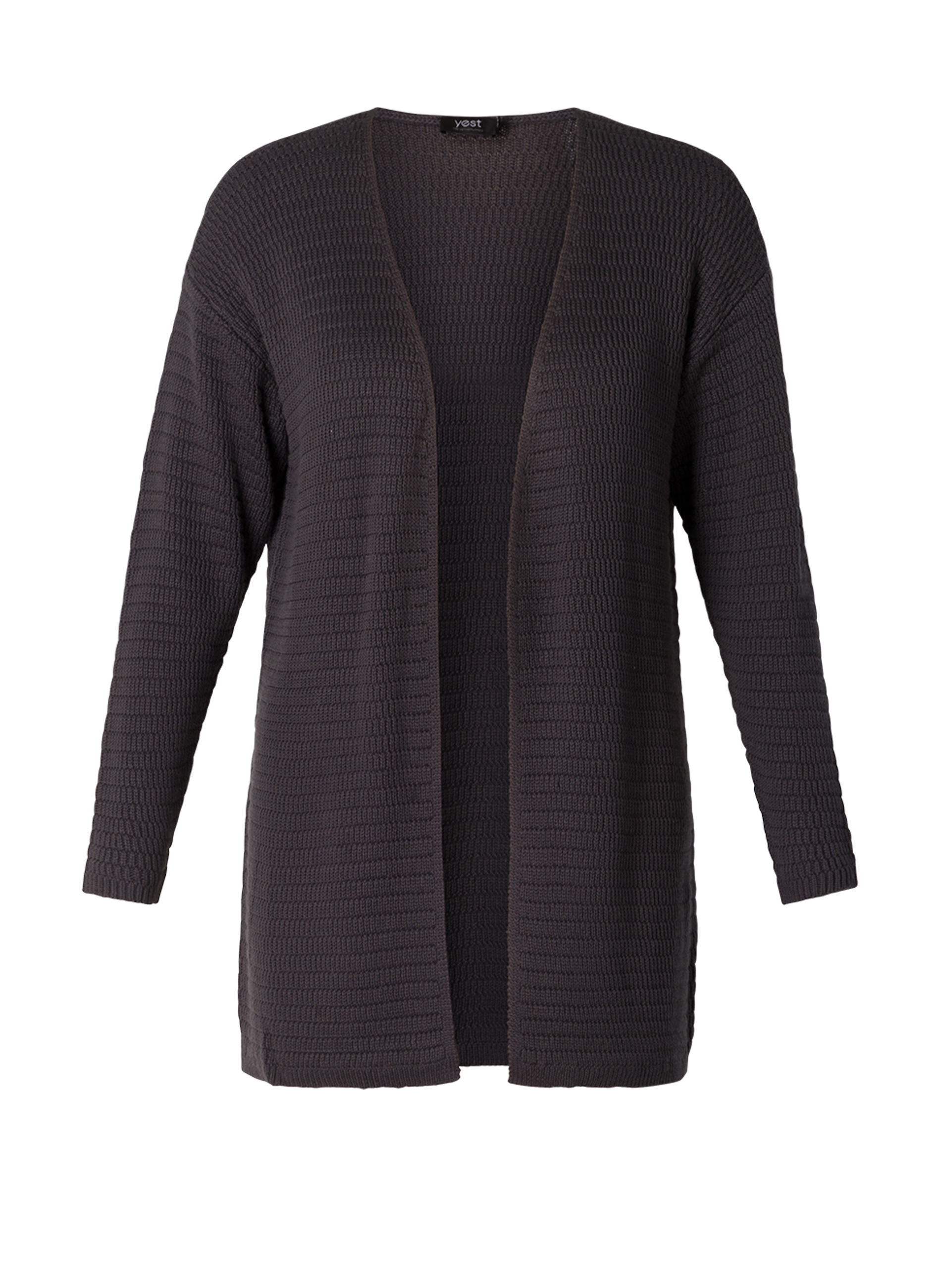 YESTA vest Valeriya Essential  is een mooie basismodel, hij heeft geen sluiting en zakken. In het breisel zit een streep brei effect. Hij heeft een lengte van 83 cm bij maat 2.