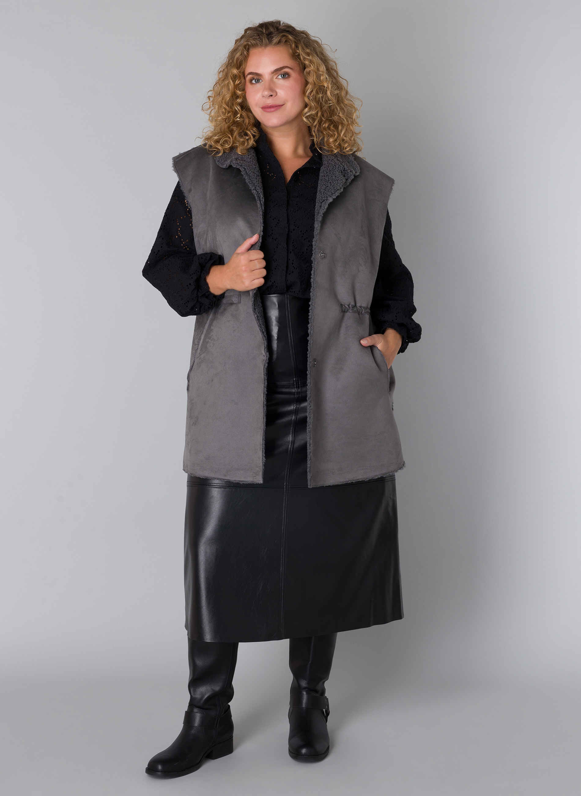 Deze lange teddy bodywarmer van Yesta biedt ultiem comfort en warmte. Het reversible design maakt de Wynona Essential veelzijdig: draag de zachte teddyzijde of keer hem om naar de suedine kant voor een strakke look. Met een drawstring in de taille voor een flatterende pasvorm. Verkrijgbaar in de kleuren zwart en donkergrijs. Lengte 90 cm.